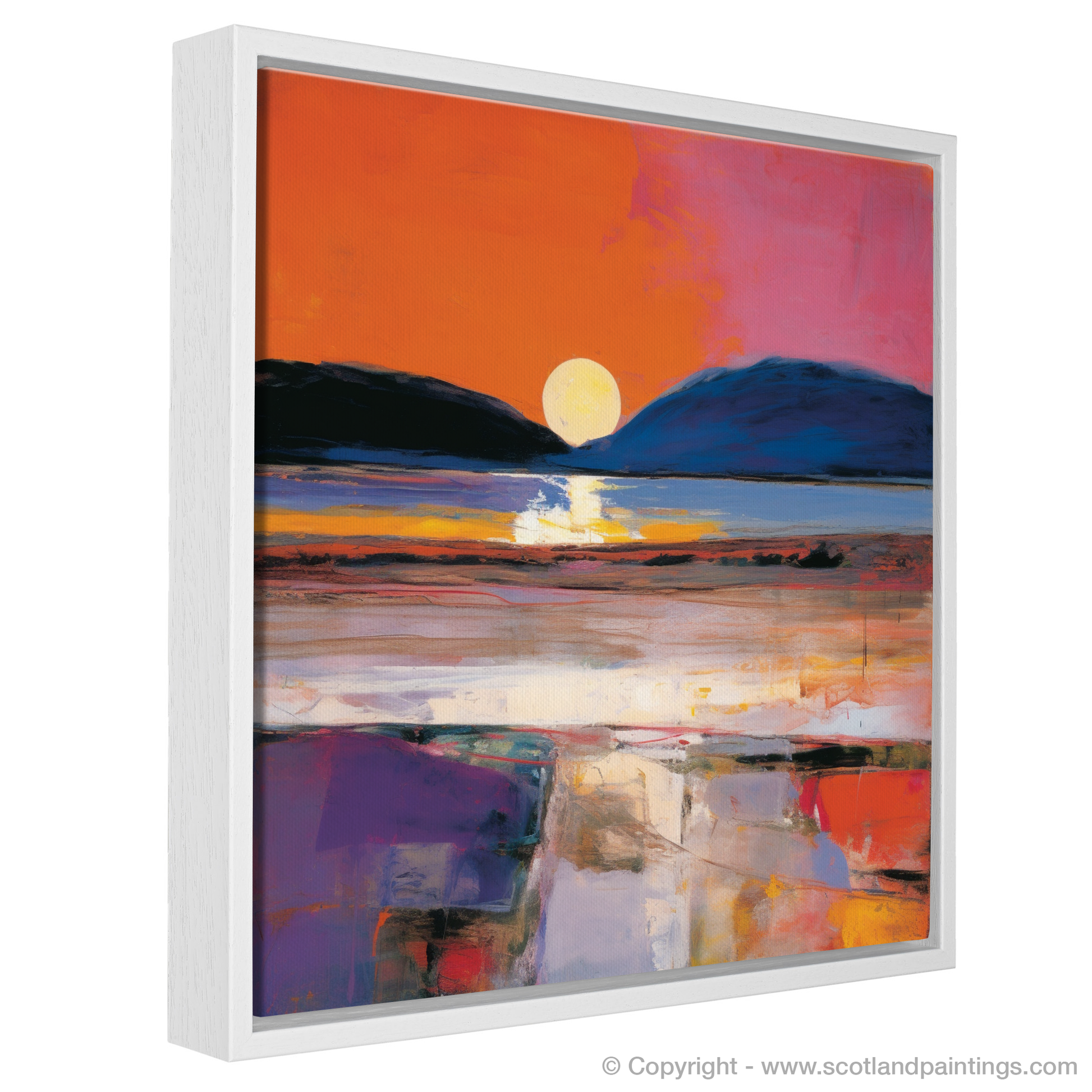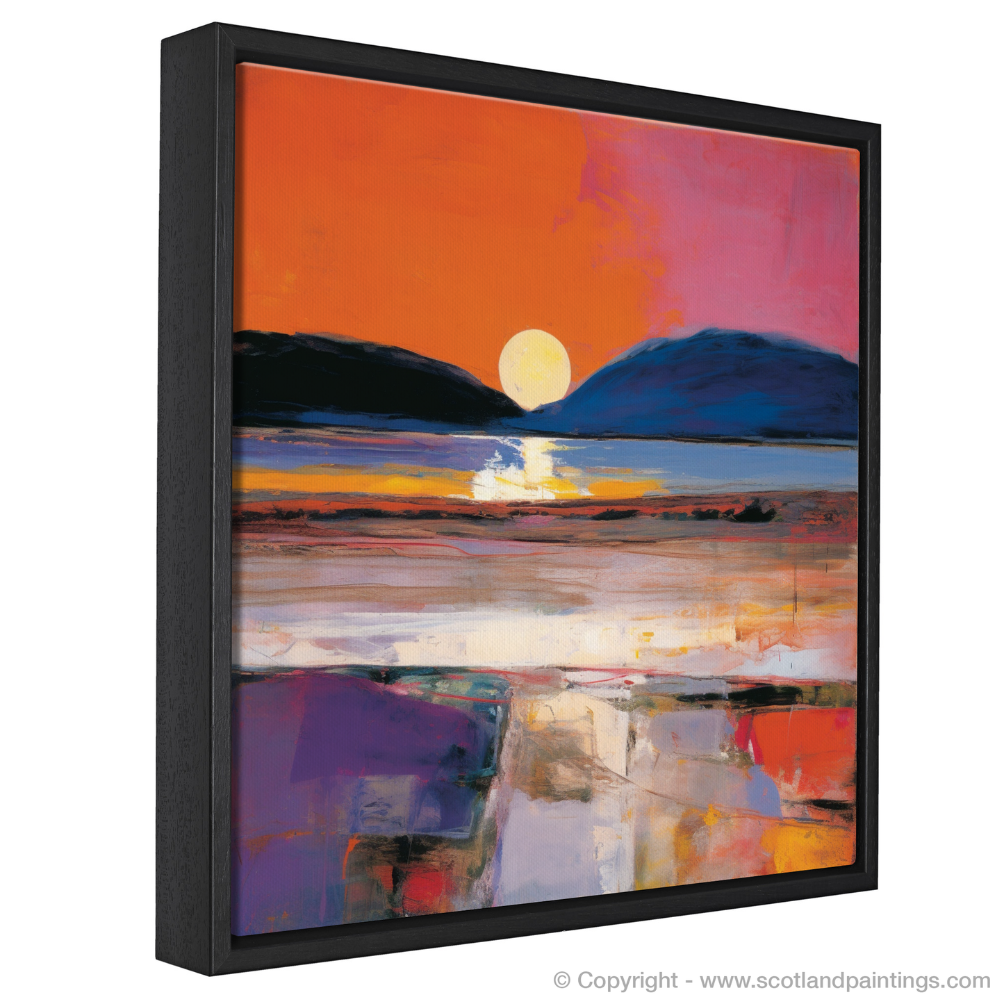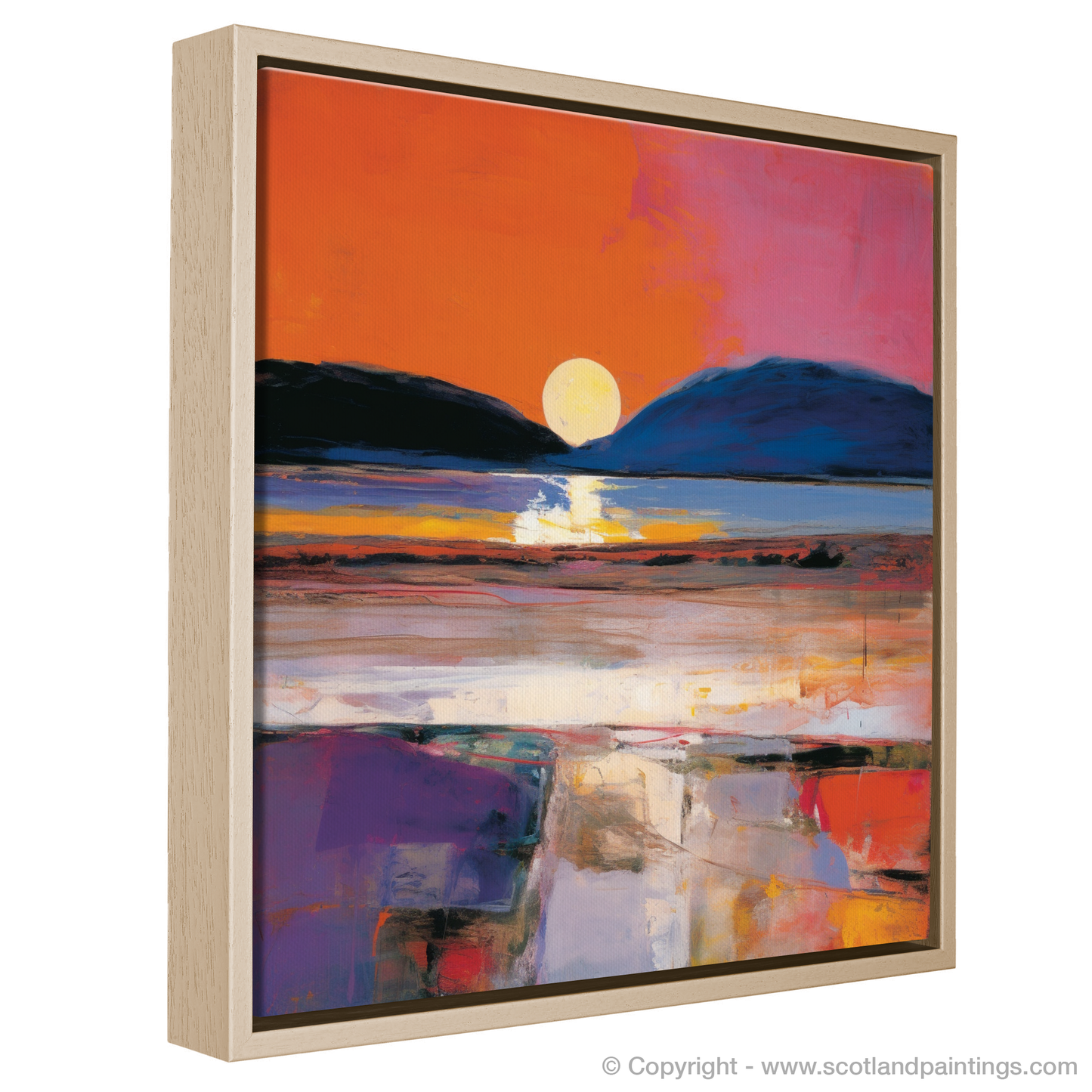 Immerse yourself in the vibrant splendour of a Scottish cove at the day's end with this captivating print. Evoking the serene yet dynamic atmosphere of Traigh Mhor, the artist employs a bold fusion of hues, reflecting the fiery descent of the sun below the horizon. An ethereal orb of soft yellow, the setting sun is mirrored on the water's surface, presenting a stark contrast against the deepening shades of the night sky.