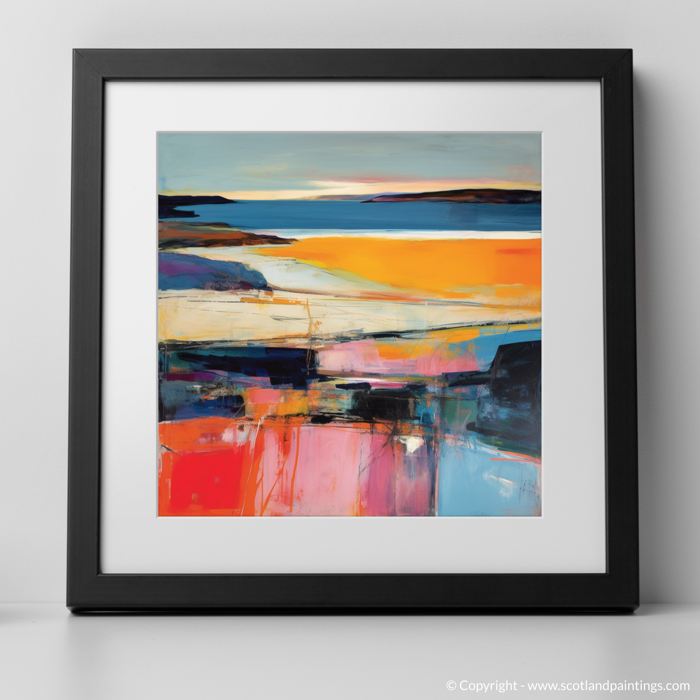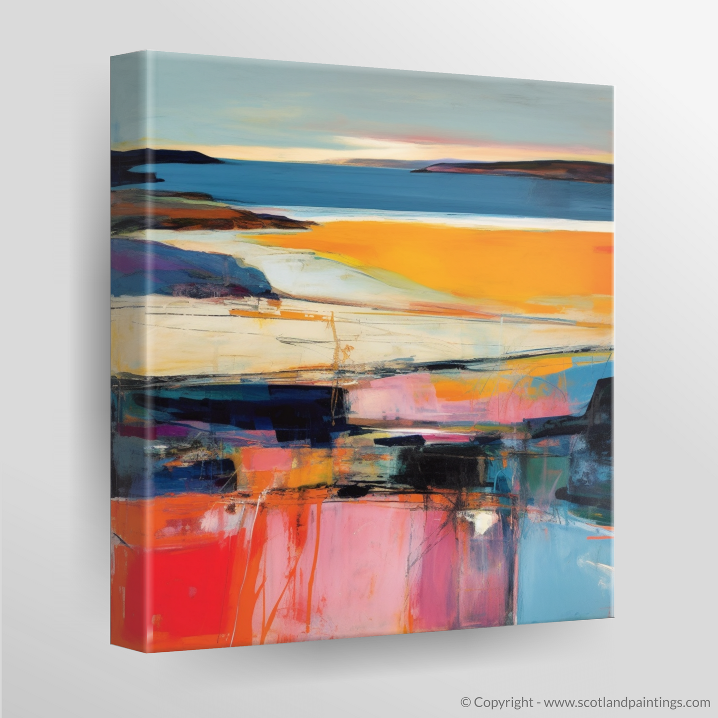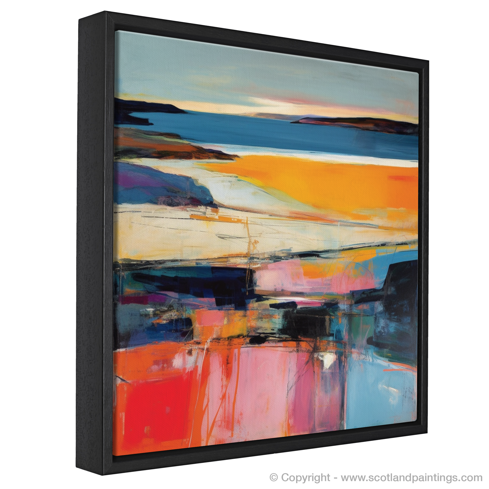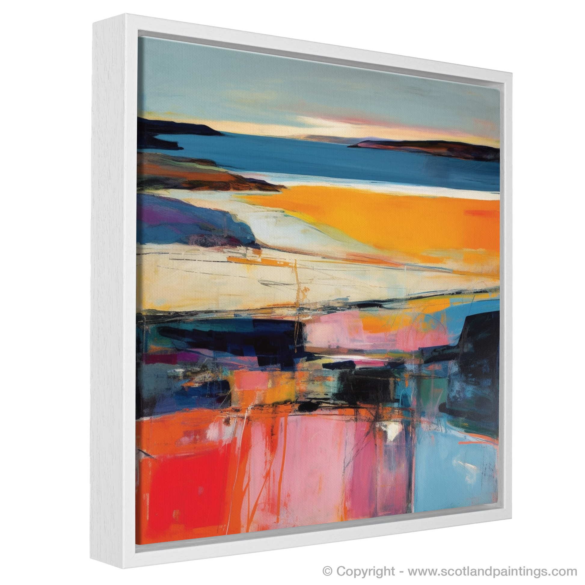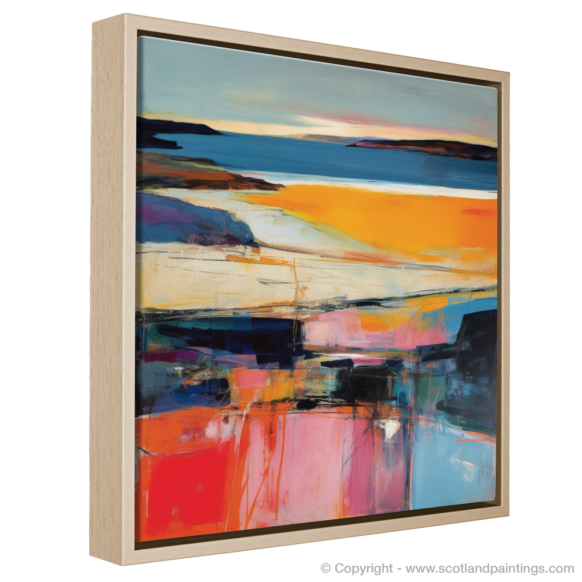 This evocative representation of Traigh Mhor is a testament to the serene beauty found within Scotland's coved landscapes, making it a perfect piece for those who wish to bring the quintessence of Scottish natural splendour into their living space. It is a dialogue of colour and form that captures the fleeting magic of sunset, permanently etched into the memory of canvas—an abstract homage to the dance of evening light upon the tranquil Scottish bays.