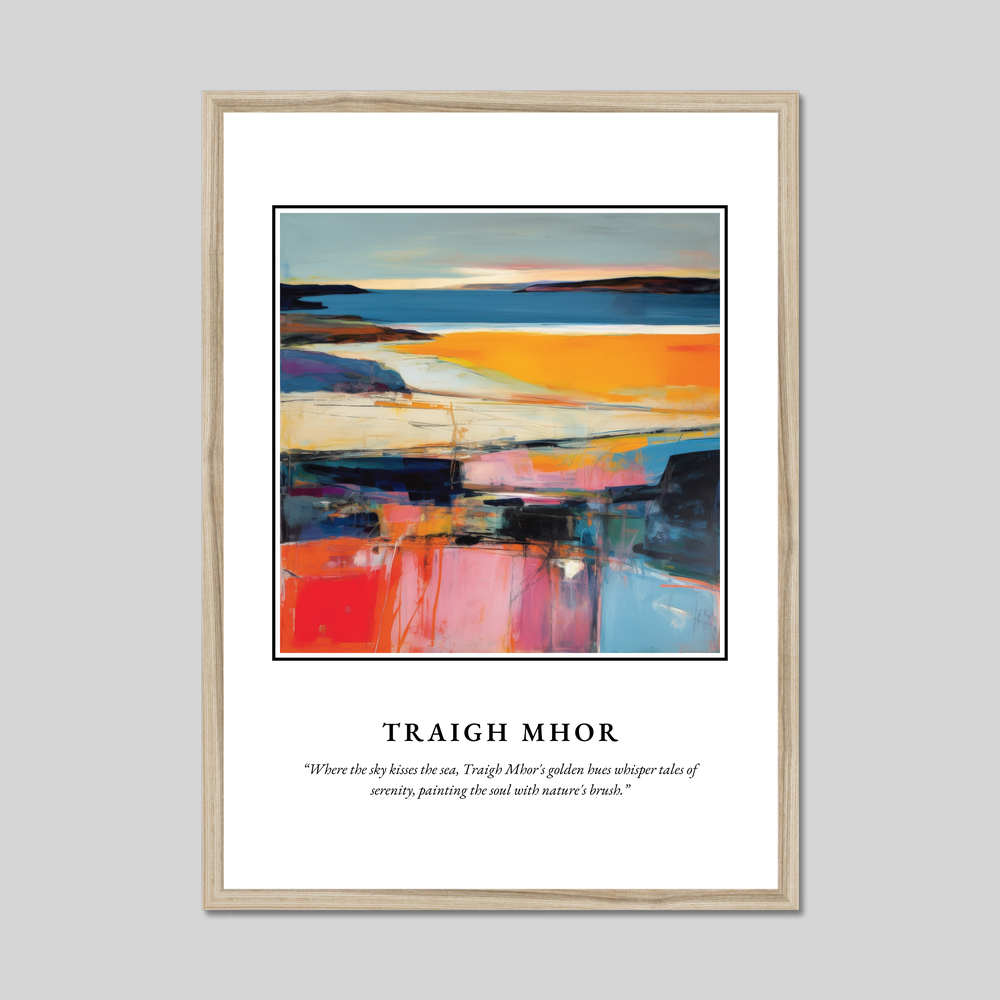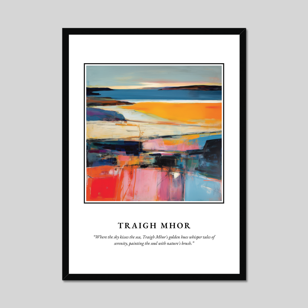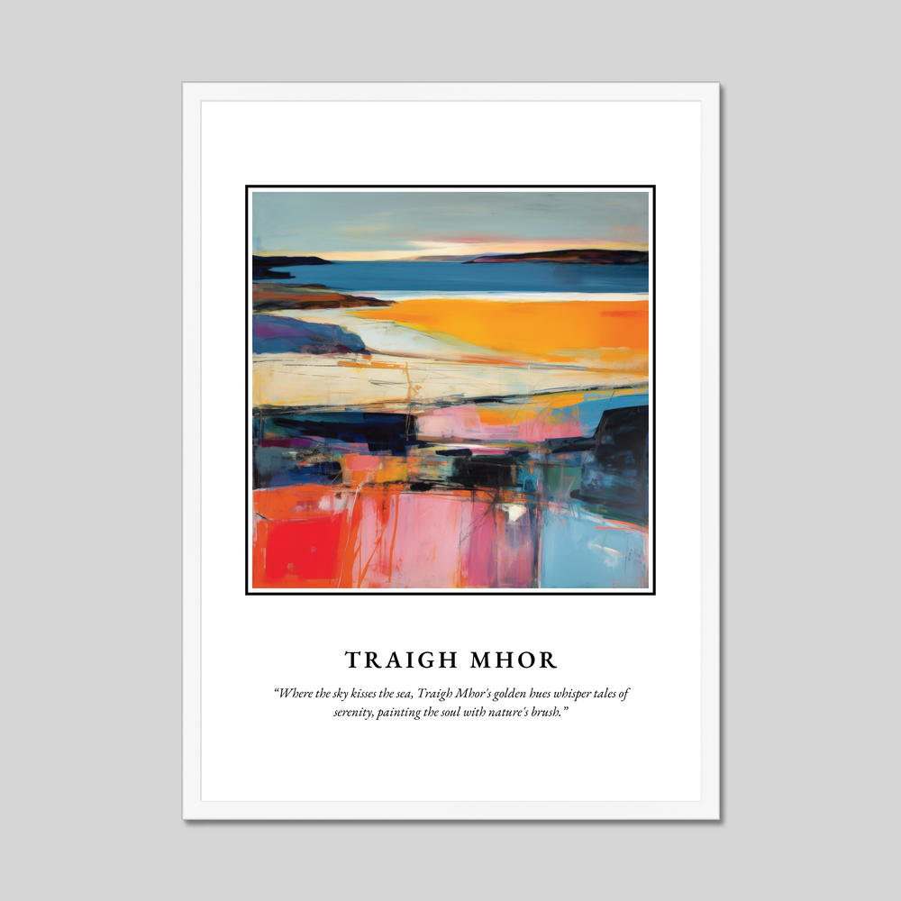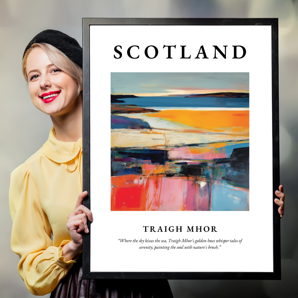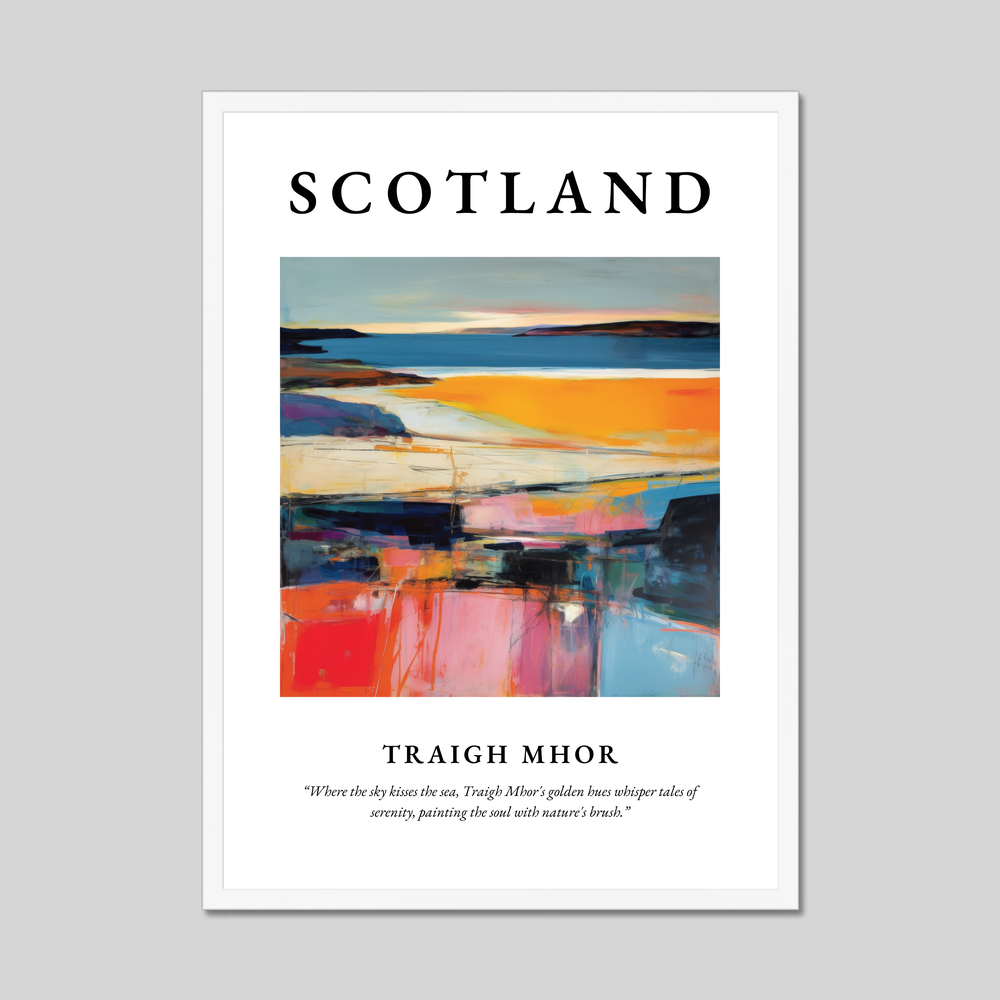 The poster proudly displays the word “SCOTLAND” in bold, commanding letters, setting the stage for the mesmerising scene below. The main feature is an "Abstract Impressionism" painting that beautifully captures the interplay of light and colour at Traigh Mhor. Vivid strokes of golden and amber hues blend with deep blues and soft pastels, creating a dynamic tableau that evokes the tranquil yet powerful essence of this majestic beach. Beneath this artistry lies the poetic quote: “Where the sky kisses the sea, Traigh Mhor's golden hues whisper tales of serenity, painting the soul with nature's brush.”