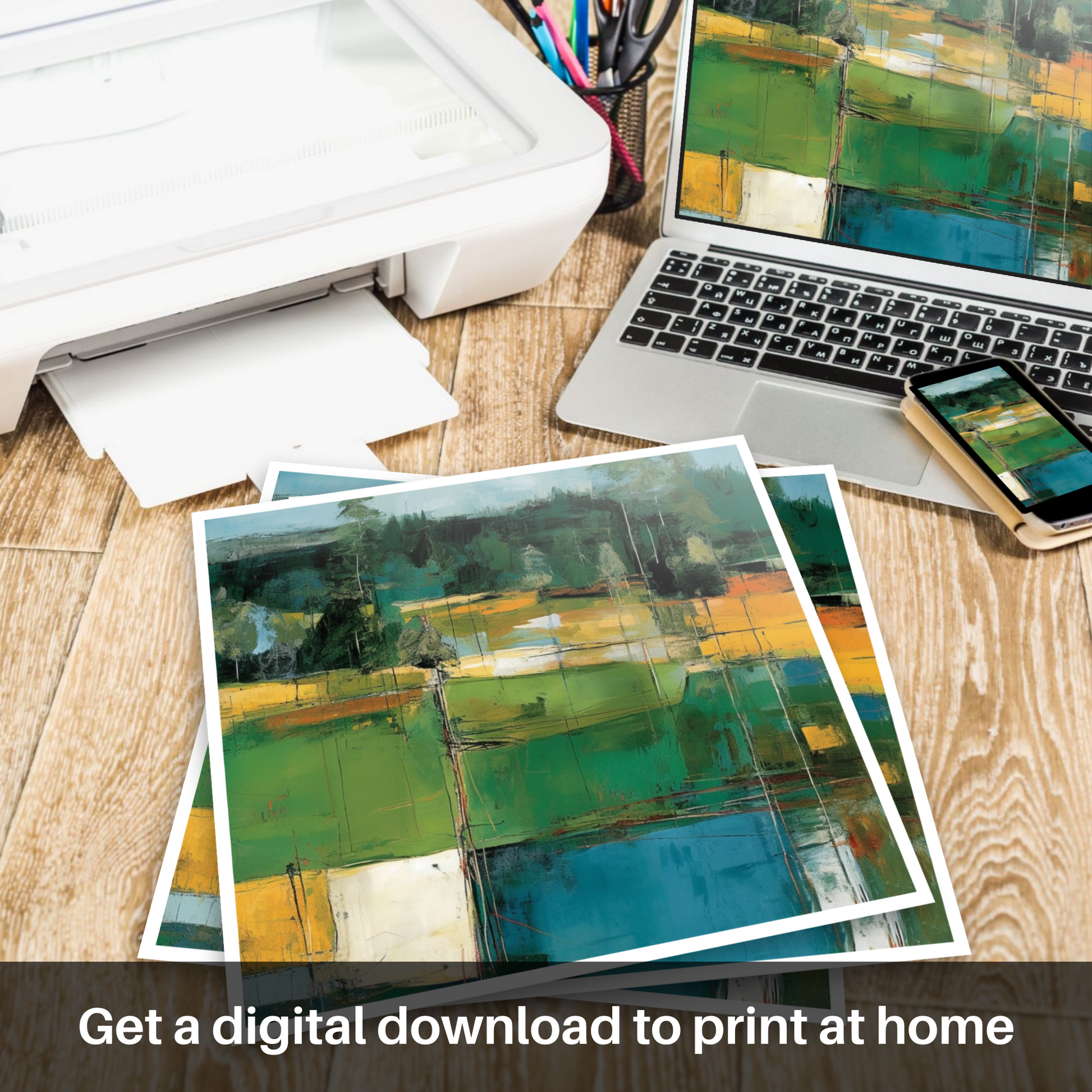 Immerse yourself in the evocative essence of the Scottish Highlands with this captivating print, a piece that echoes the splendour and rich tapestry of the Caledonian Forest. The artwork draws you in with its abstract impressionistic strokes, where hues of lush greens, earthen browns, and vibrant yellows coalesce to form a scene that feels both familiar and enchanting.