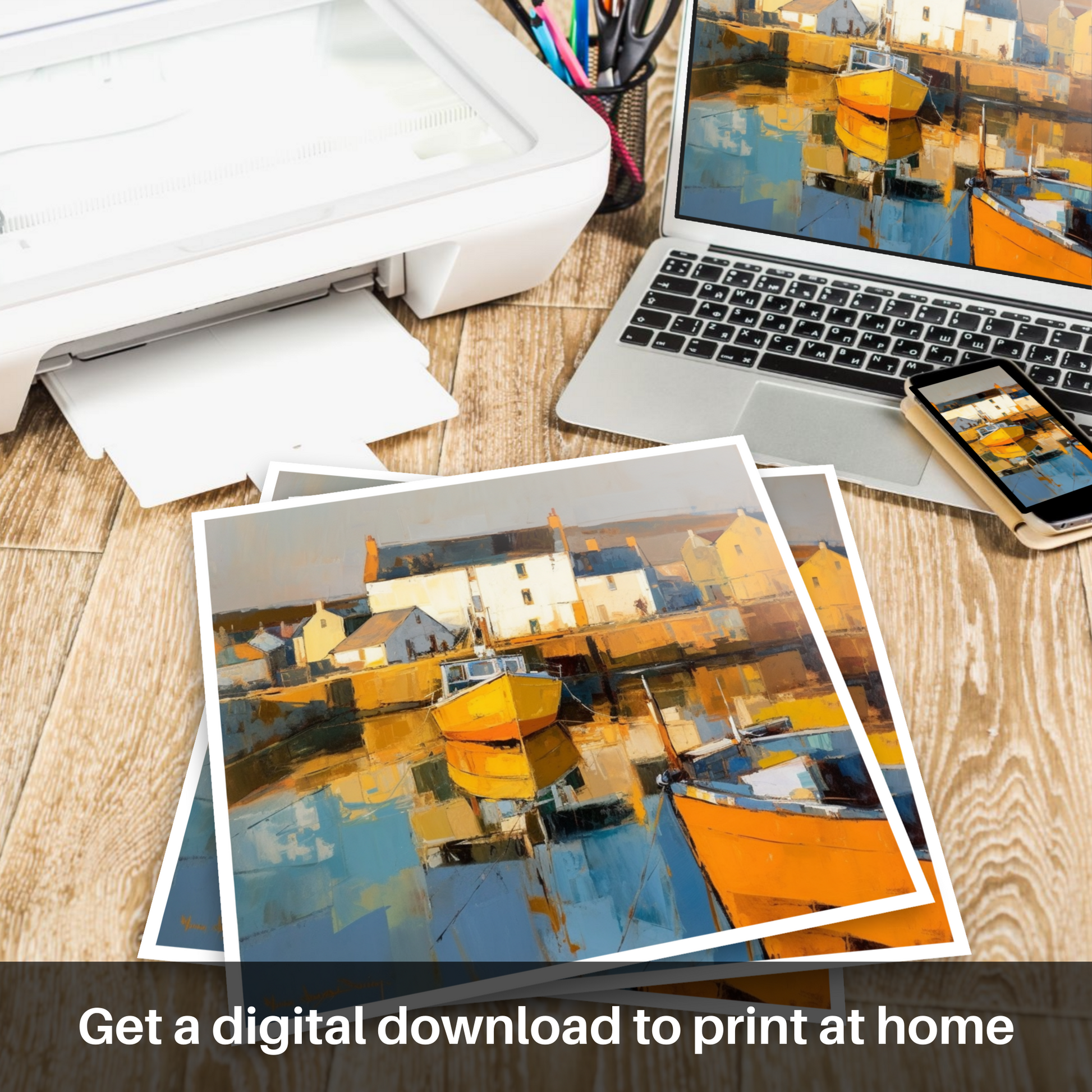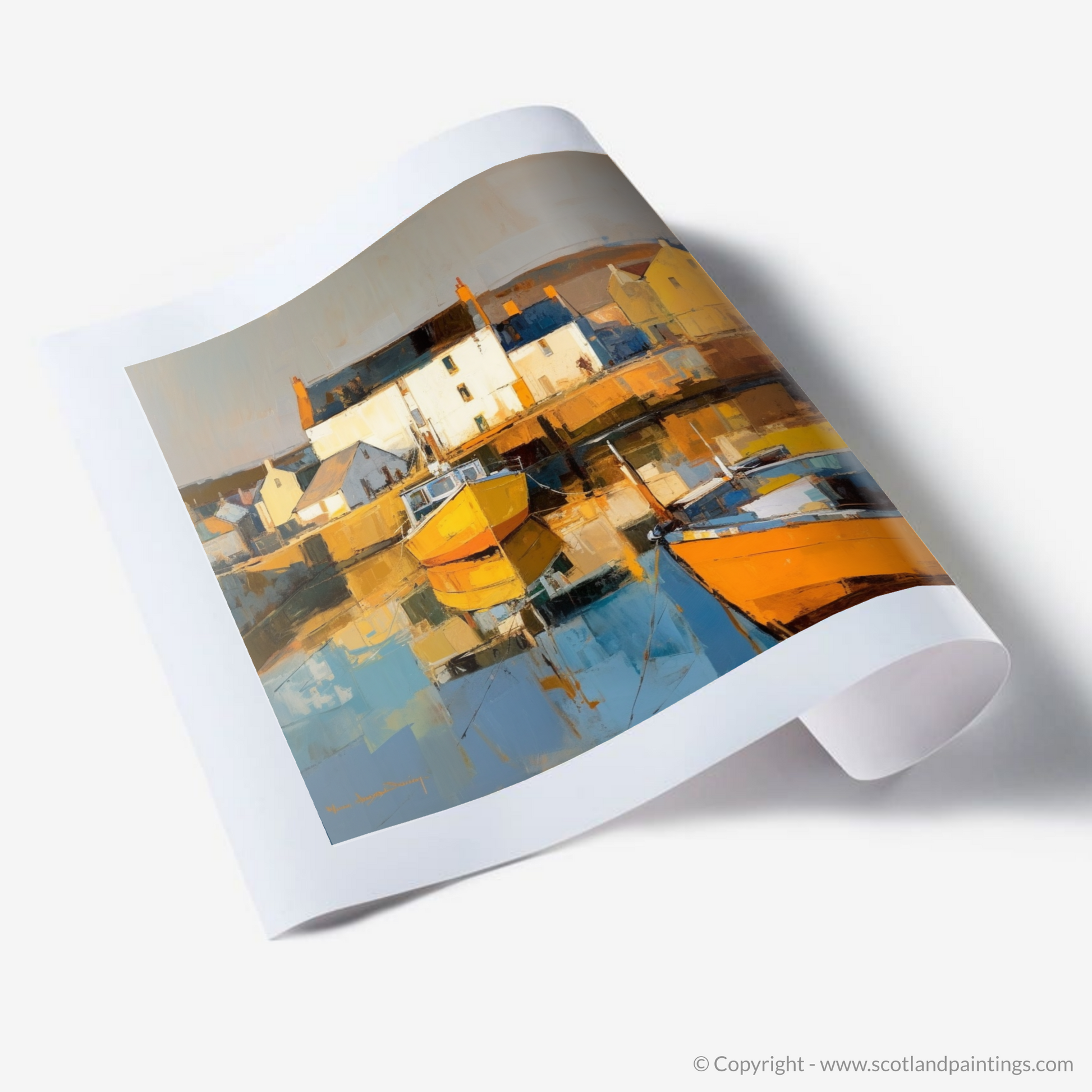 Capturing the transient beauty of Portnahaven Harbour bathed in the soft luminescence of the golden hour, this exquisite print from our 'Scottish Harbours' collection revels in the vibrant interplay of light and reflection. Evocative of the abstract impressionist style, the artwork teases the senses with its rich tapestry of rapid brushstrokes and palette knife techniques, brilliantly amalgamating shape and colour into a resonant whole.