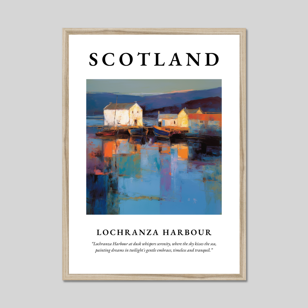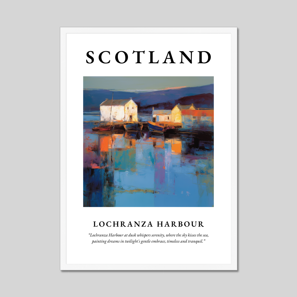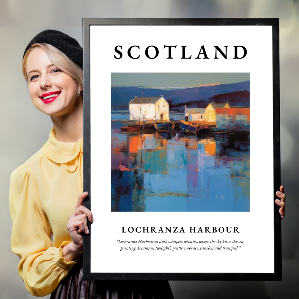 Immerse yourself in the dreamy haze of Scotland’s coastal beauty with this captivating framed poster print, where the sweeping words “SCOTLAND” introduce a spectacular Abstract Impressionism painting of Lochranza Harbour. Available in elegant black, white, or natural wood-effect frames, this stunning 50cm x 70cm print offers an expansive glimpse into a scene that captures serenity, artfully dressed in swirls of dusk.