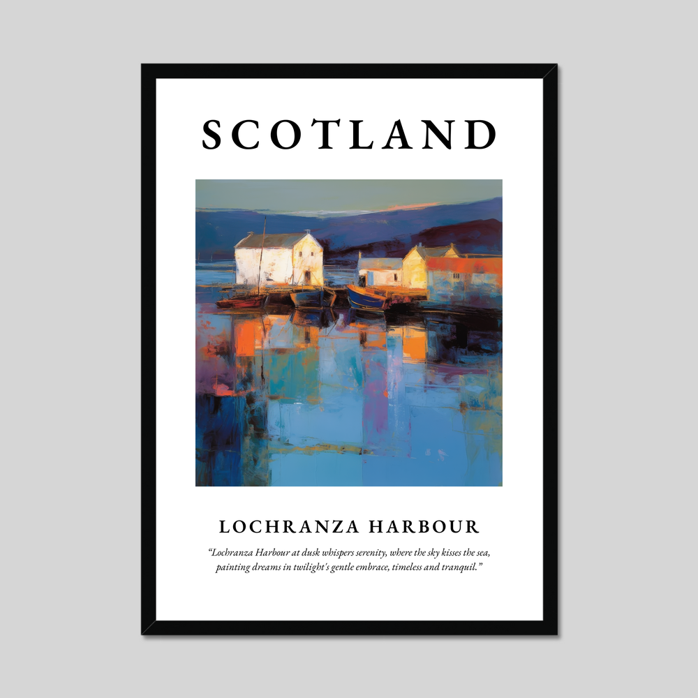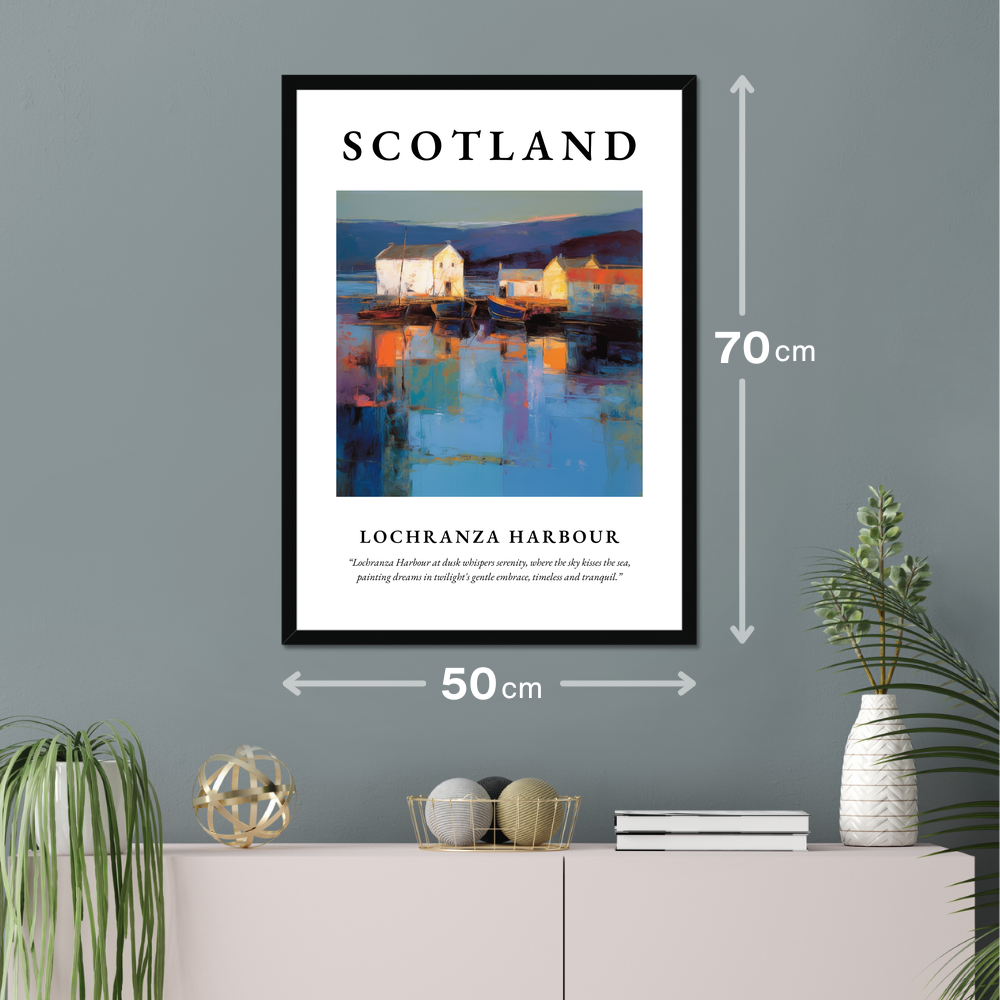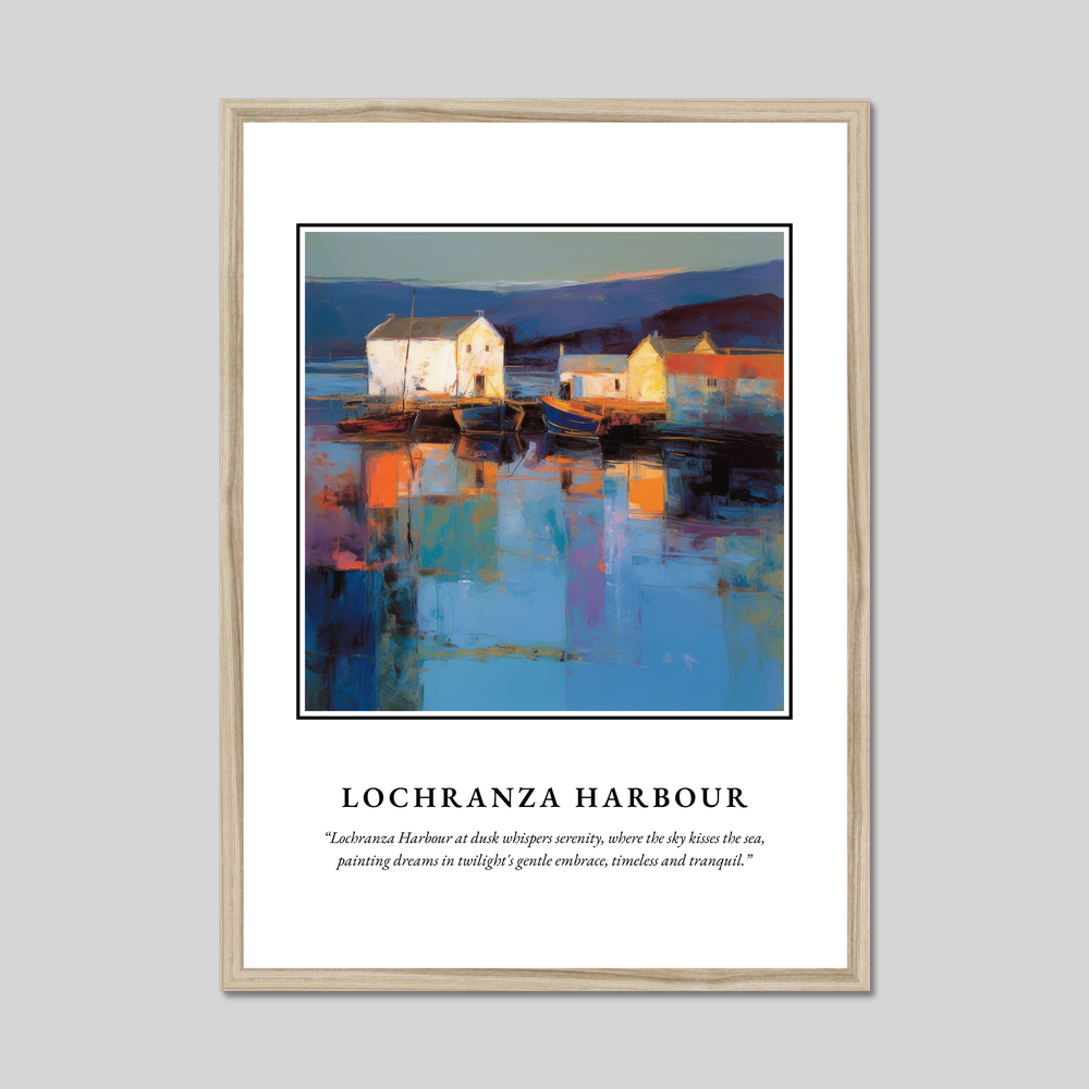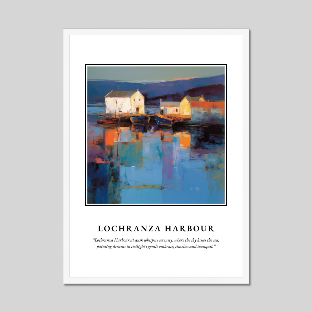 Immerse yourself in the dreamy haze of Scotland’s coastal beauty with this captivating framed poster print, where the sweeping words “SCOTLAND” introduce a spectacular Abstract Impressionism painting of Lochranza Harbour. Available in elegant black, white, or natural wood-effect frames, this stunning 50cm x 70cm print offers an expansive glimpse into a scene that captures serenity, artfully dressed in swirls of dusk.