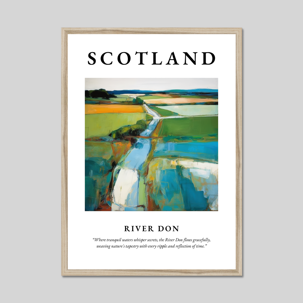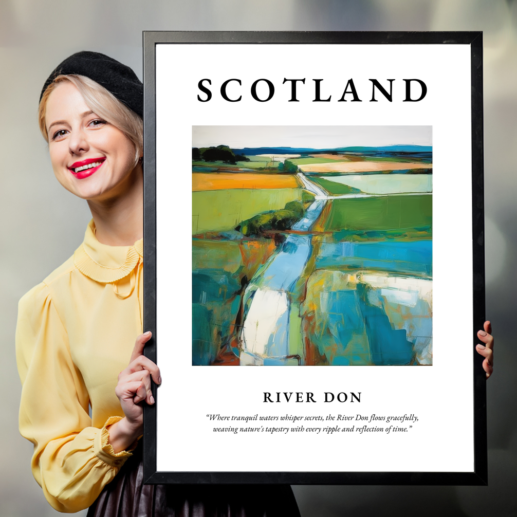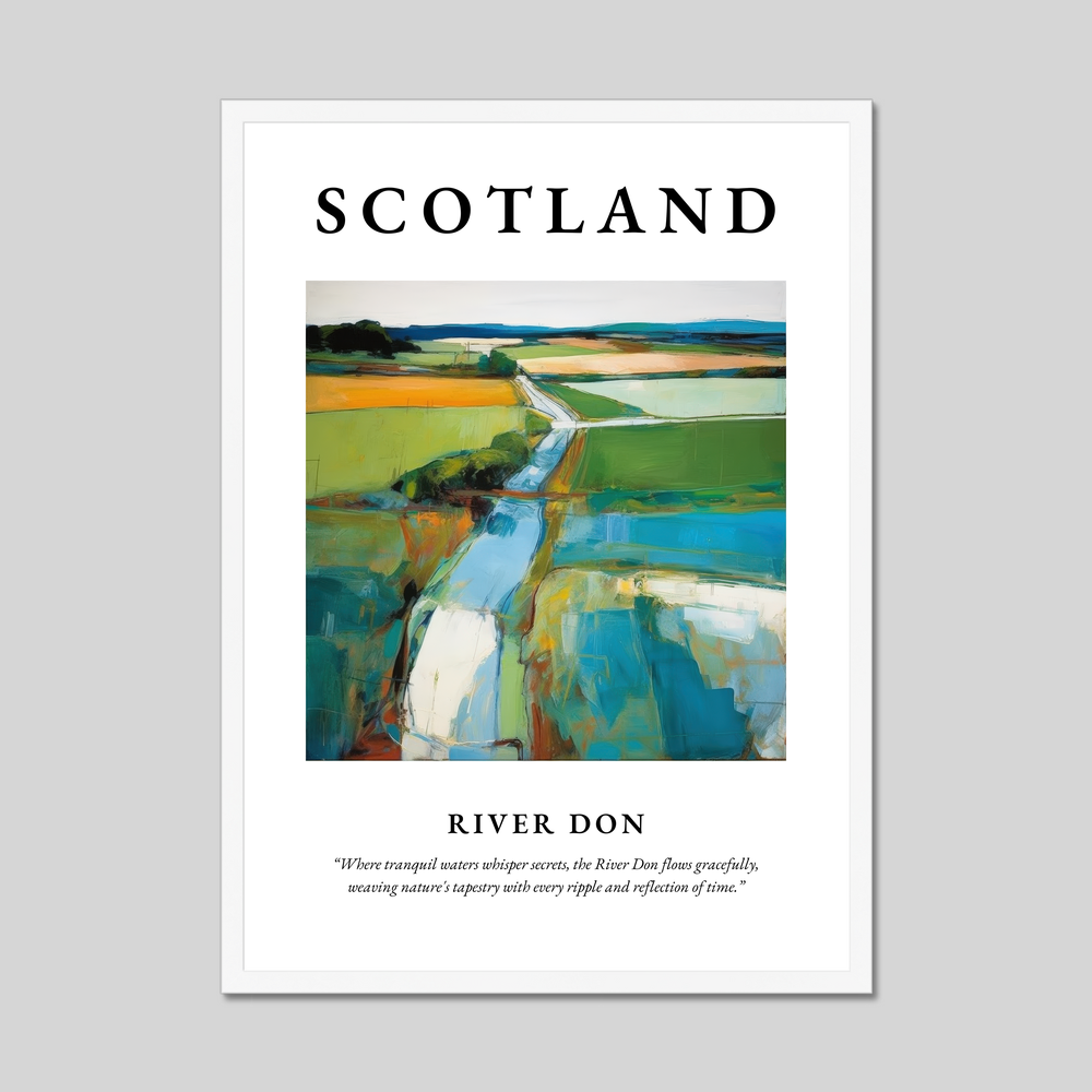 Adorned at the top with the bold, iconic lettering of "SCOTLAND," this poster becomes a tribute to the serene and mystical charm of the Scottish countryside. Beneath, a mesmerising portrayal of the River Don unfolds, its abstract impressionist brush strokes evoking the subtle nuances of light and water. This vivid composition captures a dance of colours—emerald greens and azure blues meeting earthy tones—drawing the viewer into the tranquil flow of the river. At the bottom, a poetic quote adds an enchanting touch: “Where tranquil waters whisper secrets, the River Don flows gracefully, weaving nature's tapestry with every ripple and reflection of time.”