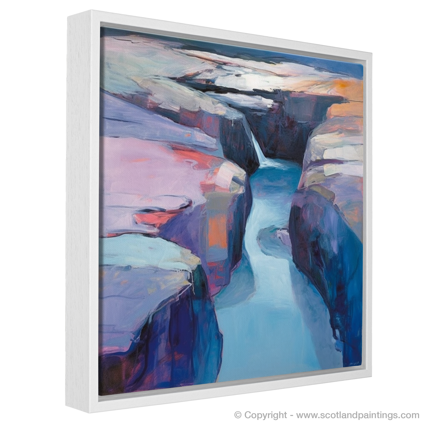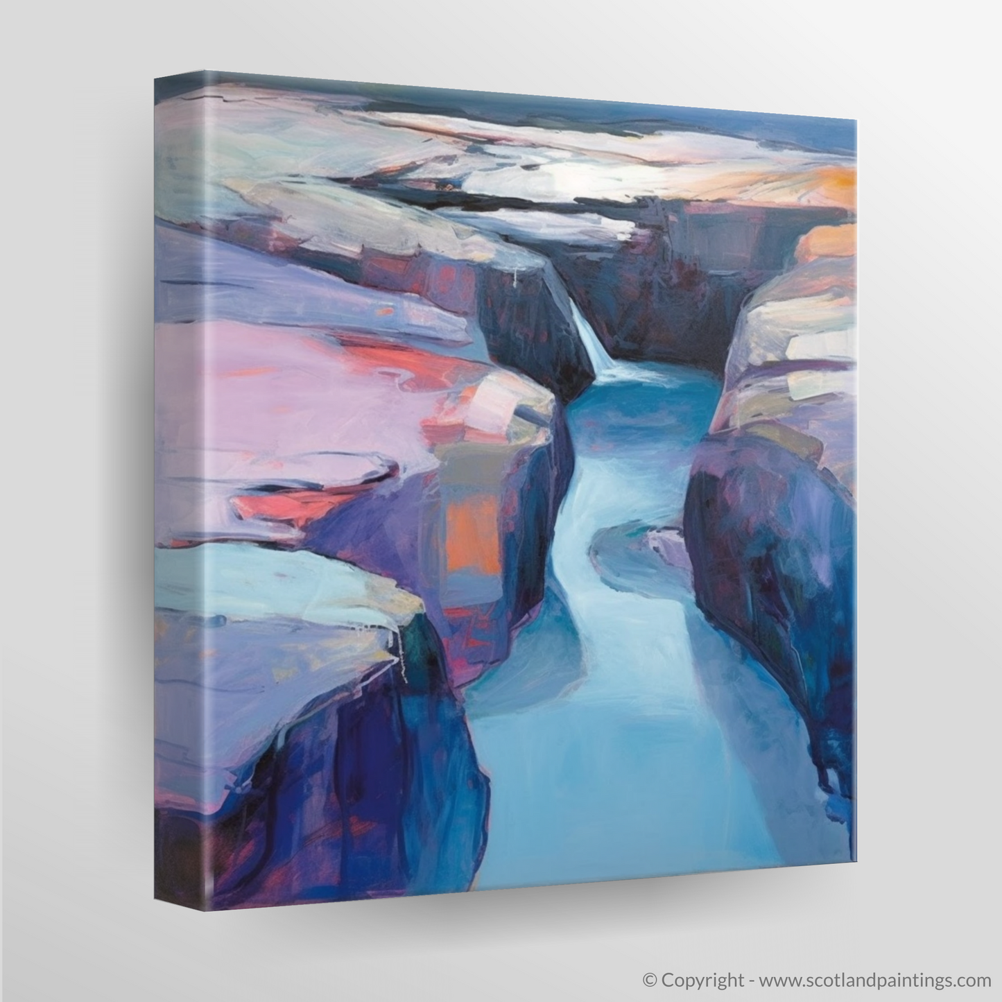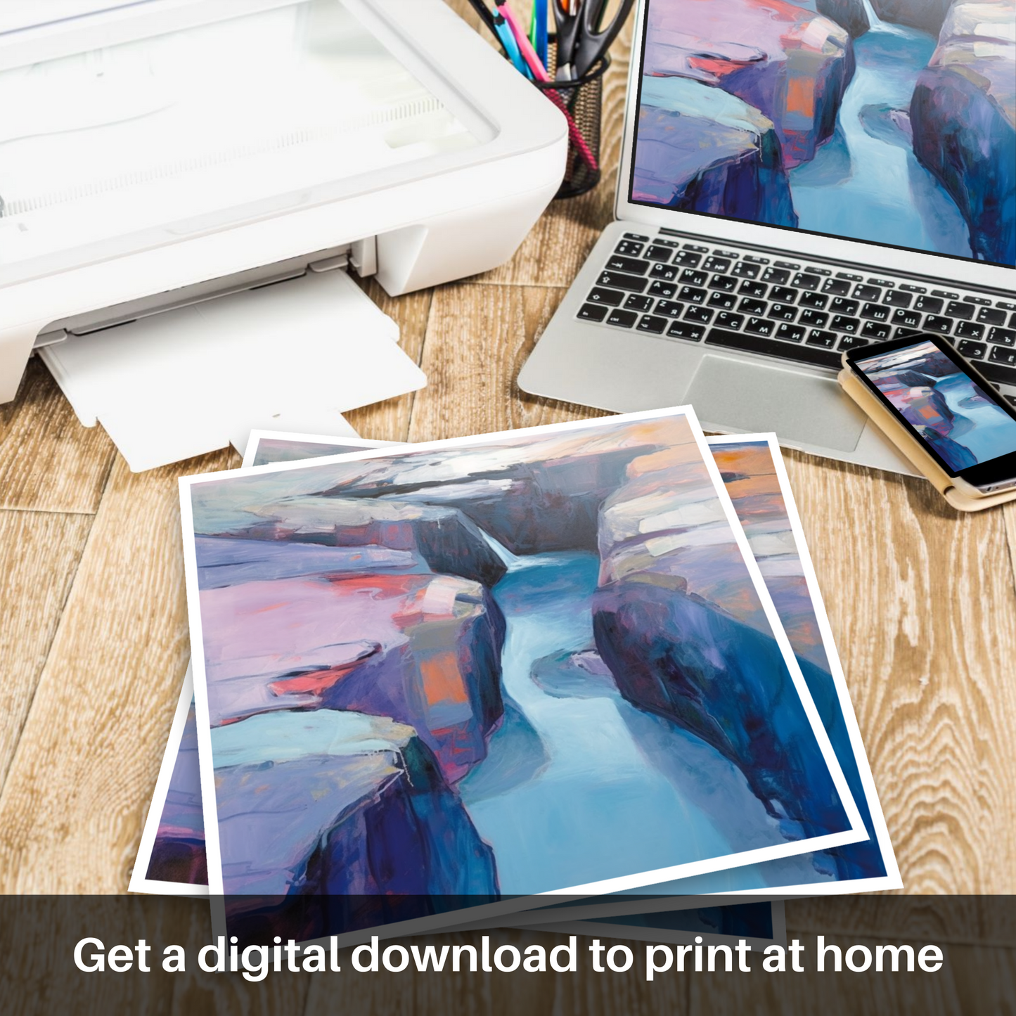 Immerse yourself in the ethereal beauty of the Scottish Highlands with this evocative piece. Hues of twilight merge with the rugged landscape in an abstract dance, capturing the enigmatic charm of The Fairy Pools at dusk. The interplay of colours conveys the cool serenity of the water against the warmth of a setting sun, lulling the soul into a state of peaceful contemplation.