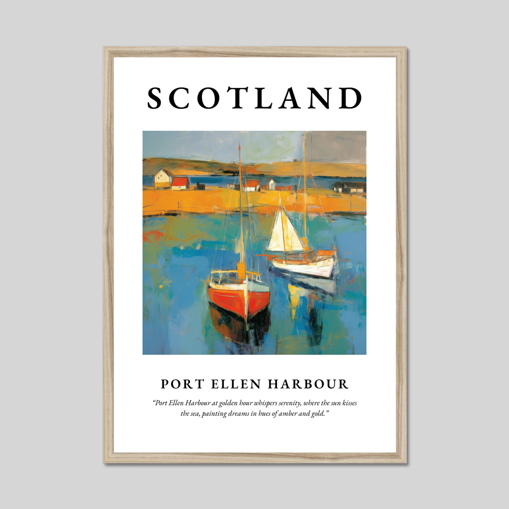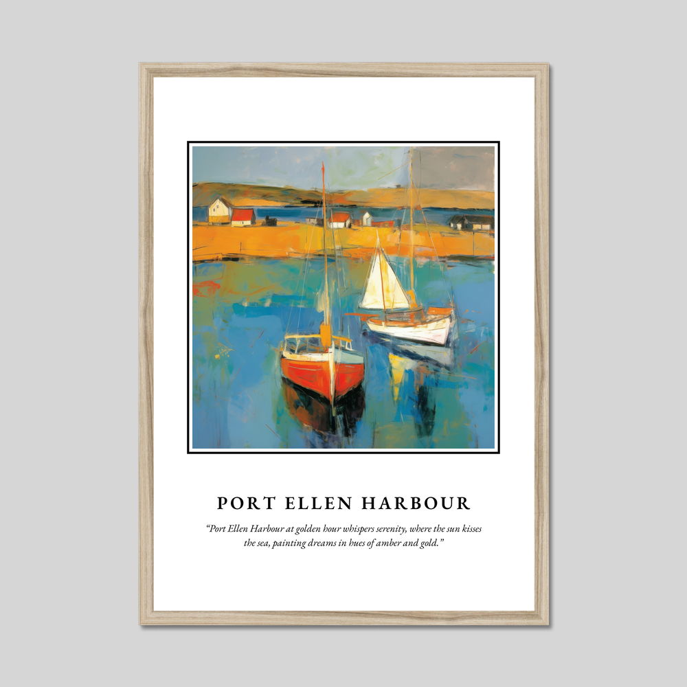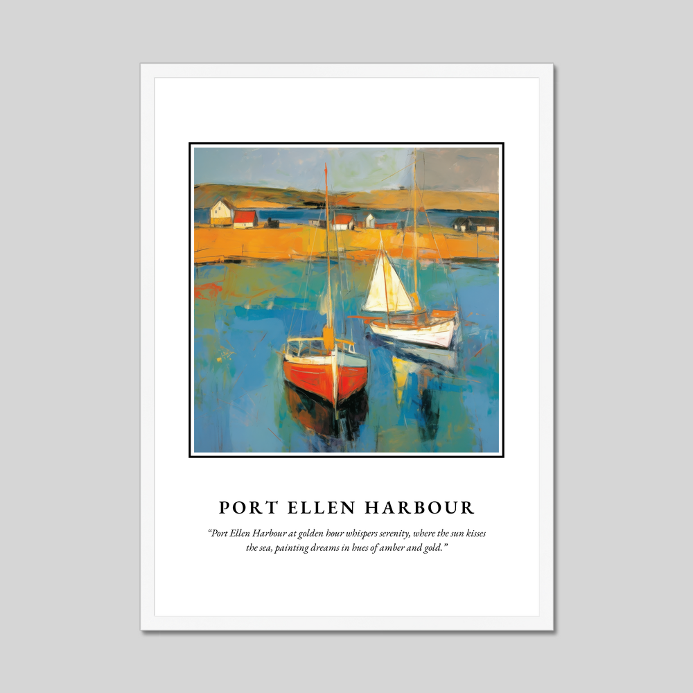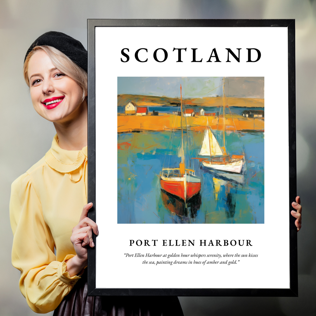 Beneath the painting, the words “Port Ellen Harbour at golden hour whispers serenity, where the sun kisses the sea, painting dreams in hues of amber and gold” encapsulate the ethereal beauty of this Scottish treasure. This print is more than a mere depiction; it’s a portal for those who hold the harbour dear, whether through cherished memories or a love for Abstract Impressionism.