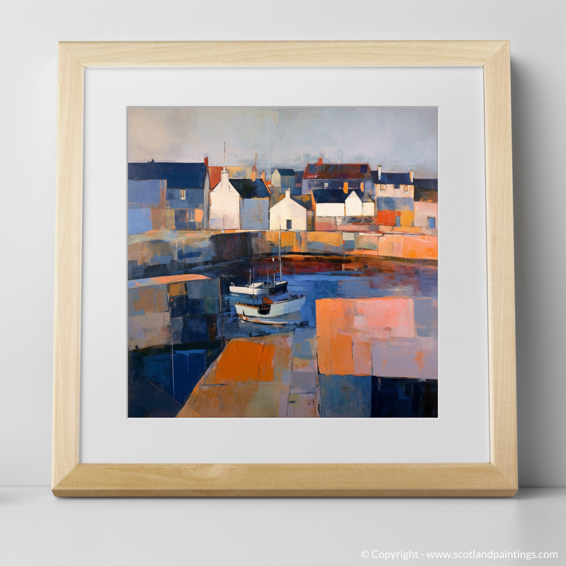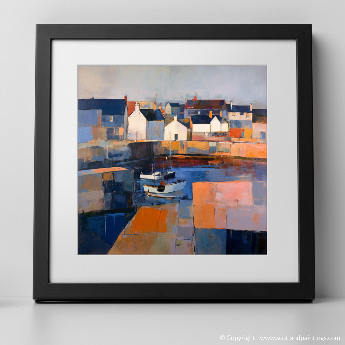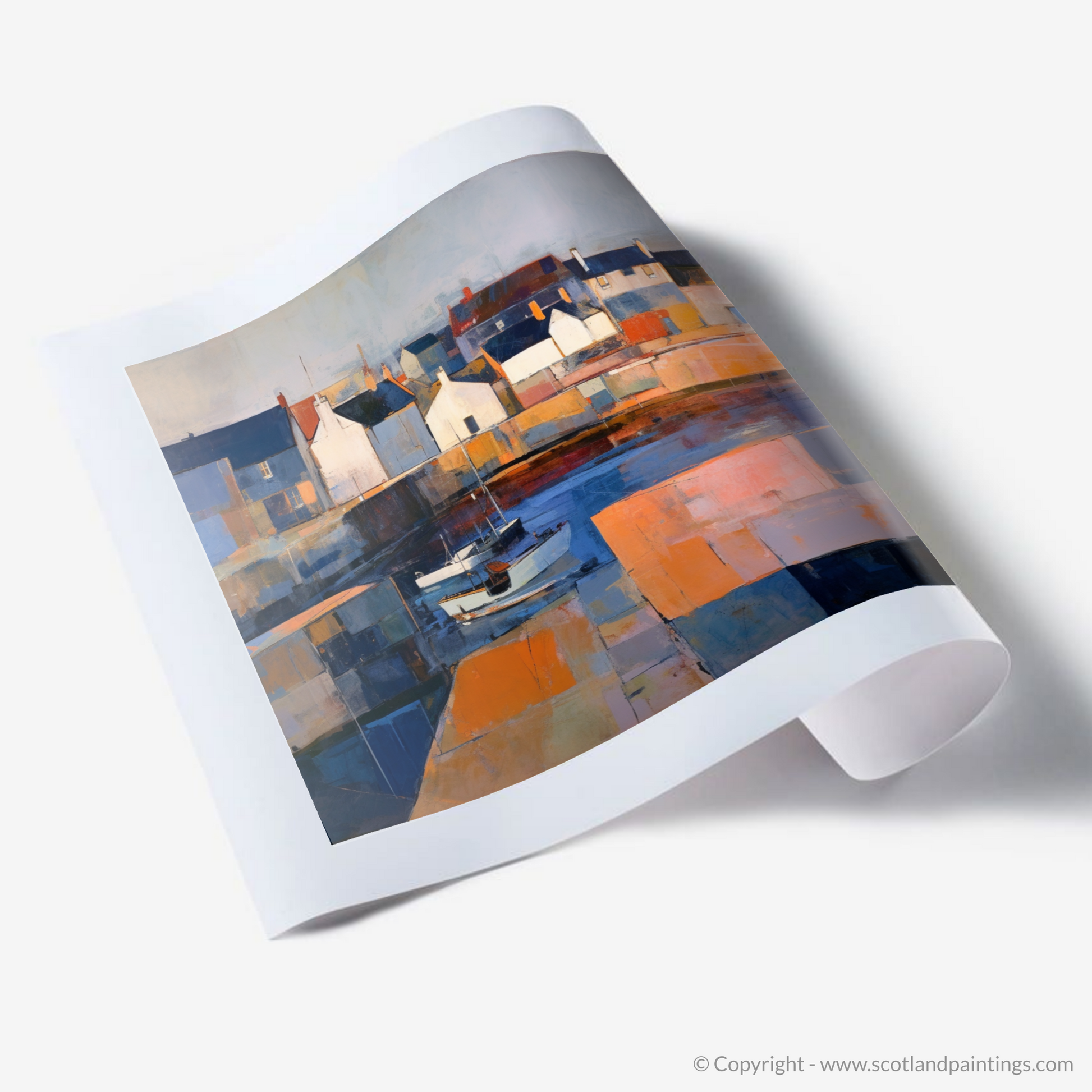 Immerse yourself in the serene atmosphere of a Scottish harbour at twilight with this exquisite print, where abstract shapes and bursts of colour capture the essence of Crail Harbour as daylight fades. The artwork’s palette is a symphony of warmth and cool tones, where dusky oranges and ethereal blues mingle effortlessly to suggest the reflection of the sky’s last light on the tranquil waters.