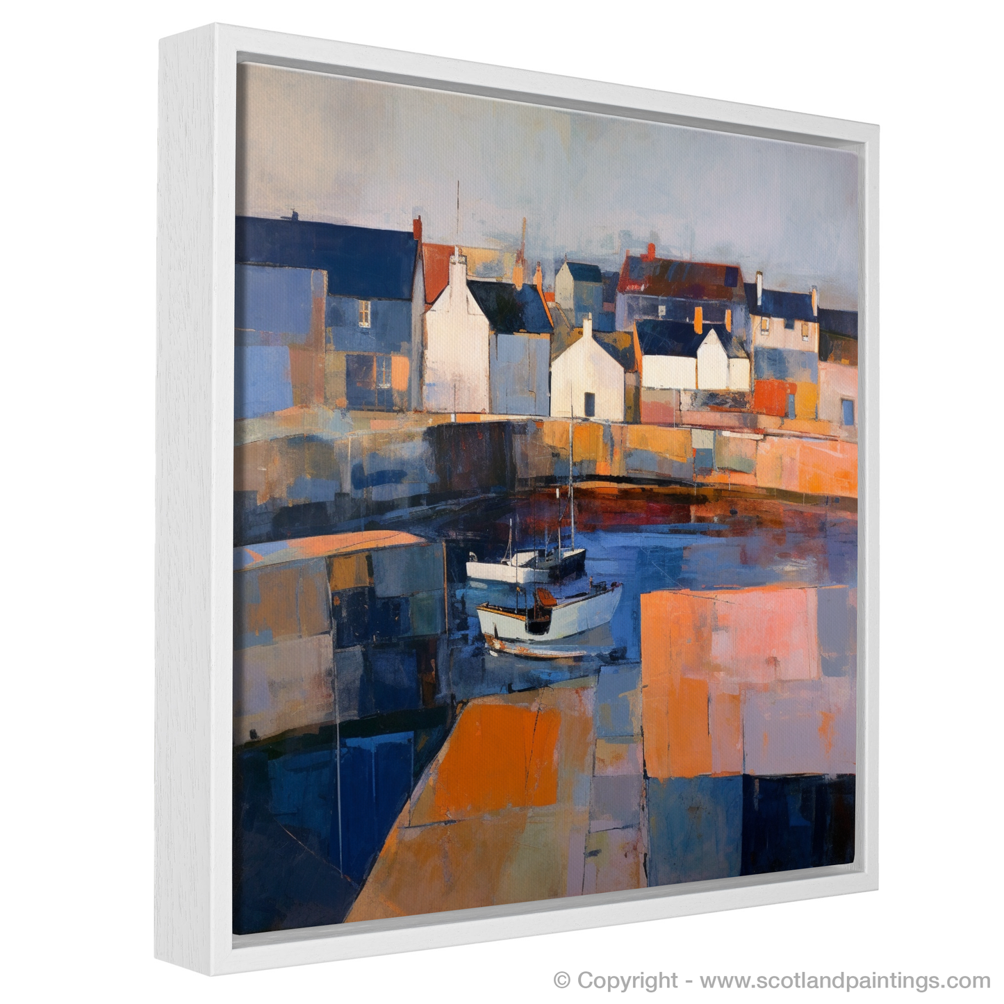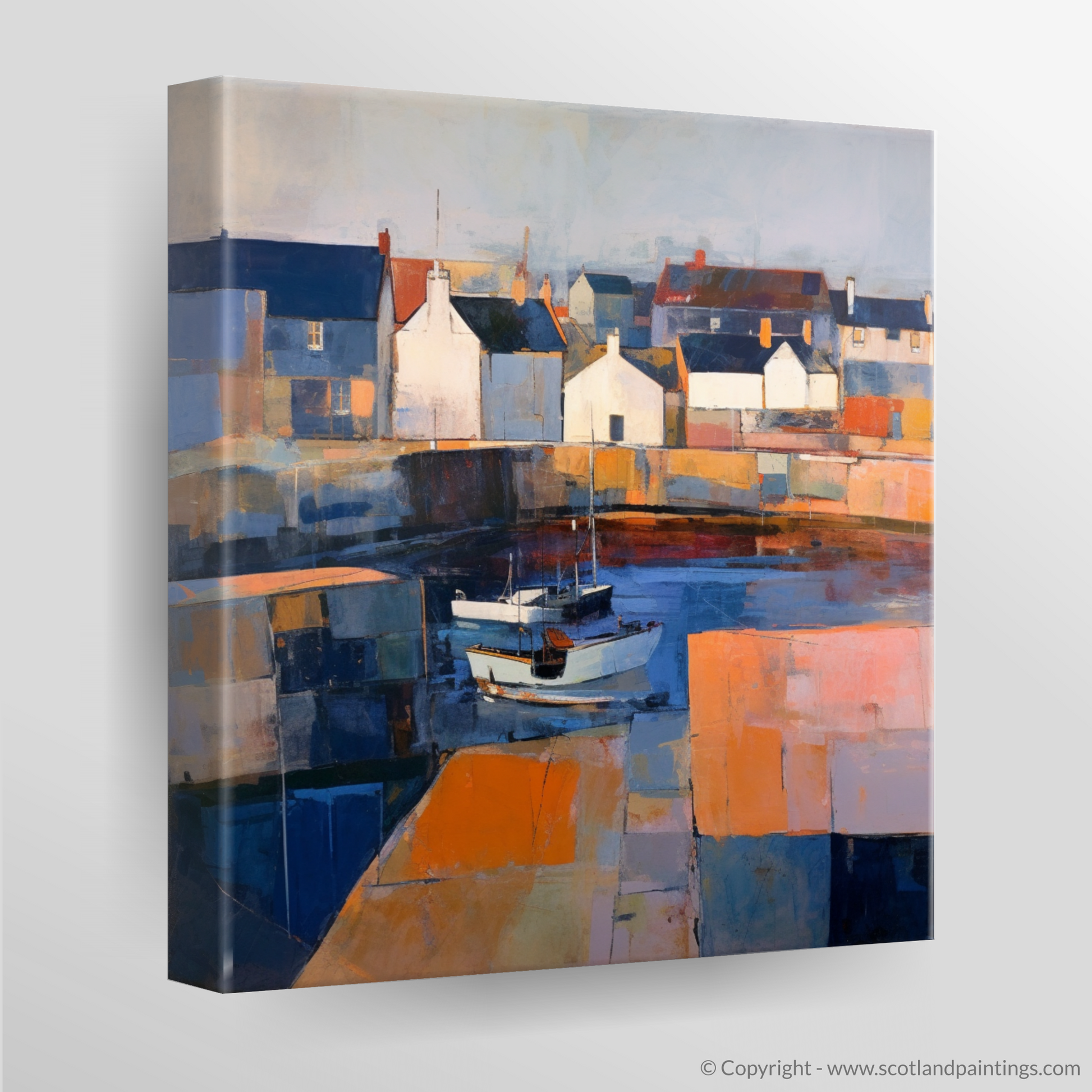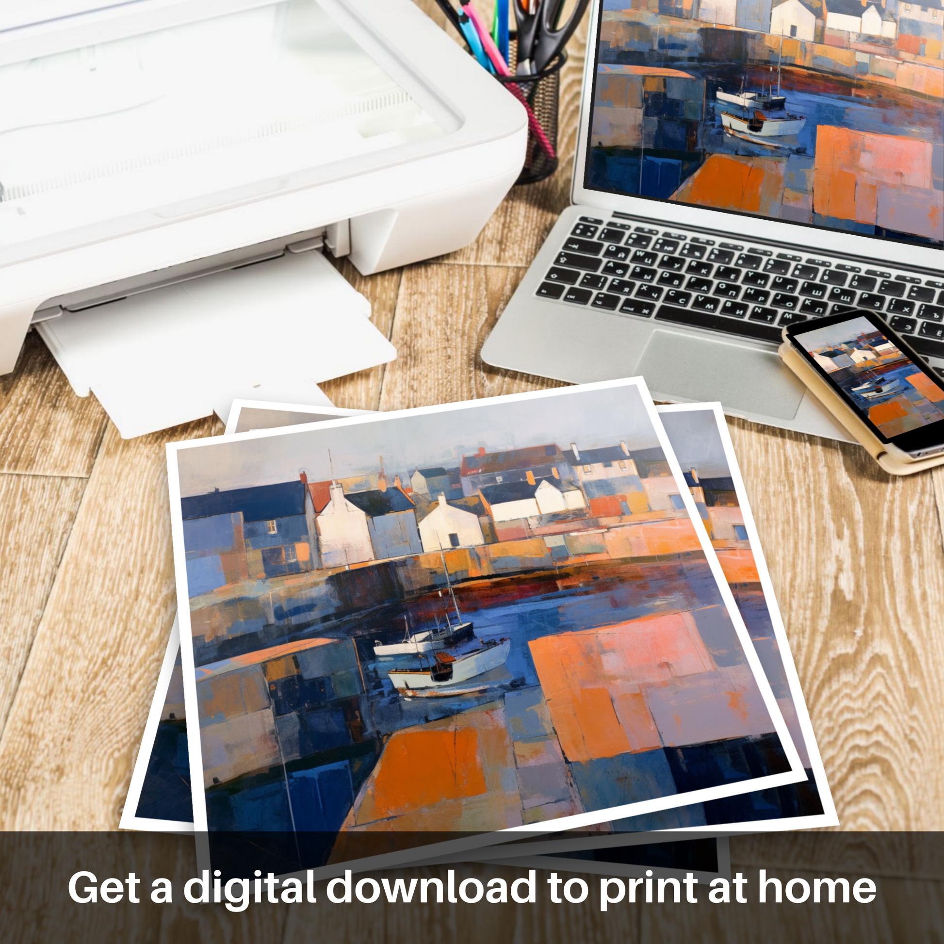 Immerse yourself in the serene atmosphere of a Scottish harbour at twilight with this exquisite print, where abstract shapes and bursts of colour capture the essence of Crail Harbour as daylight fades. The artwork’s palette is a symphony of warmth and cool tones, where dusky oranges and ethereal blues mingle effortlessly to suggest the reflection of the sky’s last light on the tranquil waters.