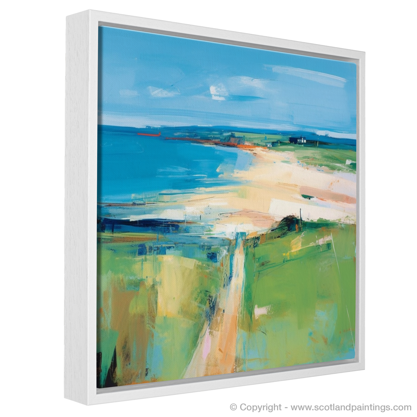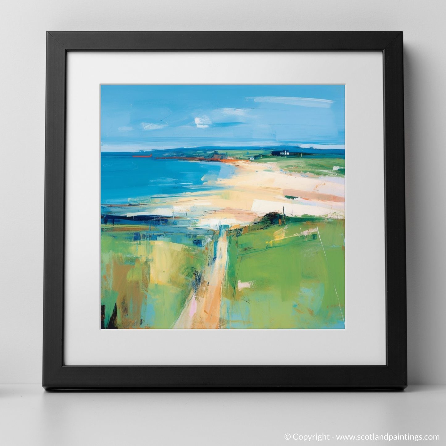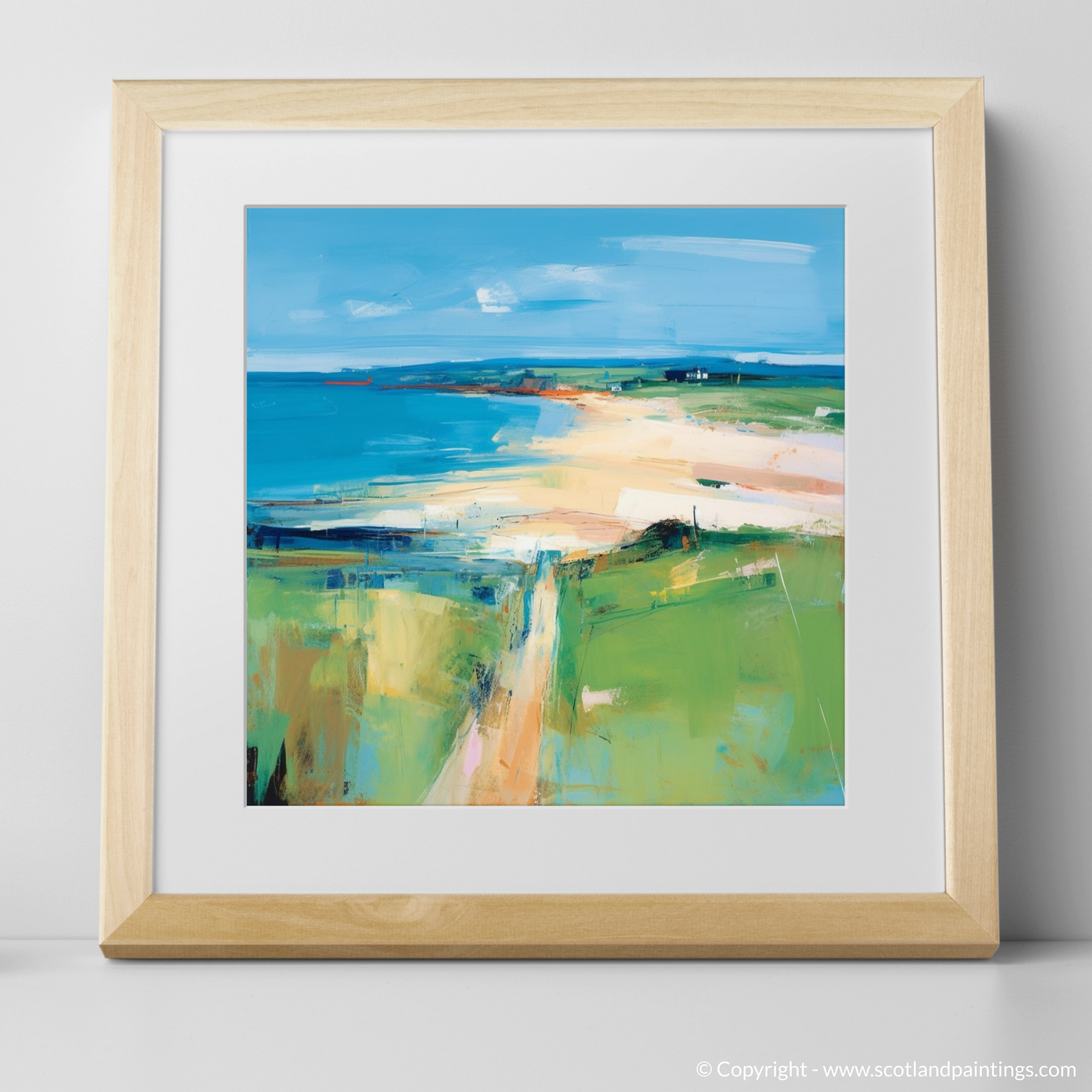 Immerse yourself in the vivacious energy of the Scottish shoreline with this captivating abstract impressionistic print inspired by the serene Gullane Beach in East Lothian. Streaks of azure and cerulean mimic the dance of the ocean waves, while creams and sandy tones evoke the vast stretches of soft beach. The tranquil horizon meets an expanse of sky brushed with gentle strokes of white and pale blues, conveying the essence of a breezy coastal sky.
