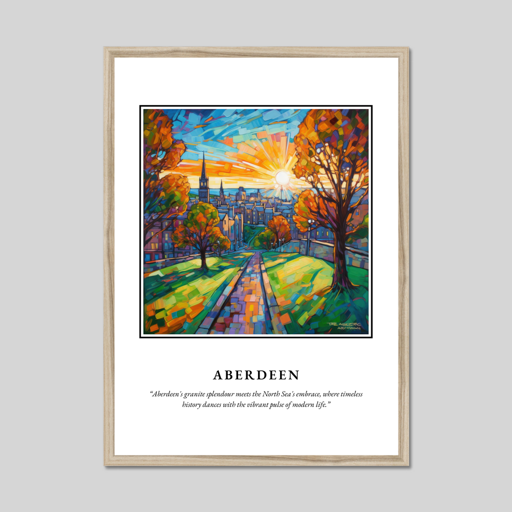 The artwork portrays Aberdeen's iconic granite architecture bathed in the soft glow of a setting sun, with a vivid interplay of light and colour that brings the city to life. Each brushstroke captures the timeless dance between history and modernity, set against the serene background of the North Sea. The experience is enriched by the evocative quote beneath, echoing the city's unique blend of past and present.