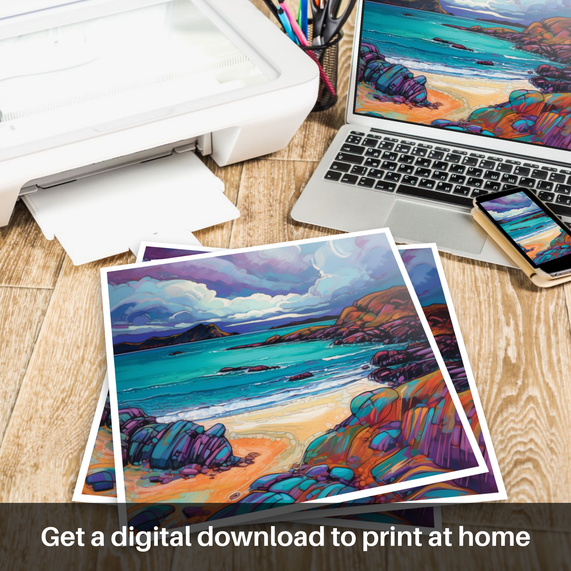 Each element of the cove's landscape, from the distant headlands to the intimate details of pebbles on the shore, is infused with the Modern Impressionist's signature style, a blend of emotion and light. With its bold interpretation and an almost surreal quality of light, this print is a celebration of the Scottish coastline, ready to instil a sense of awe and wonder in any space it adorns.