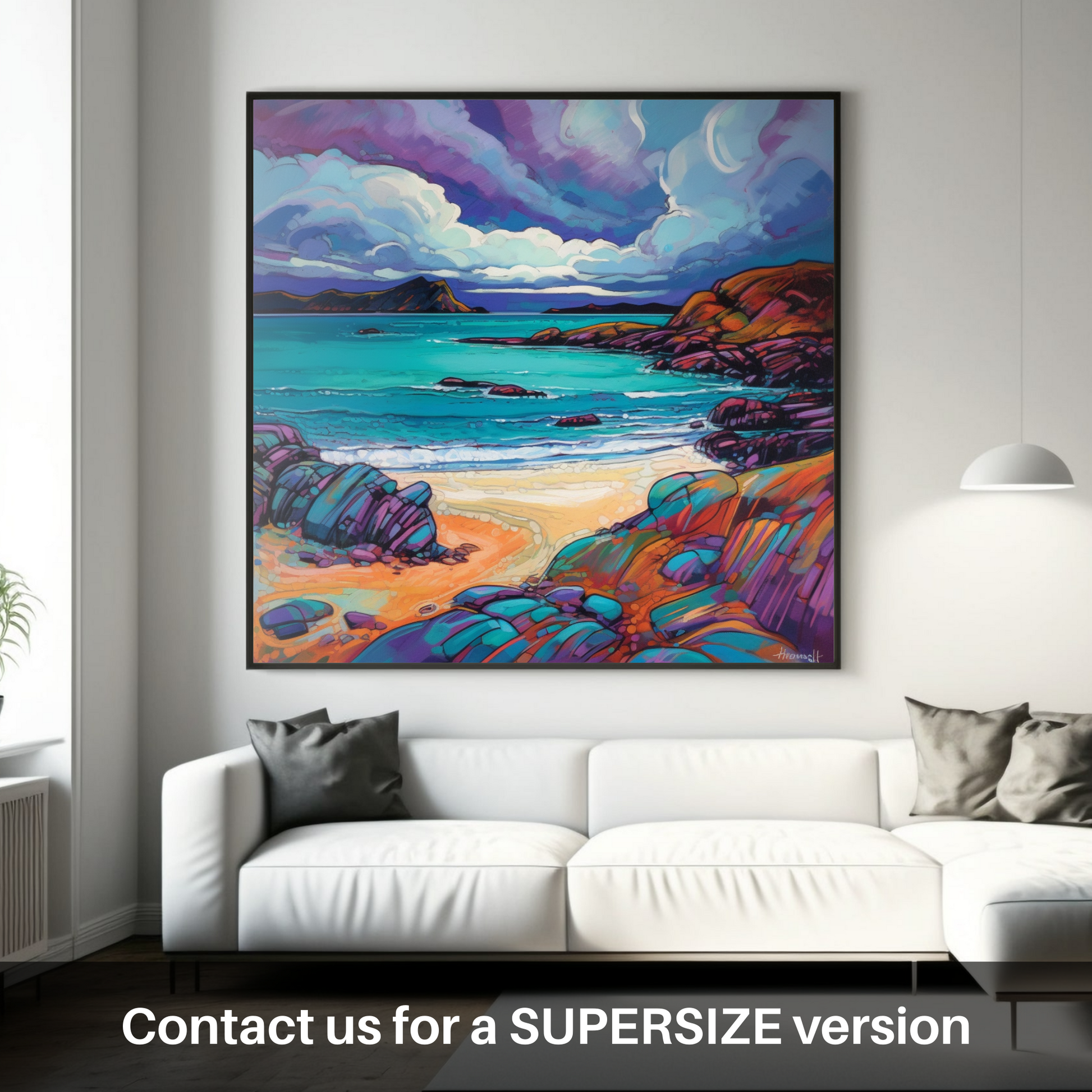 Let the vibrant palette and energetic brushwork of this evocative print whisk you away to the stunning shores of Achmelvich Bay. The piece captures the untamed beauty of one of Scotland's most picturesque coves, where the wild spirit of nature dances across the canvas in hues of purples, blues, and fiery oranges.