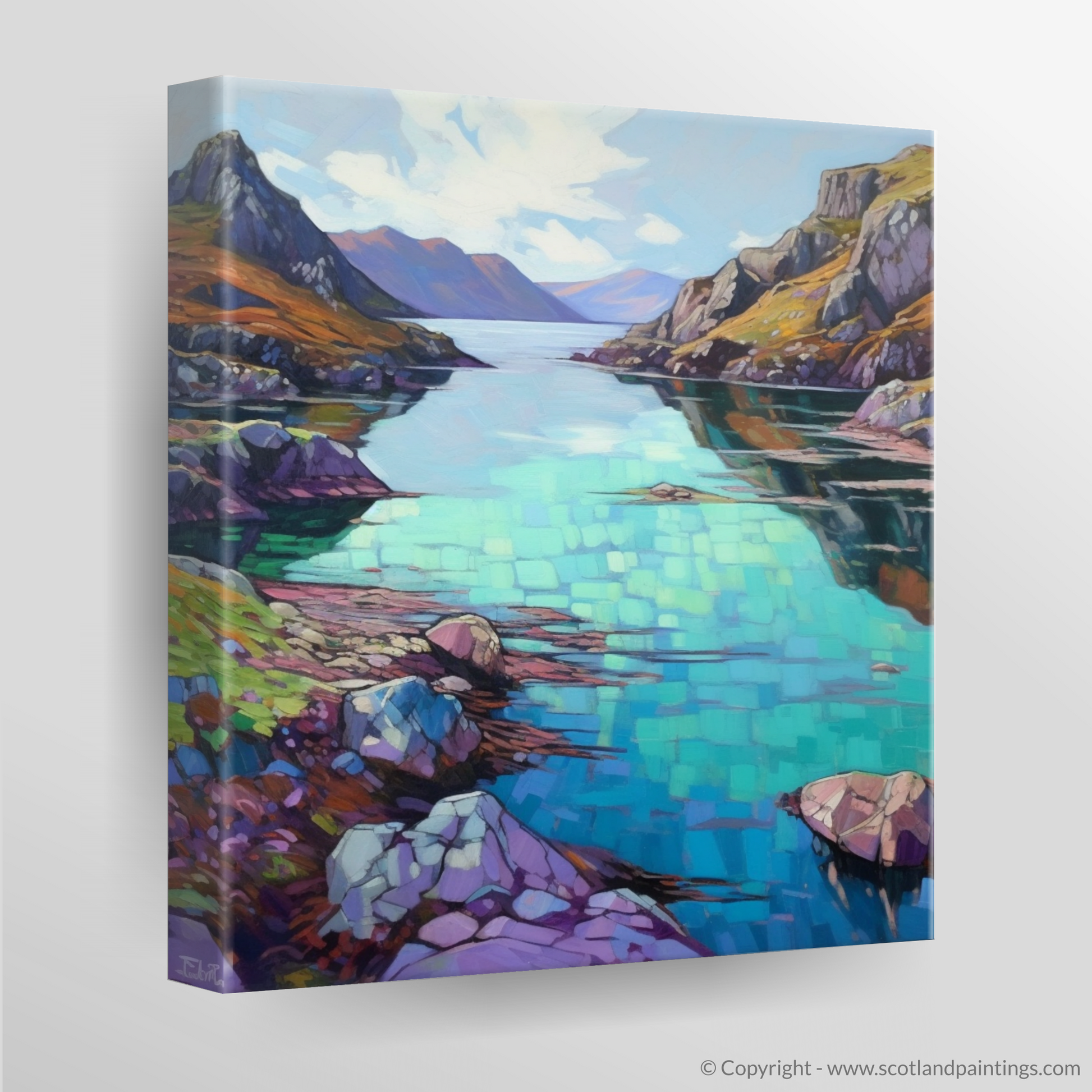 The canvas is alive with a vivacious palette, dominated by the deep blues and turquoises of the still waters, shimmering and shifting in the light. Evocative brushstrokes shape the mirror-like surface of the loch, creating a patchwork of iridescent hues that perfectly reflects the sky above. The juxtaposition of soft cerulean and darker, brooding shades hints at the depths beneath and the untold stories that lie within.