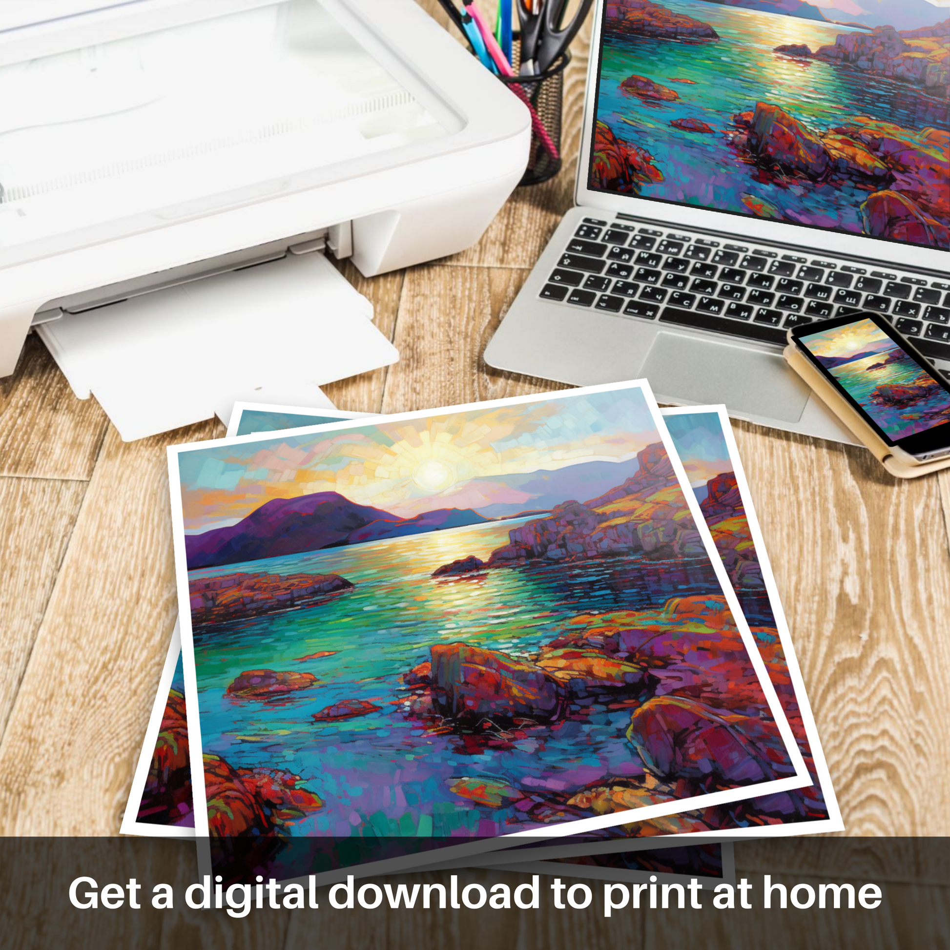 Immerse yourself in the vibrant hues and expressive energy of a piece that captures the stunning essence of the Scottish Isles. This evocative print brings to life the picturesque landscape of the Inner Hebrides as seen through the lens of Modern Impressionism, offering viewers a dynamic and contemporary vision of Scotland's natural beauty.