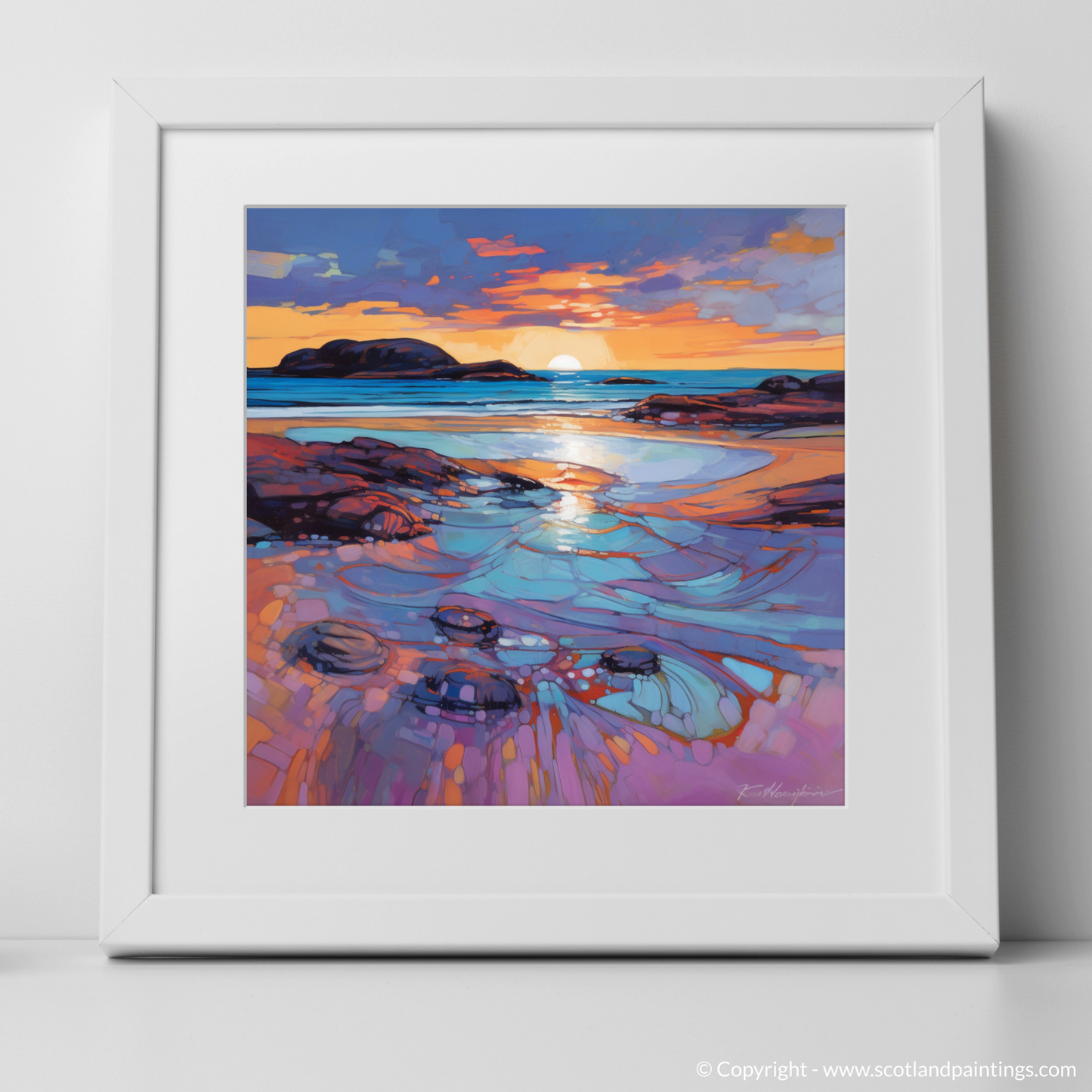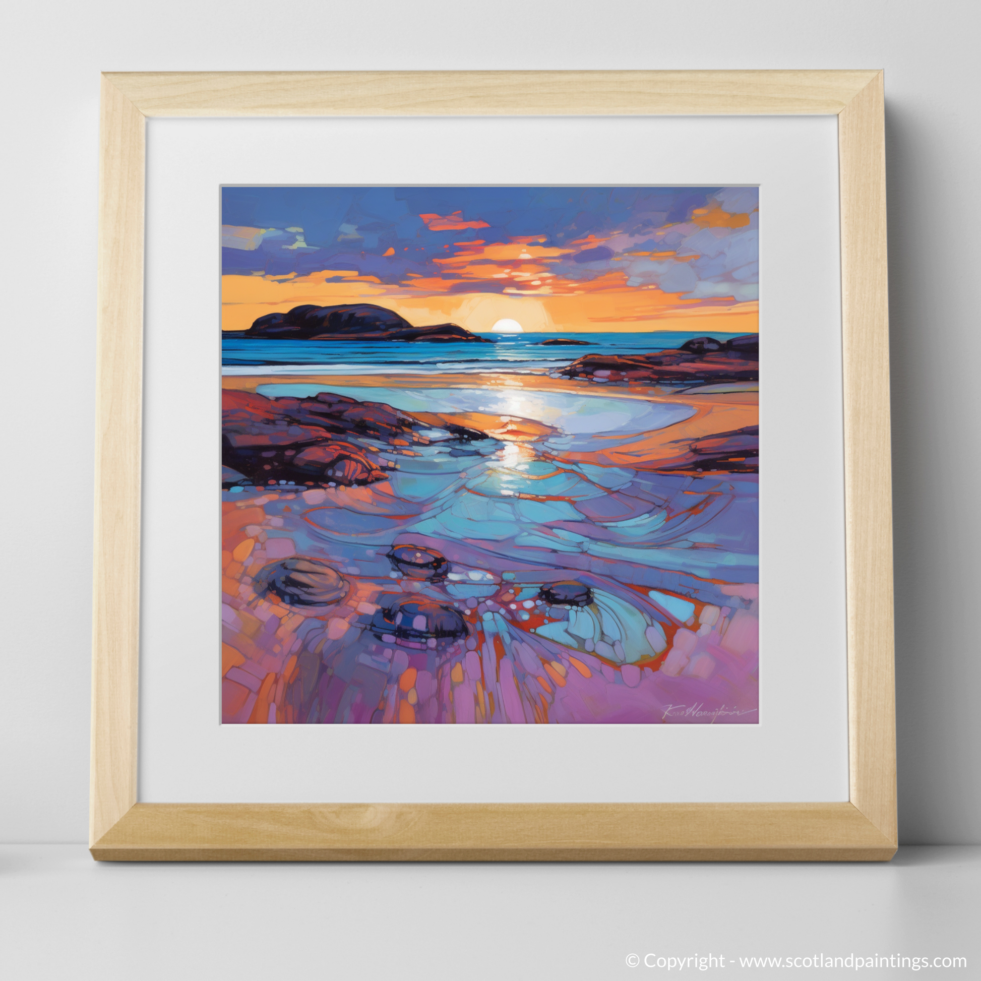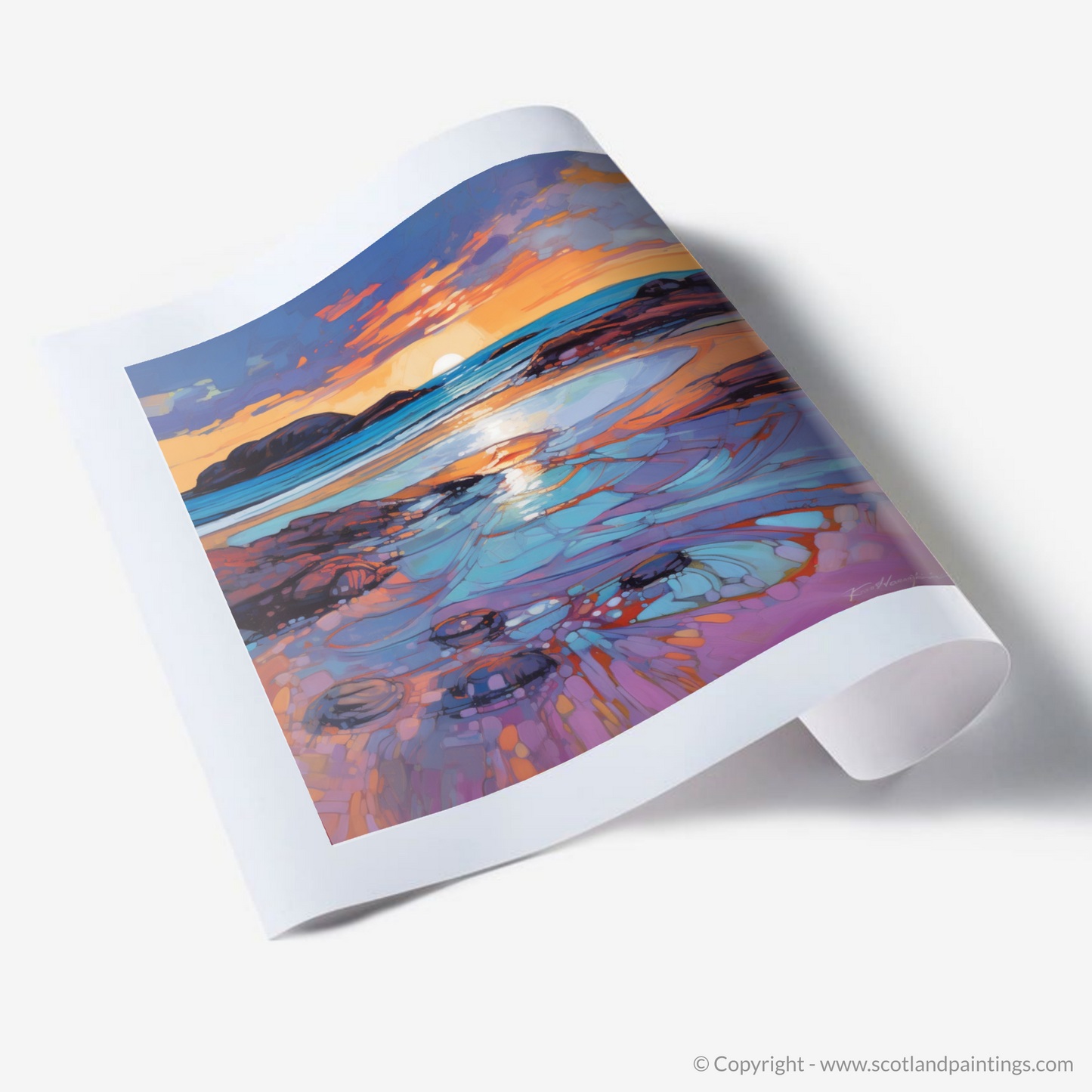 Capture the essence of Scottish coastal beauty with this exquisite piece, which draws its inspiration from the serene shores of Traigh Mhor at the magical hour of dusk. As the sun dips low on the horizon, the sky transforms into a canvas of mesmerising hues, with splashes of crimson, amber and gold mingling with shades of lilac and soft blue. Beneath this heavenscape, the tranquil sea whispers tales of the day's end, its surface reflecting the sunset's myriad of colours.