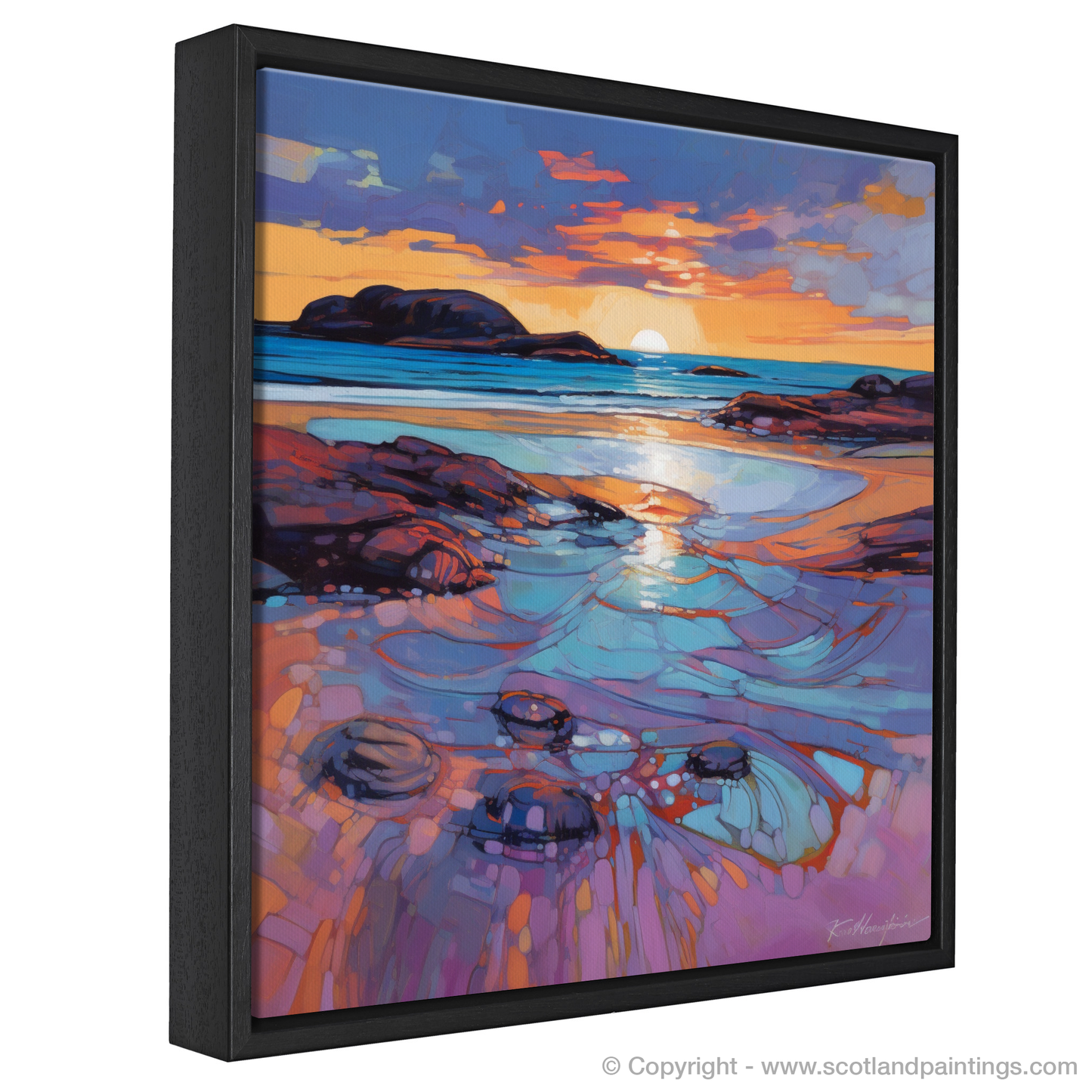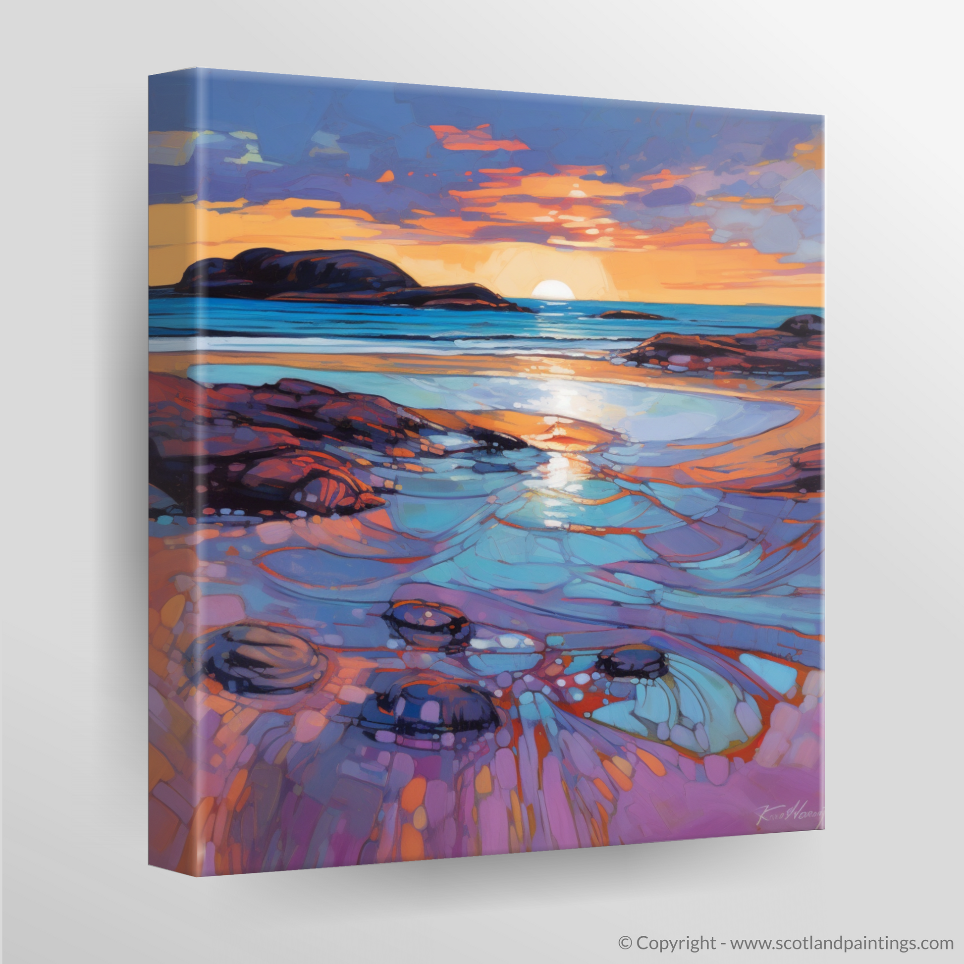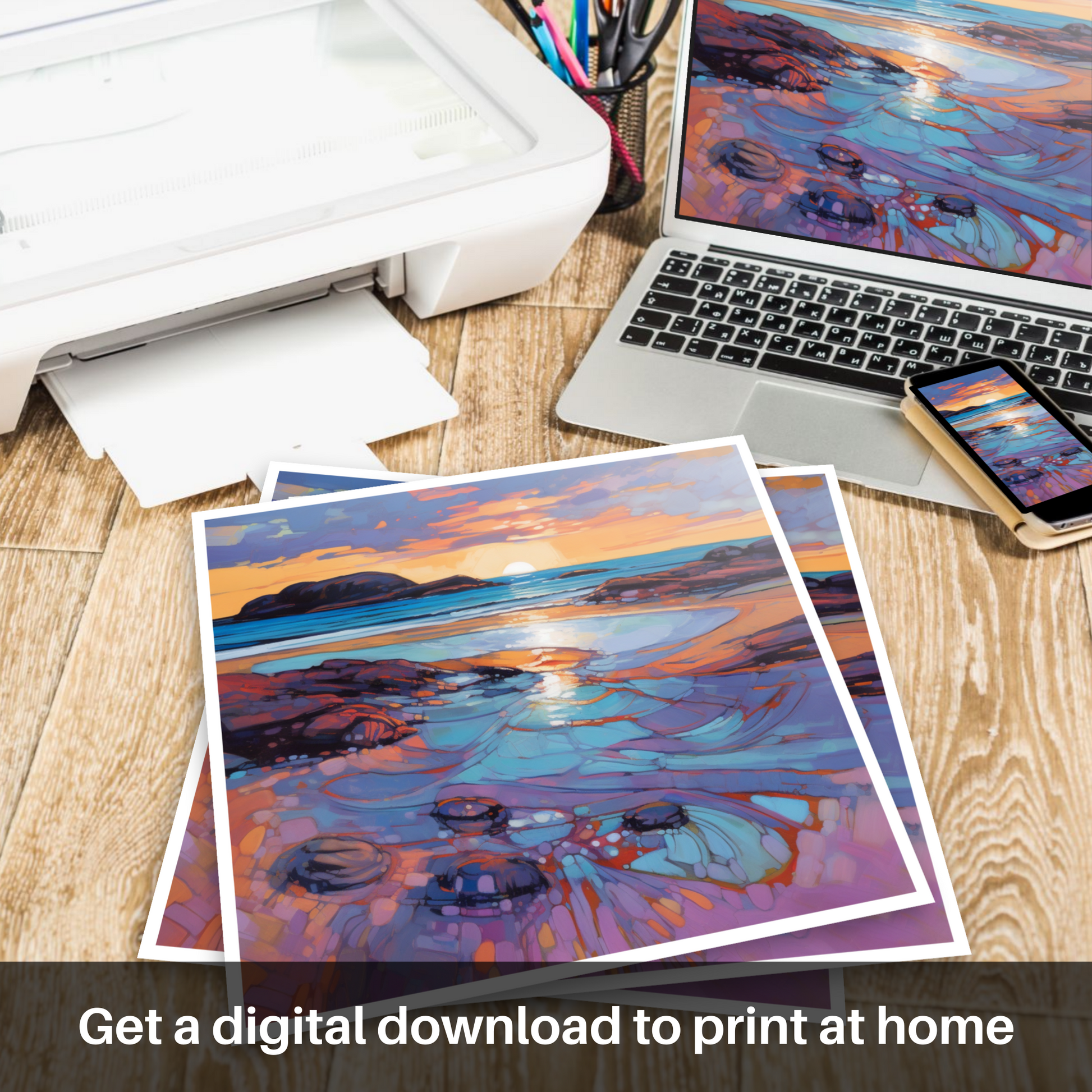 Capture the essence of Scottish coastal beauty with this exquisite piece, which draws its inspiration from the serene shores of Traigh Mhor at the magical hour of dusk. As the sun dips low on the horizon, the sky transforms into a canvas of mesmerising hues, with splashes of crimson, amber and gold mingling with shades of lilac and soft blue. Beneath this heavenscape, the tranquil sea whispers tales of the day's end, its surface reflecting the sunset's myriad of colours.