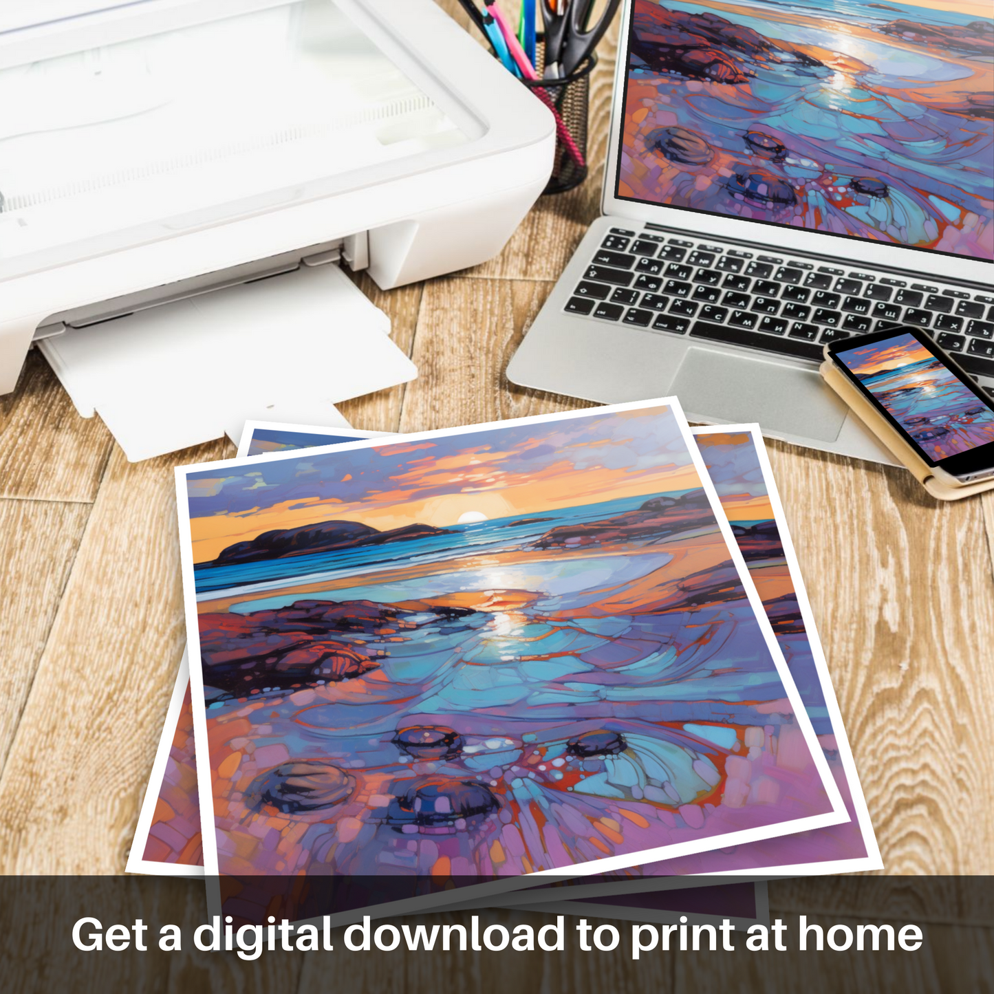 In the foreground, the visual journey commences with swaths of gentle blue and violet that caress the water-worn pebbles scattered across the sand, encapsulating the cool, twilight serenity. The eye is then drawn across the intricate network of wet sand and pooling tide, where harmonious swirls mimic the fluid dance of the sea's retreating waves. The bold, expressive strokes characteristic of modern impressionism instill a vibrant dynamism into the composition, creating a startlingly vivid yet dreamlike vista.