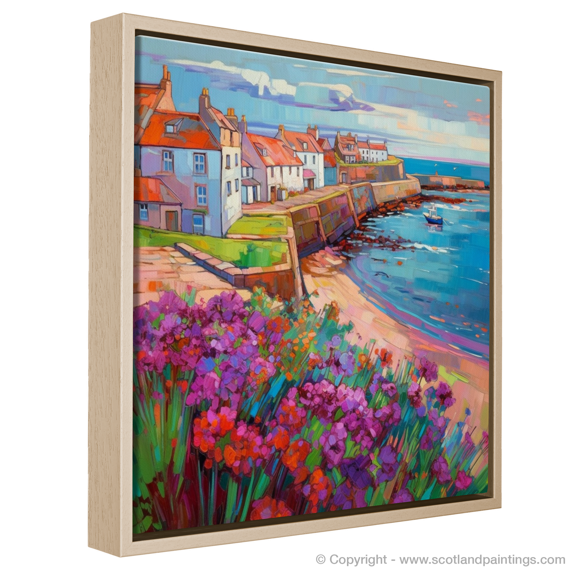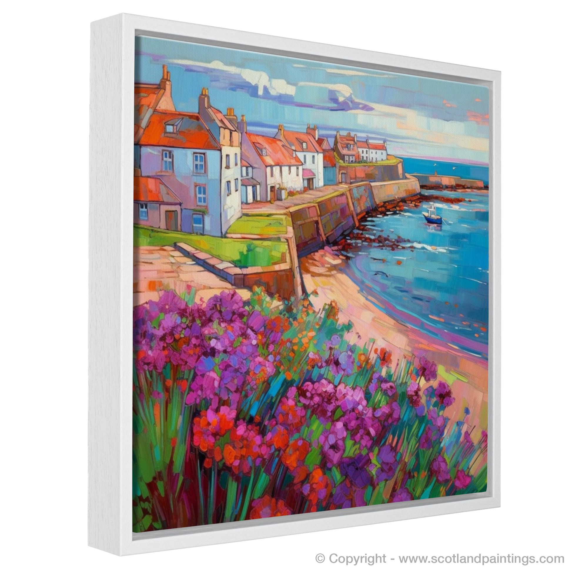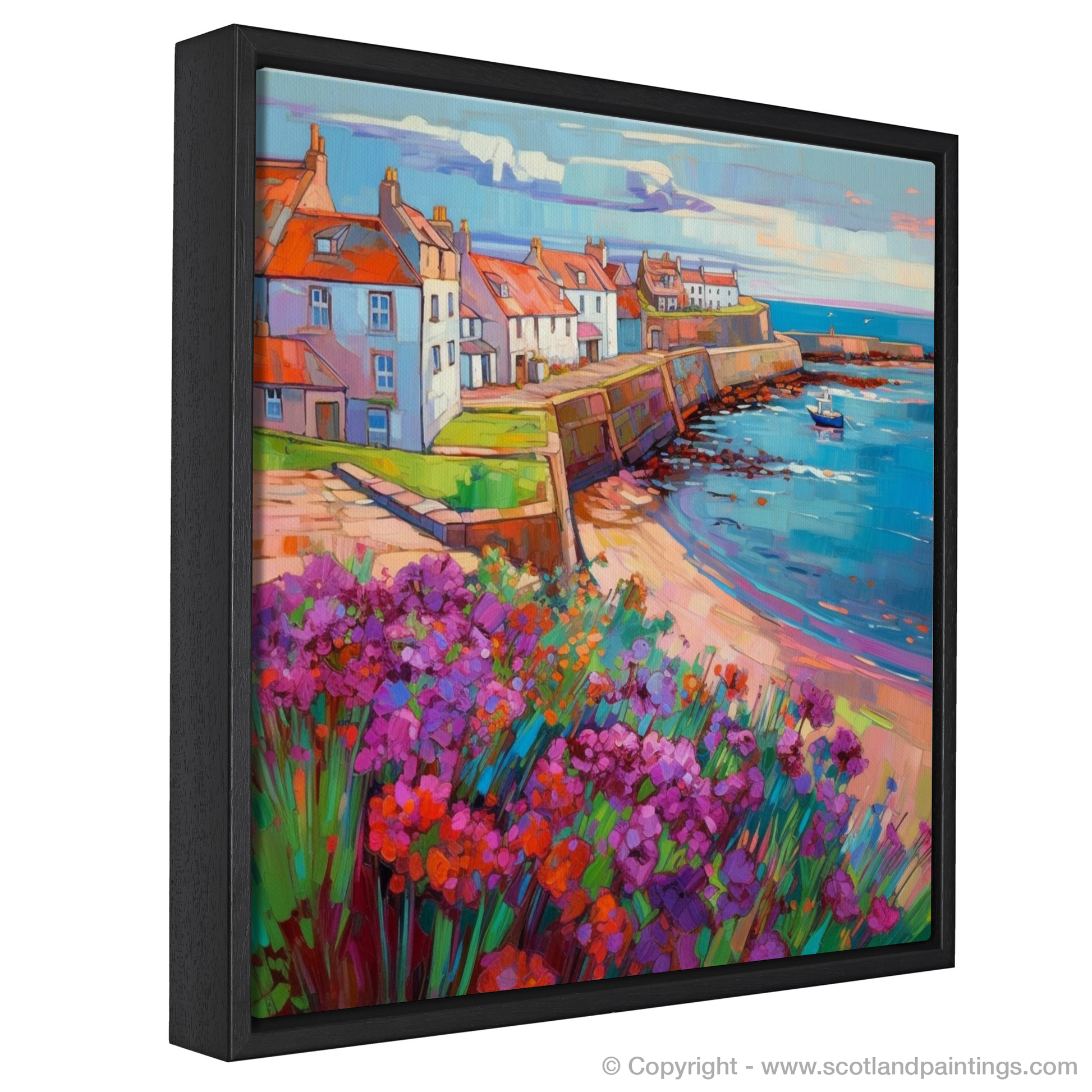Capturing the essence of Elie, Fife, with a vibrant splash of colour and bold brushstrokes, this enchanting piece evokes the charms of Scottish village life as if kissed by the whimsy of modern impressionism. Your senses are greeted with a foreground of vivacious purple flowers, their petals a dance of light and shadow, suggesting the untamed beauty of the village's natural surroundings. This floral display gives way to a serene coastal view, where clustered, quaint homes in delightful pastels line the curving shoreline.