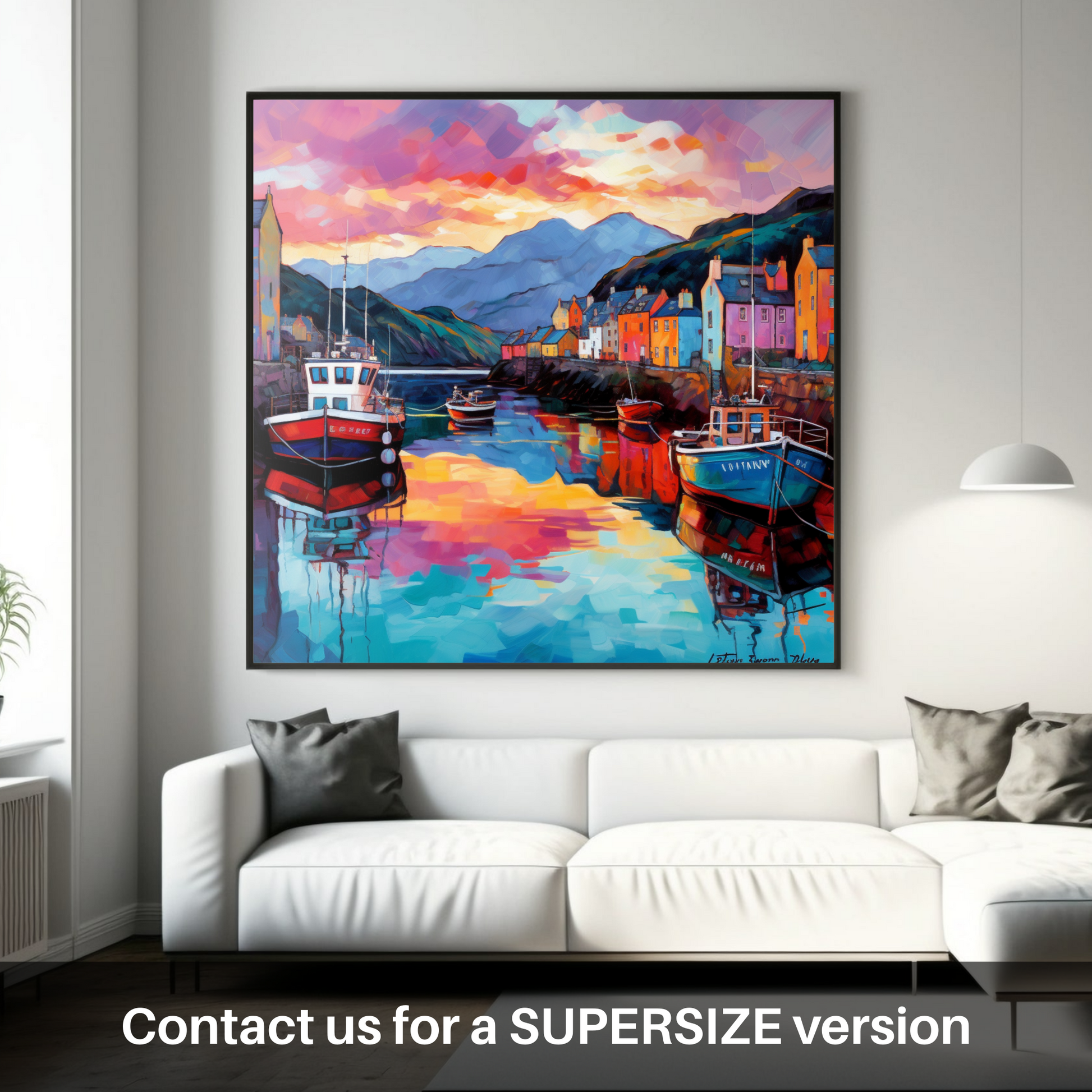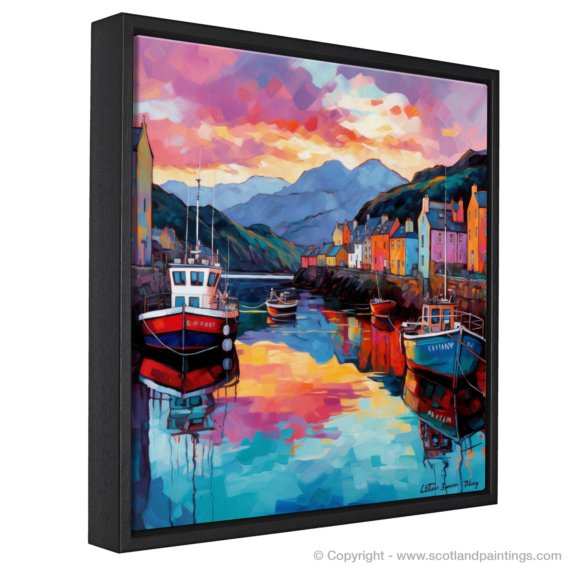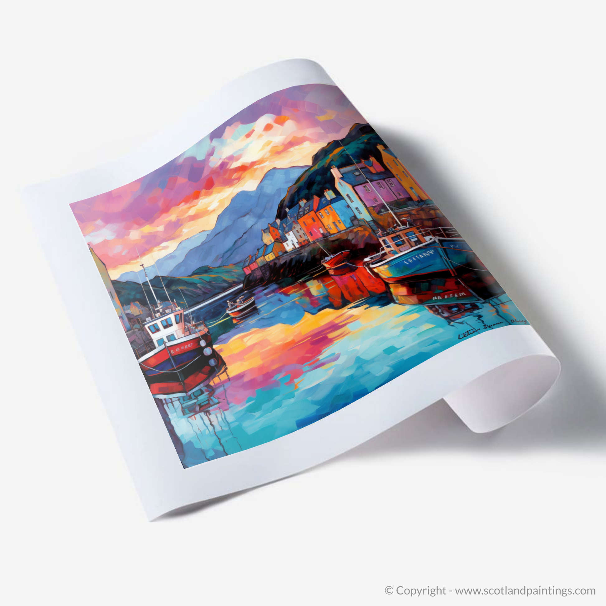 Capturing the vibrant essence of Mallaig Harbour bathed in the fiery glow of sunset, this exquisite print is a treasure trove of colour and light, an ode to the beauty of Scotland's maritime heritage. The harbour, a bustling nexus of Scottish seafaring, is masterfully rendered in bold, sweeping strokes that echo the Modern Impressionistic style, imbuing the scene with a sense of movement and life.