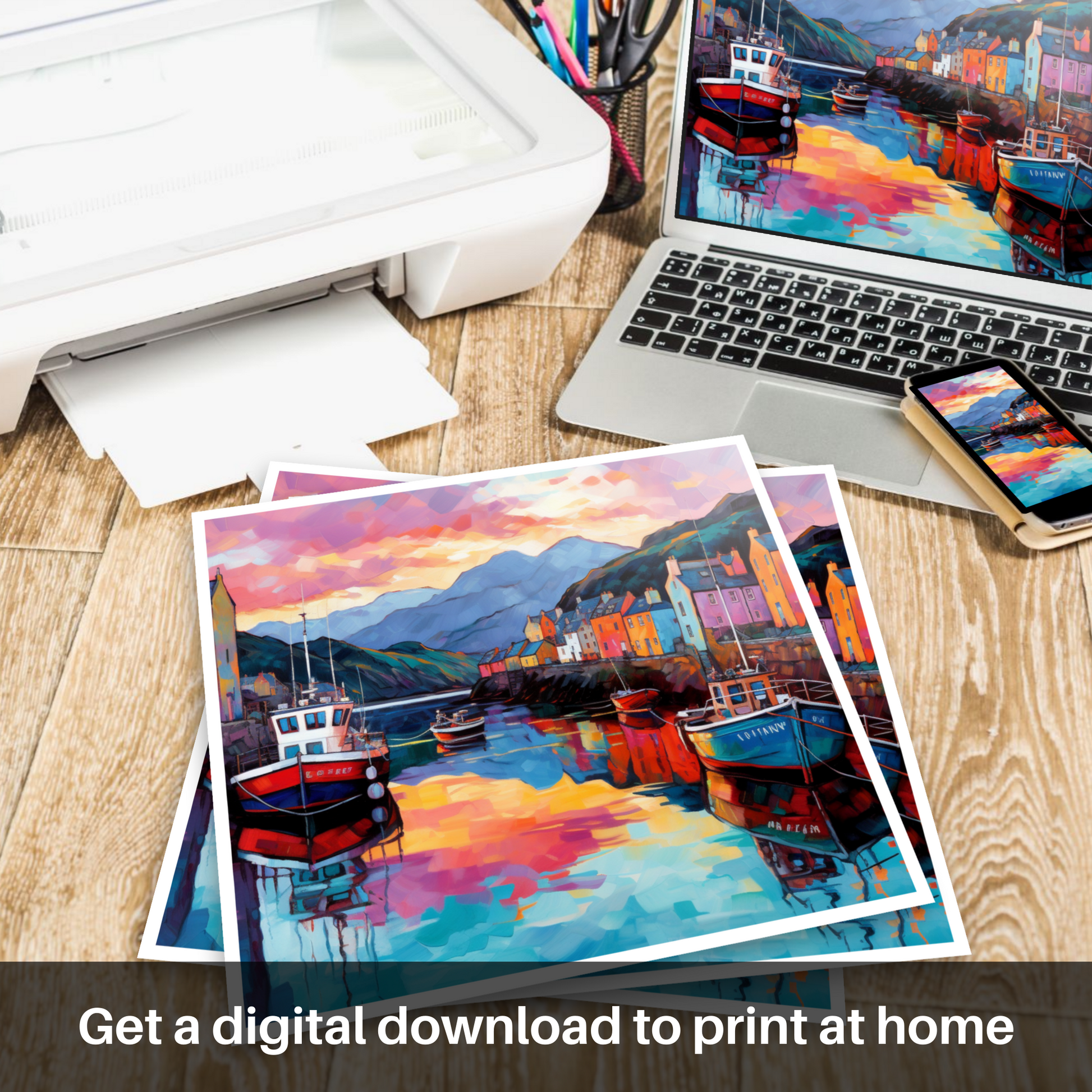 The quaint buildings lining the harbour are aglow with warm oranges, pinks, and yellows, reflecting the sun's last rays, their cheerful facades suggesting a welcoming community nestled in the embrace of the distant, softly silhouetted hills. This medley of colour and form captures not only the visual splendour but also the soul of Scottish Harbours; a place where the timeless dance of land, sea, and sky is beautifully intertwined.