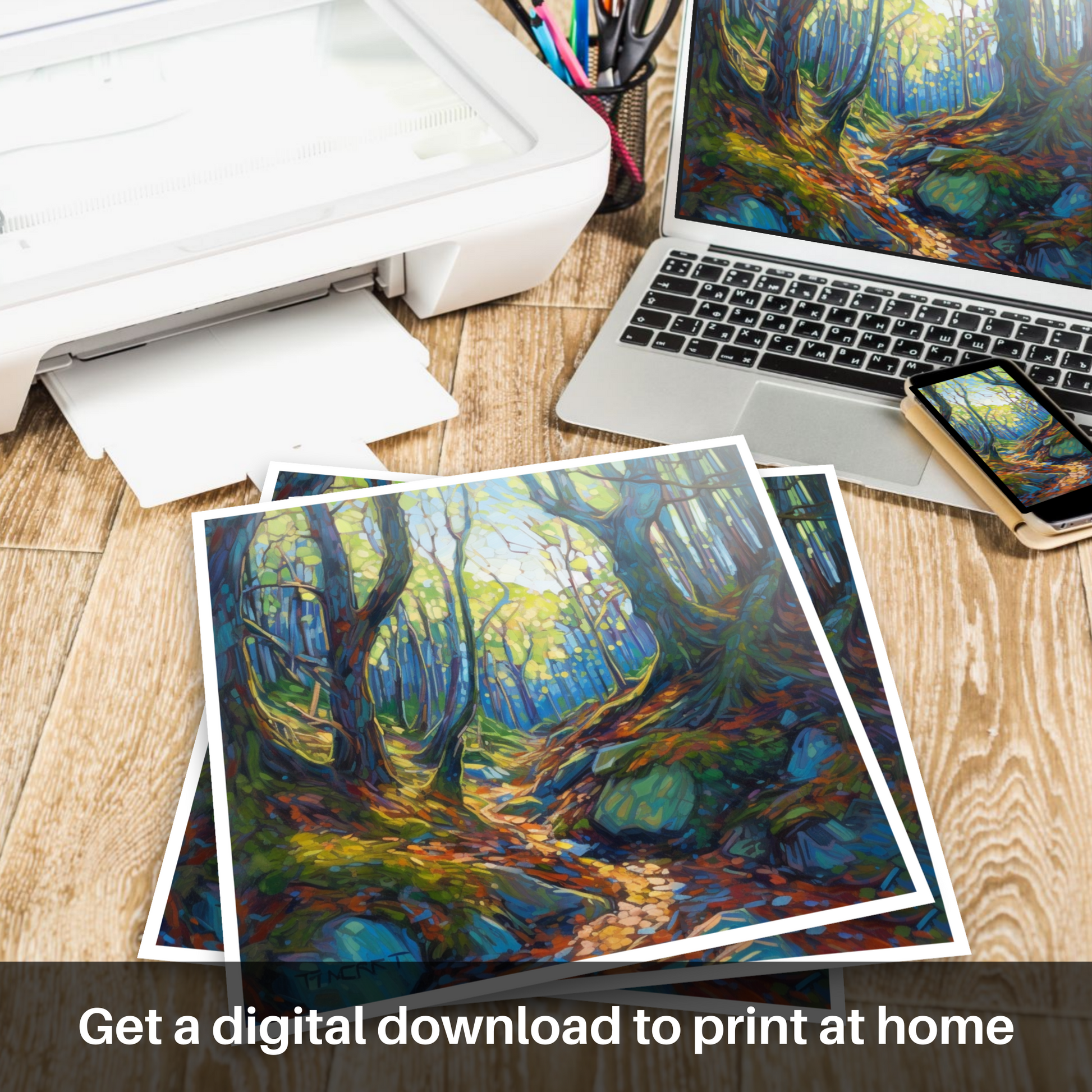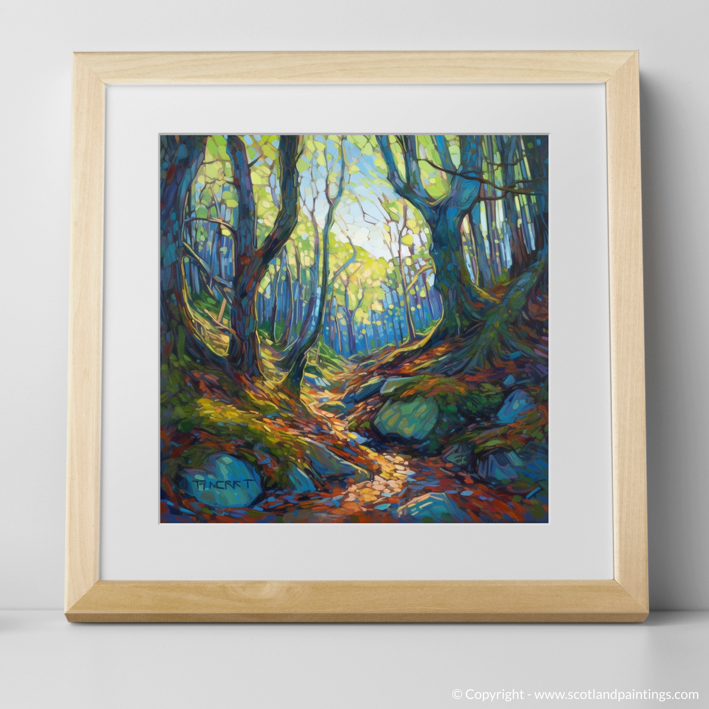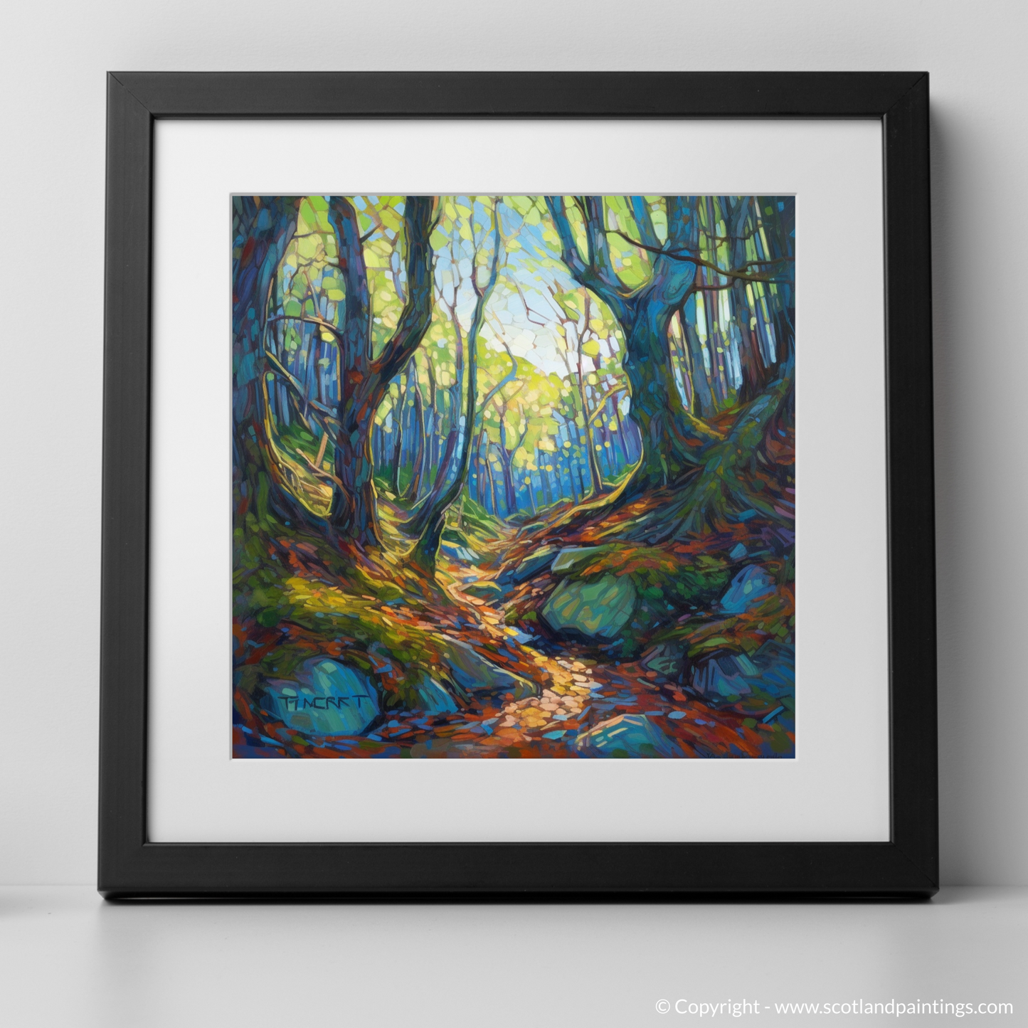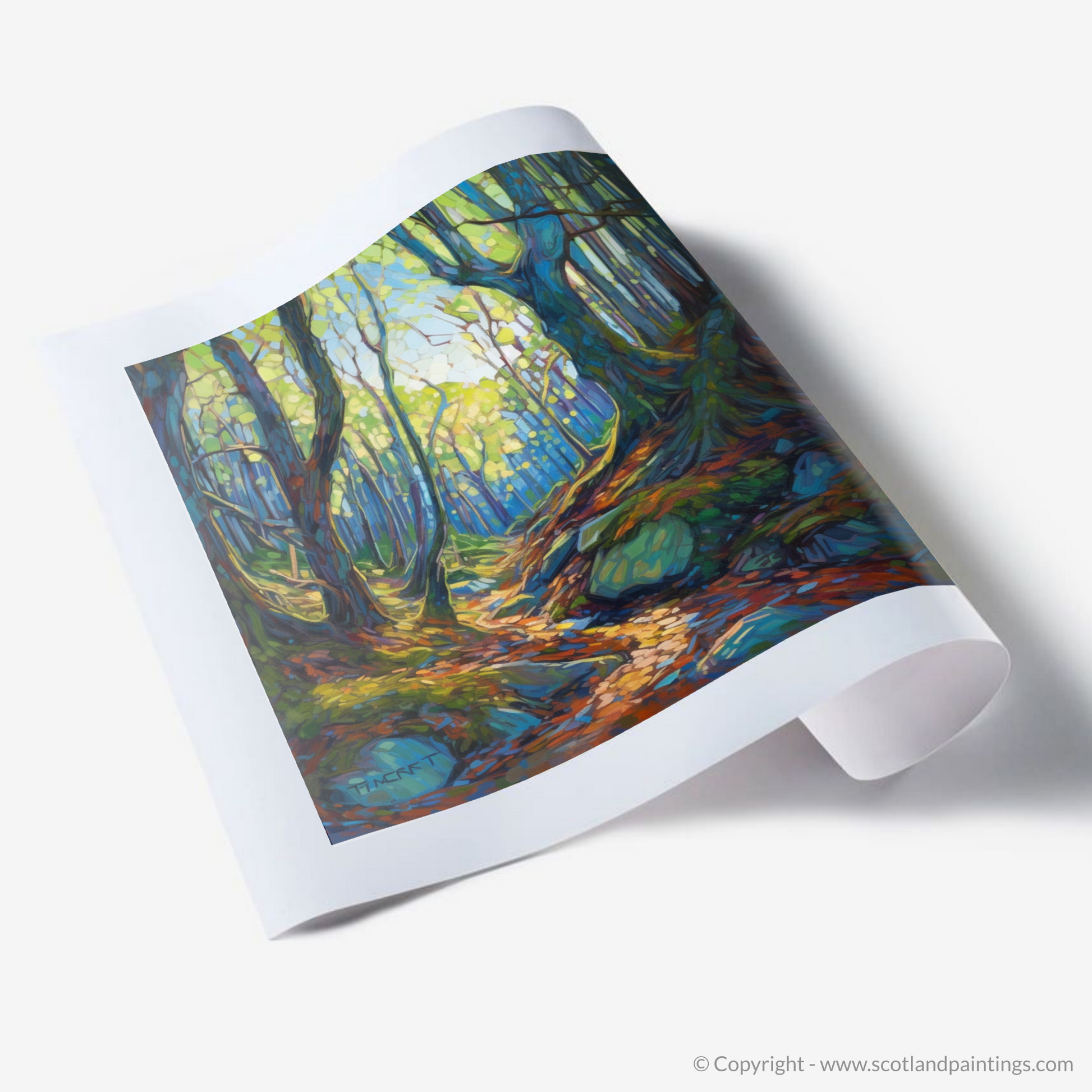 Embark on a visual journey through the enchanting Glenmore Forest Park, captured in an exquisite print that beckons with the vibrant hues and dynamic brushwork characteristic of Modern Impressionism. The scene is a symphony of colour, with robust blues and greens dominating the forest, as if nature herself has dabbed her palette across the canvas of the Scottish Highlands.