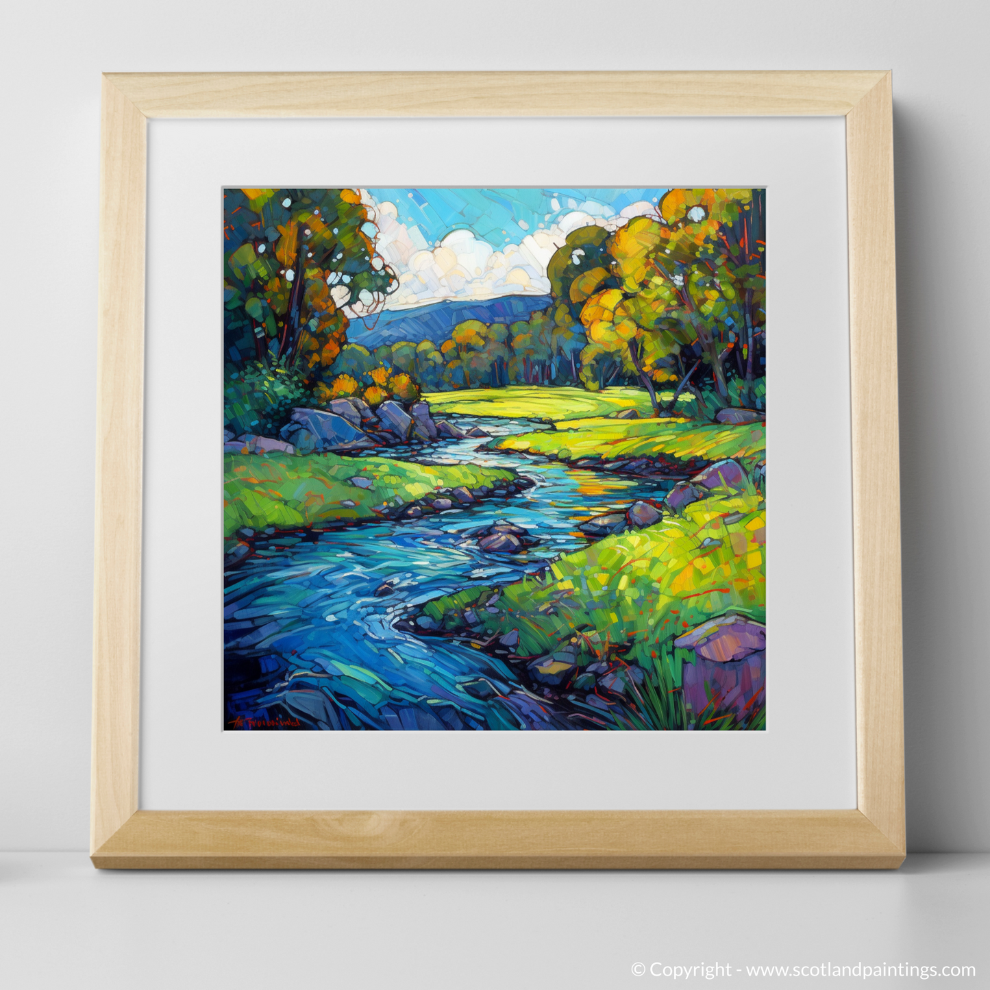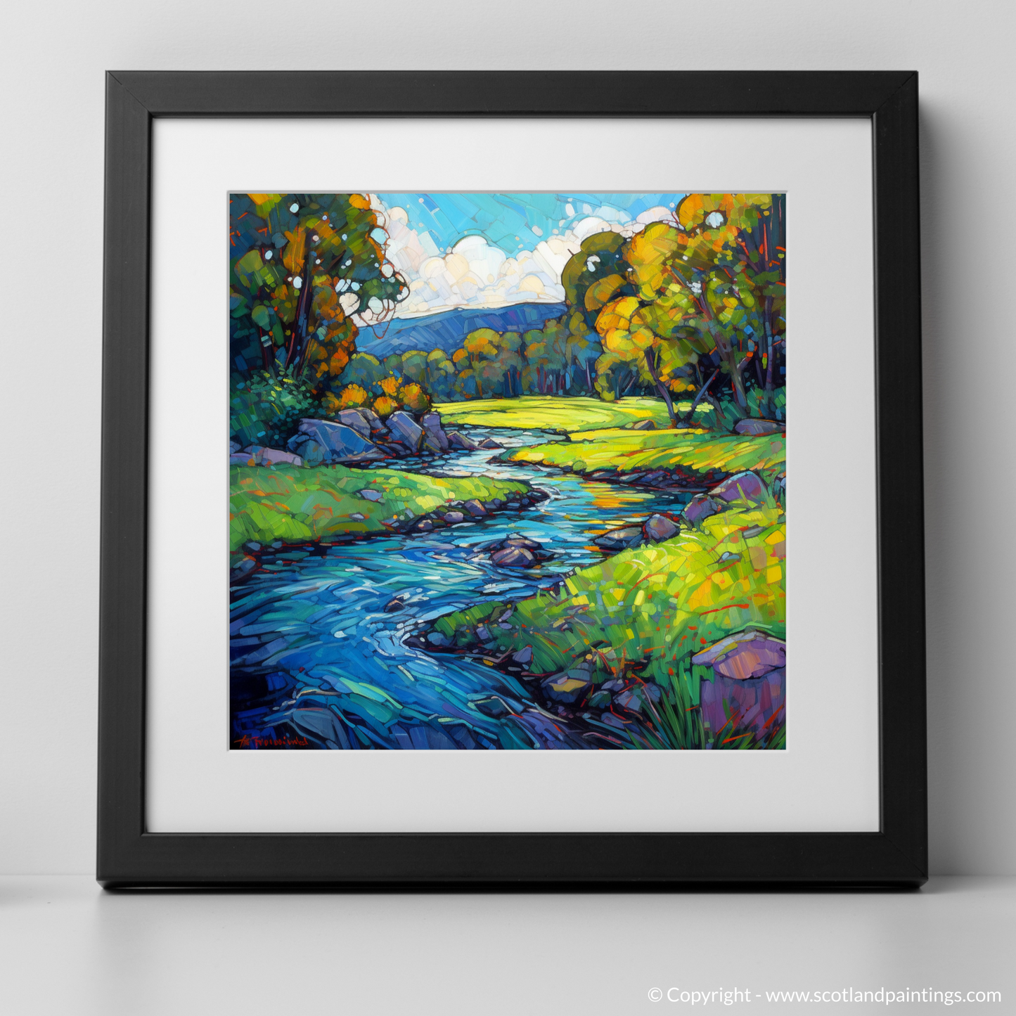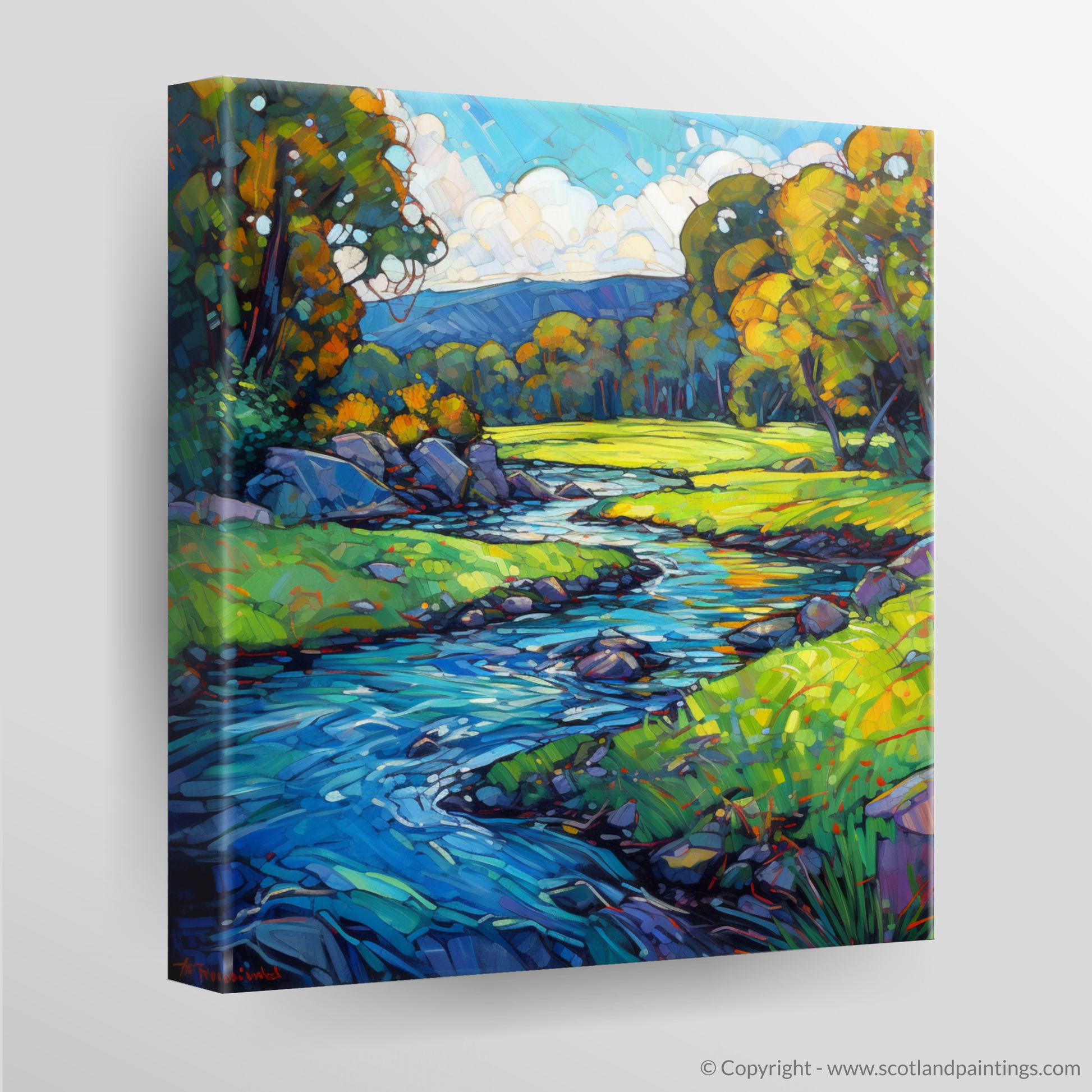 Immerse yourself in the luminous beauty of the River Lyon as it meanders through the verdant landscape of Perthshire. This captivating piece is a vibrant testament to the essence of Modern Impressionism, where bold strokes and lively colours come together to create an evocative and dynamic representation.