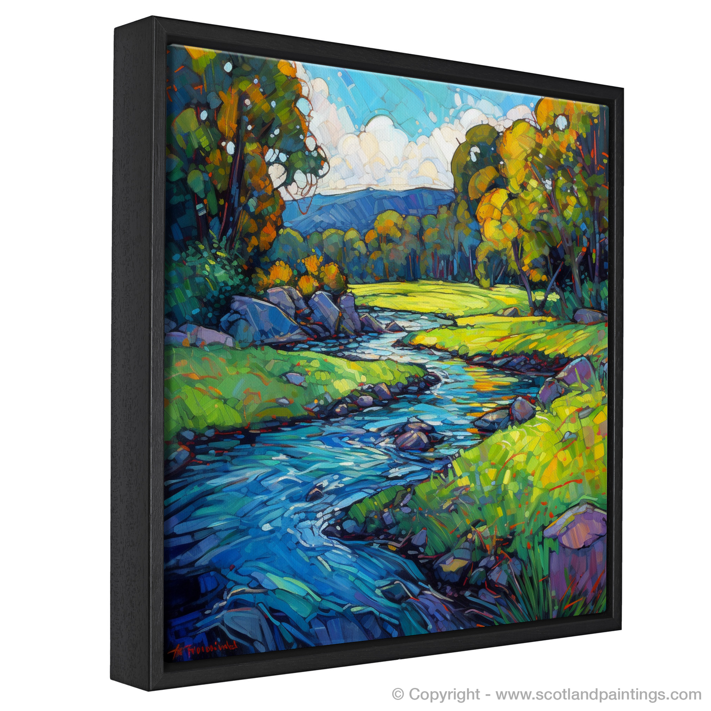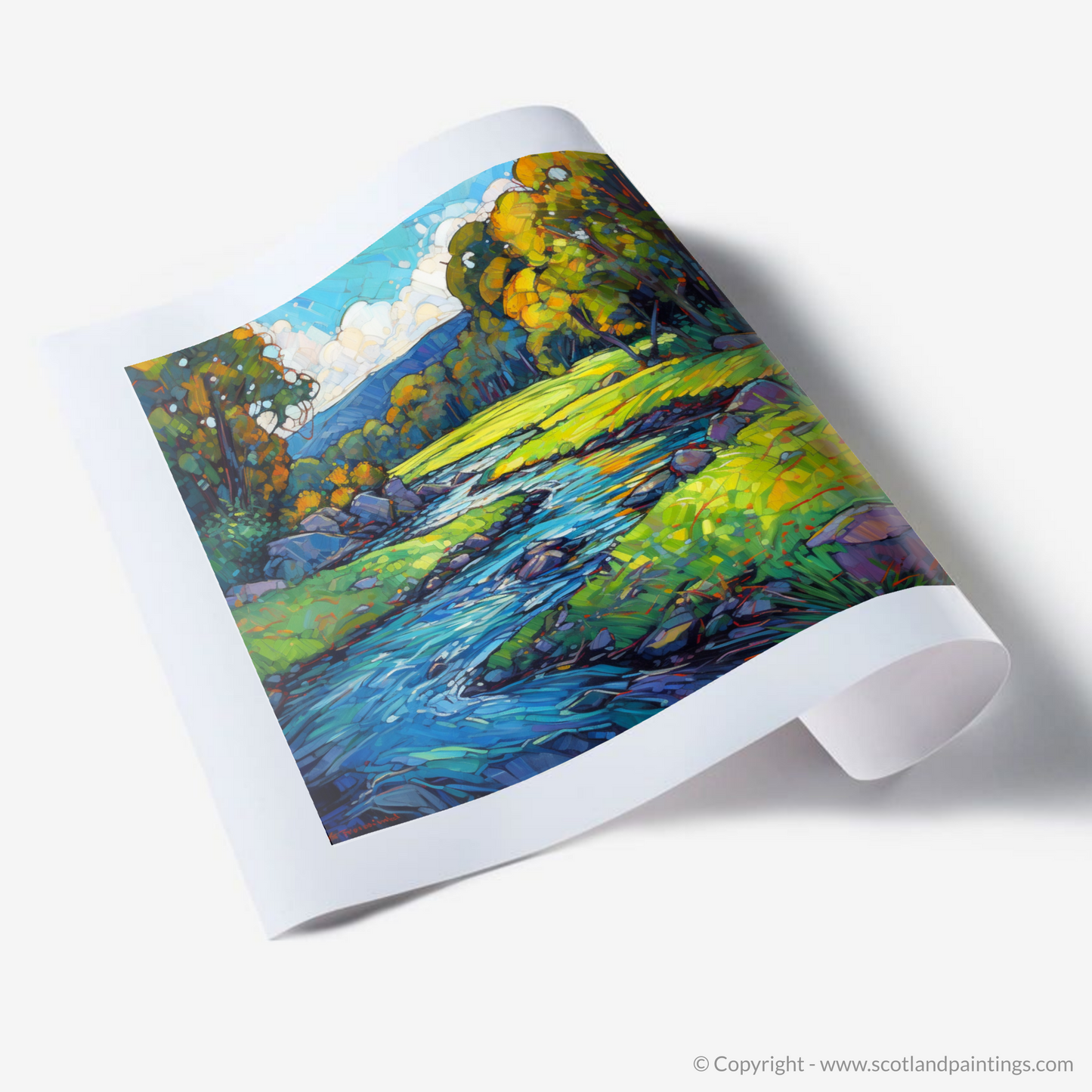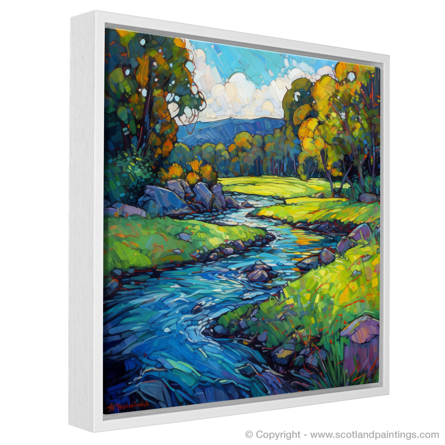 Immerse yourself in the luminous beauty of the River Lyon as it meanders through the verdant landscape of Perthshire. This captivating piece is a vibrant testament to the essence of Modern Impressionism, where bold strokes and lively colours come together to create an evocative and dynamic representation.