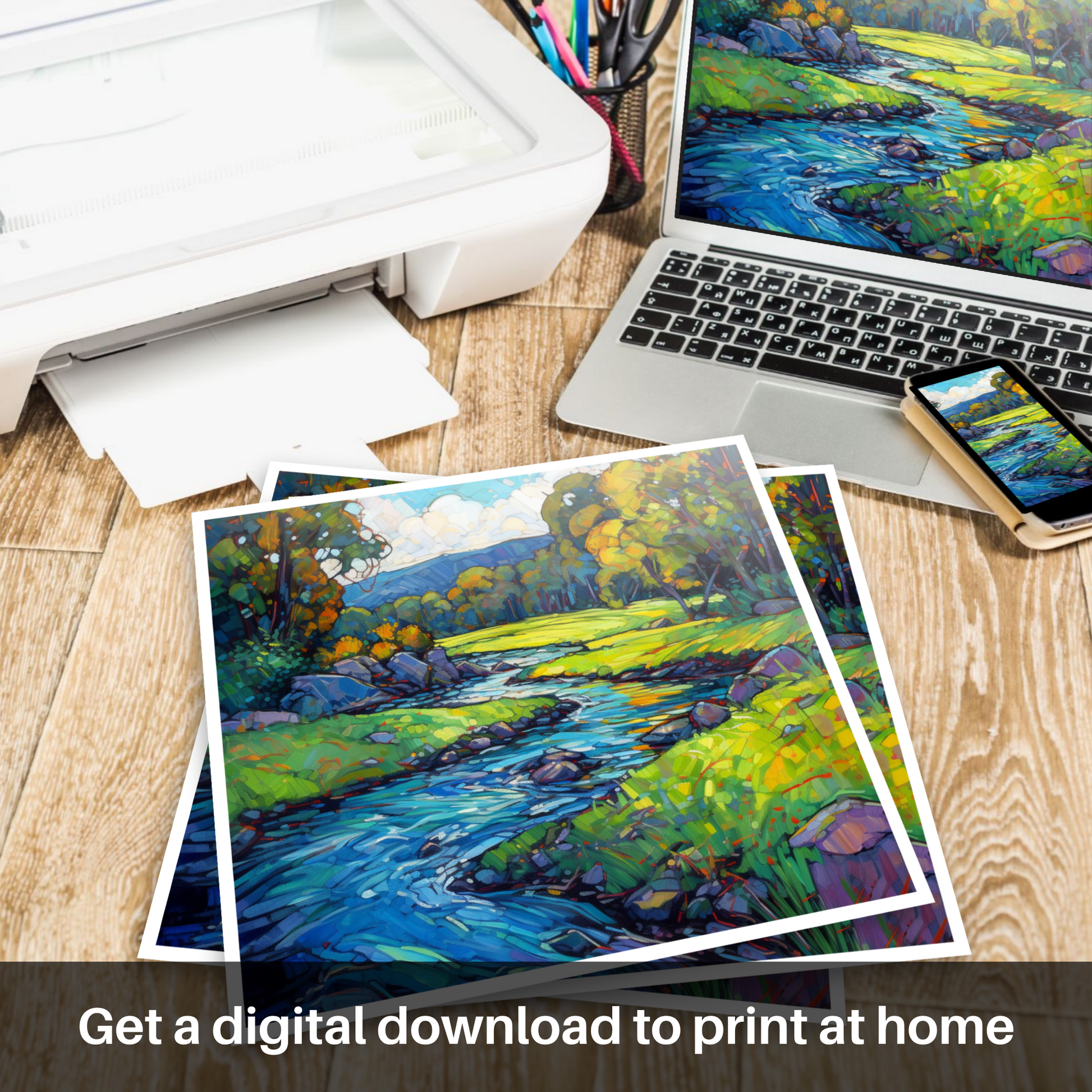This print is a celebration of Scottish landscapes, a scene that will evoke memories of crisp air and the tranquil sounds of flowing water. Whether to adorn a home or office, it serves not only as a piece of art but also as an invitation to pause and appreciate the mesmerising beauty of Scotland’s rivers and the timeless artistry that brings them to life on canvas.