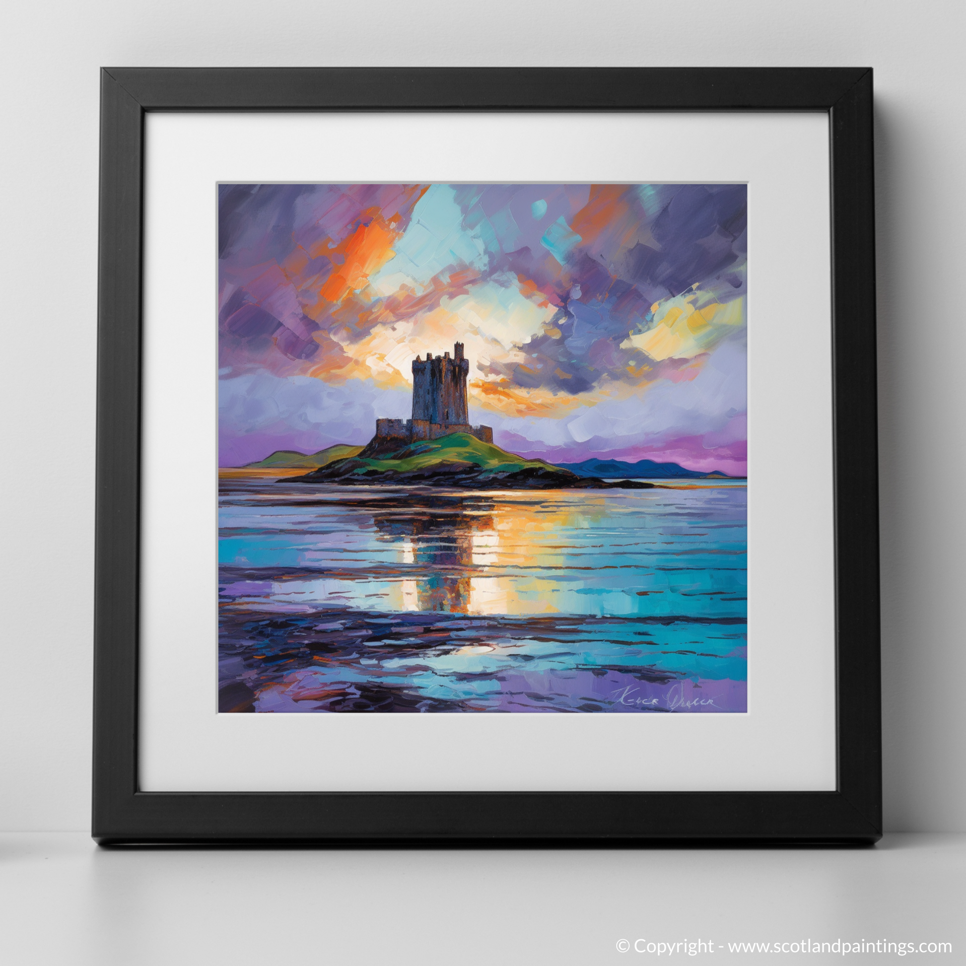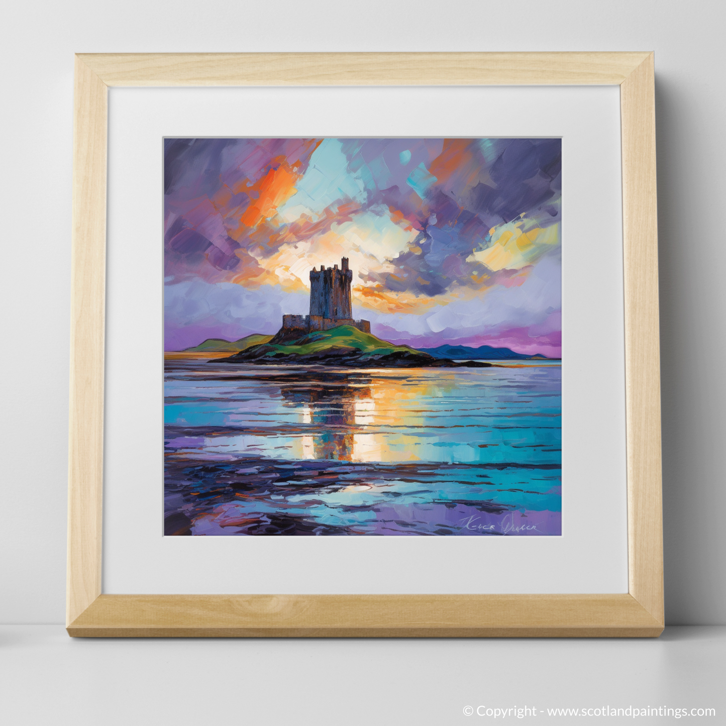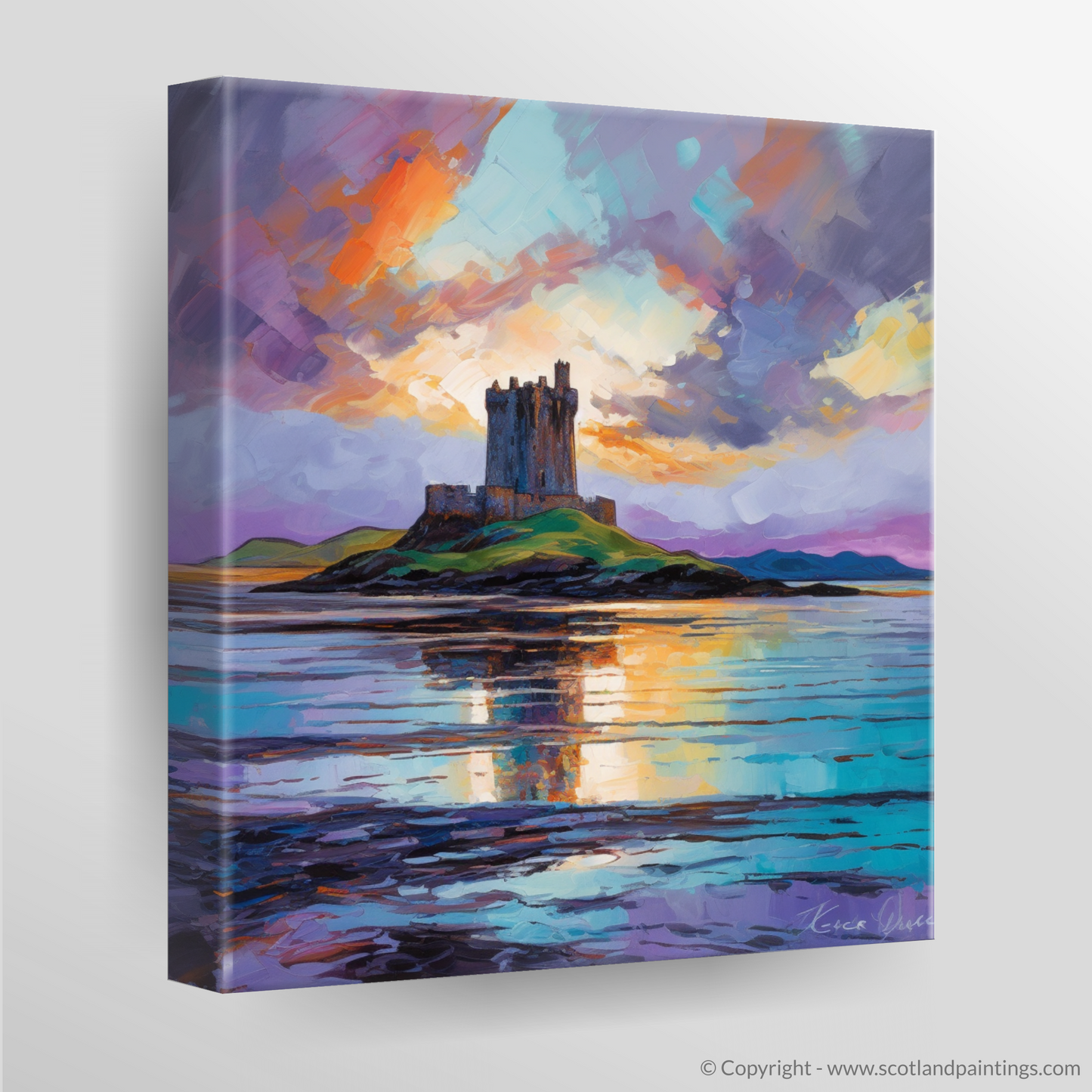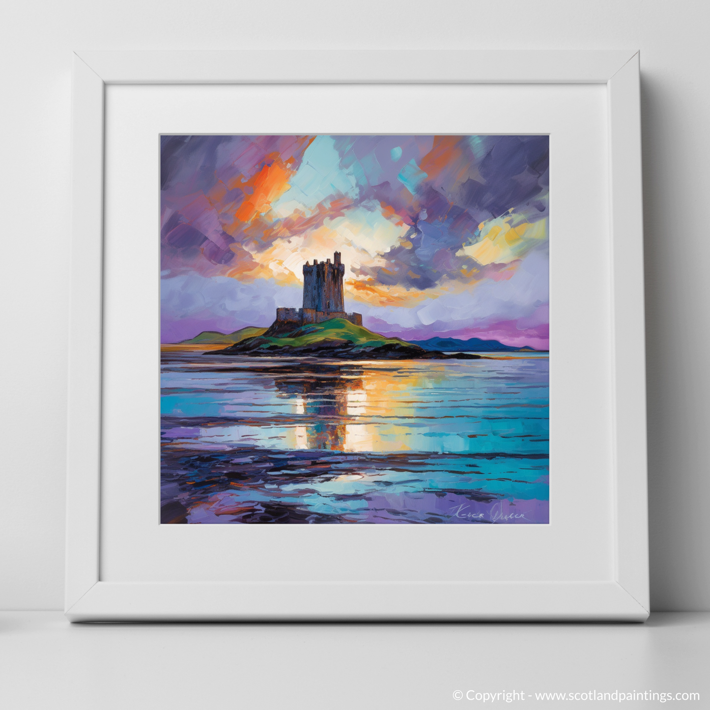 As if watching the drama of the heavens unfold through a kaleidoscope, this evocative representation captures the turbulent beauty of Castle Stalker Bay amidst a storm. Broad, expressive brushstrokes convey the movement of the stormy sky, where shades of violet, grey, and a sentiment of impending twilight battle with the hopeful oranges and yellows of a setting sun. The imposing silhouette of the castle stands resilient against the elements, its stark lines and stoic presence offering the only defiance to the chaos above.