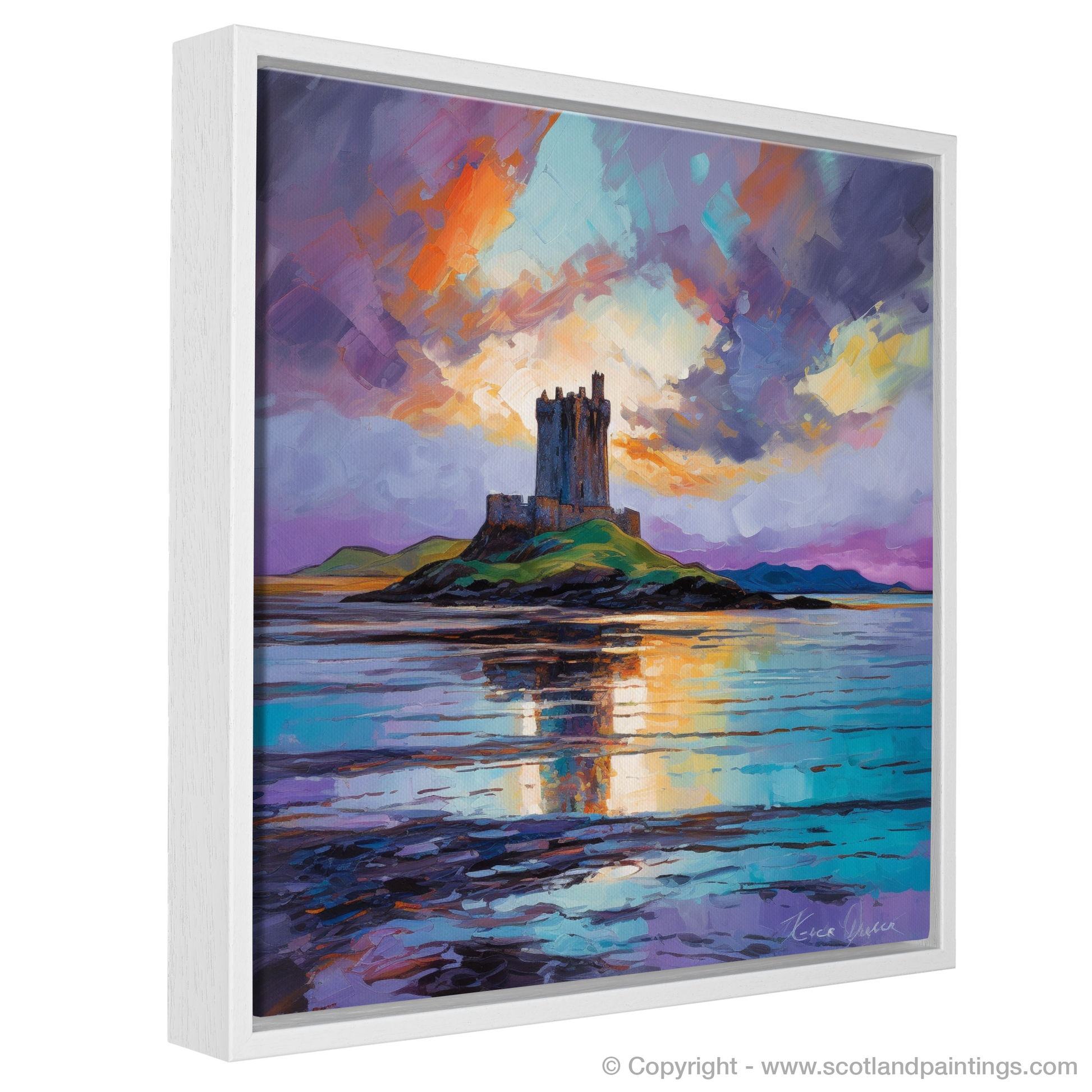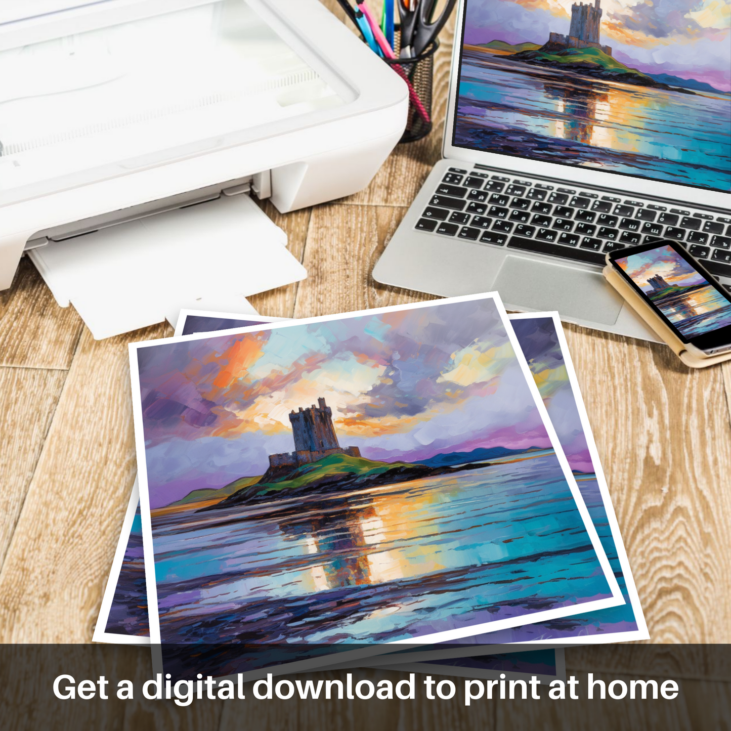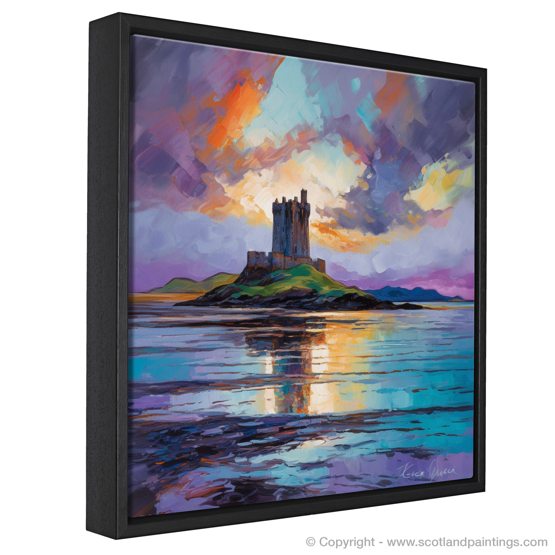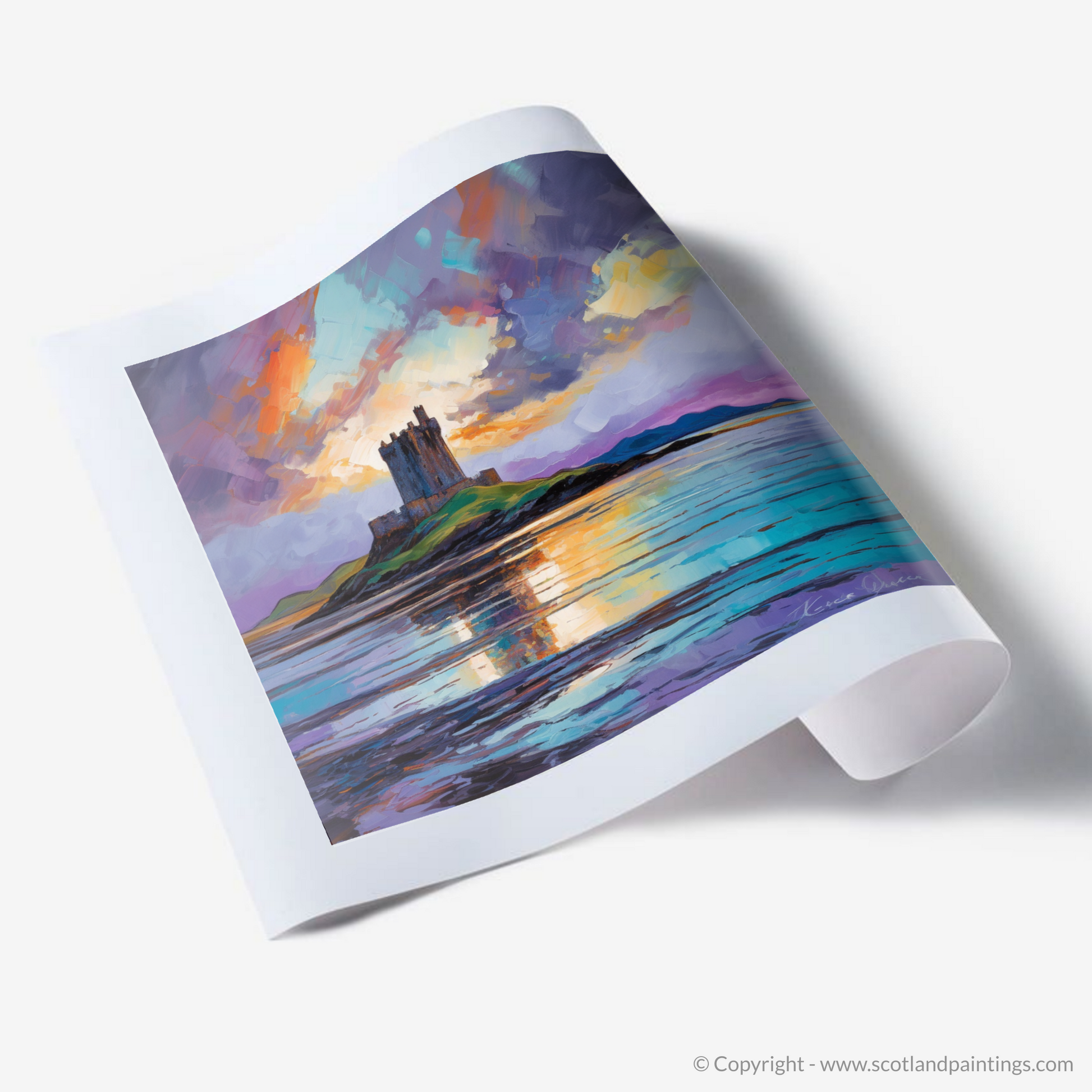 As if watching the drama of the heavens unfold through a kaleidoscope, this evocative representation captures the turbulent beauty of Castle Stalker Bay amidst a storm. Broad, expressive brushstrokes convey the movement of the stormy sky, where shades of violet, grey, and a sentiment of impending twilight battle with the hopeful oranges and yellows of a setting sun. The imposing silhouette of the castle stands resilient against the elements, its stark lines and stoic presence offering the only defiance to the chaos above.