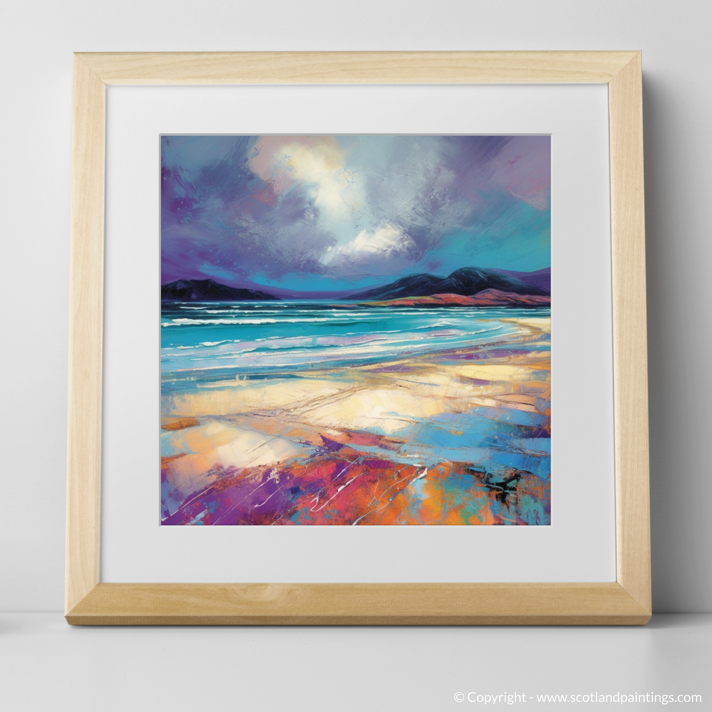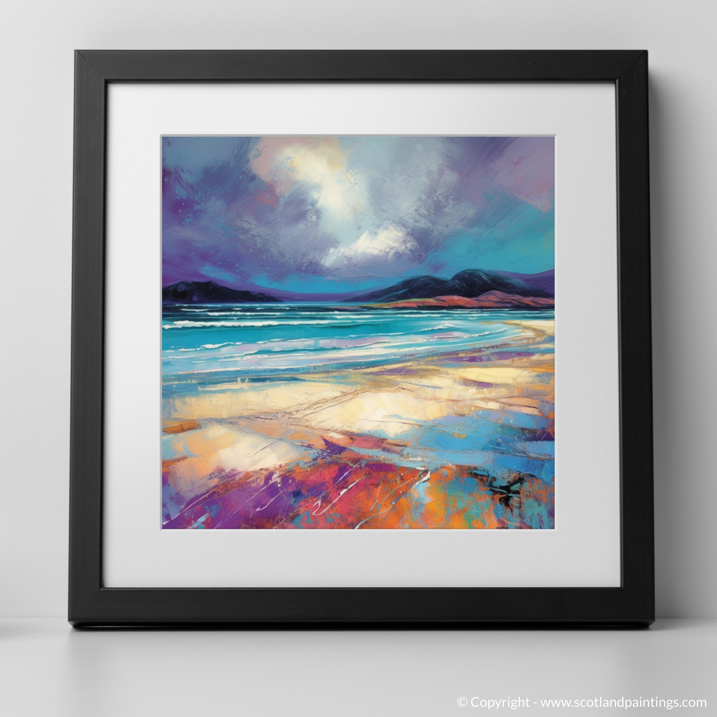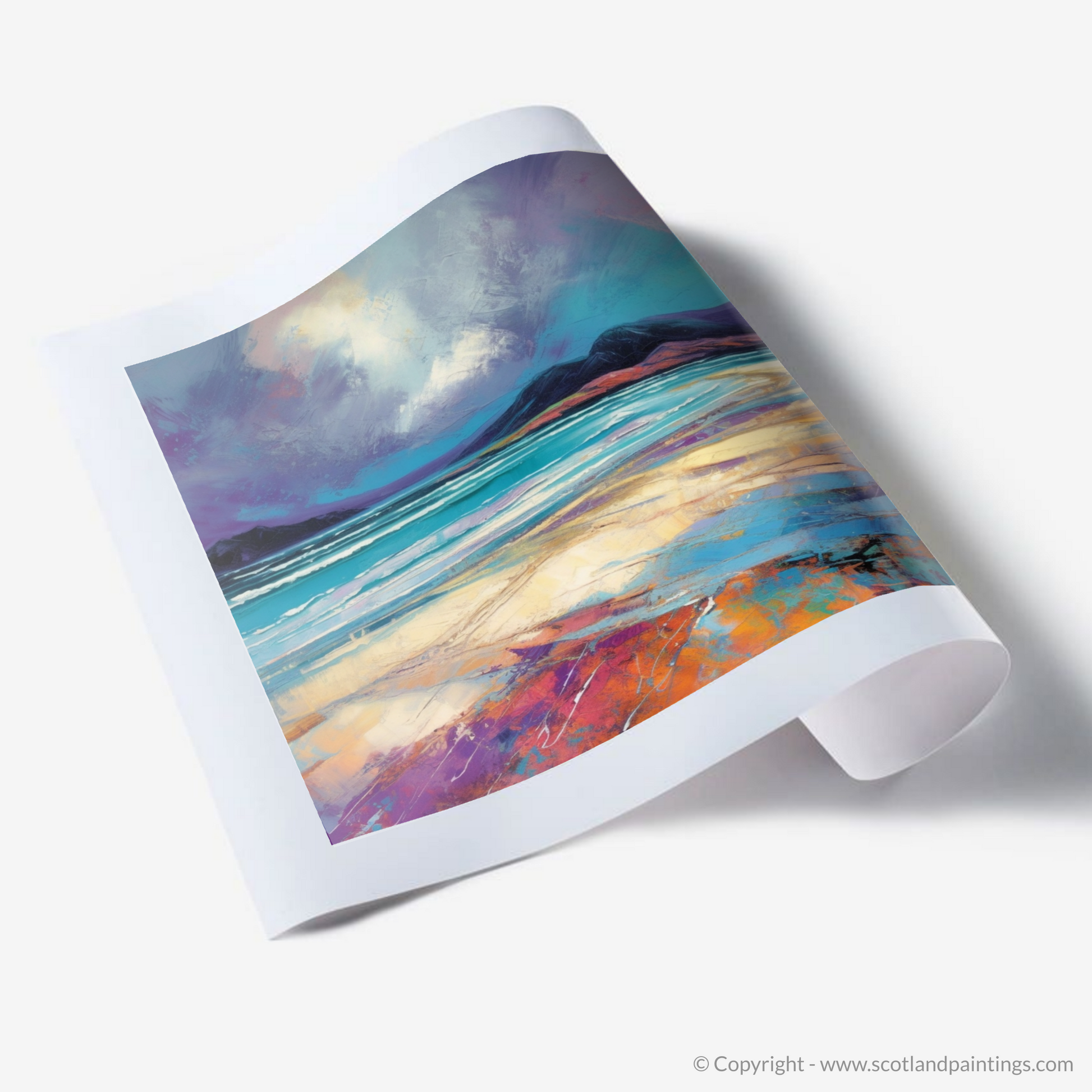 Immerse yourself in the ethereal tranquility of the Scottish coastline with this evocative print, capturing the untamed beauty of Luskentyre Sands. The dramatic brushstrokes of this Modern Impressionist-inspired piece convey the raw energy of an impending storm, as the tempestuous sky looms over the serene horizon with an intoxicating palette of purples and greys.
