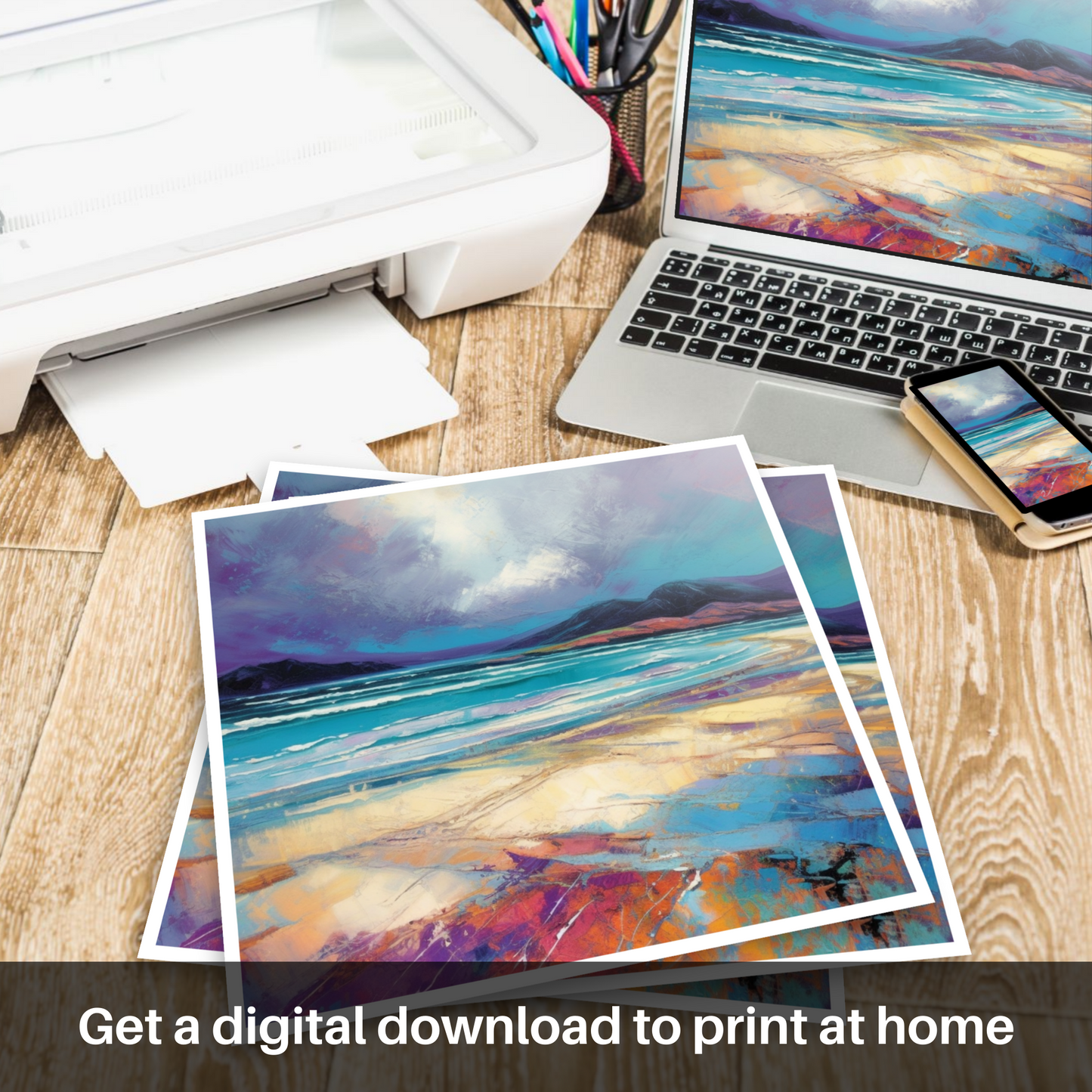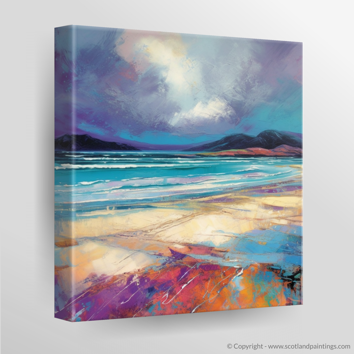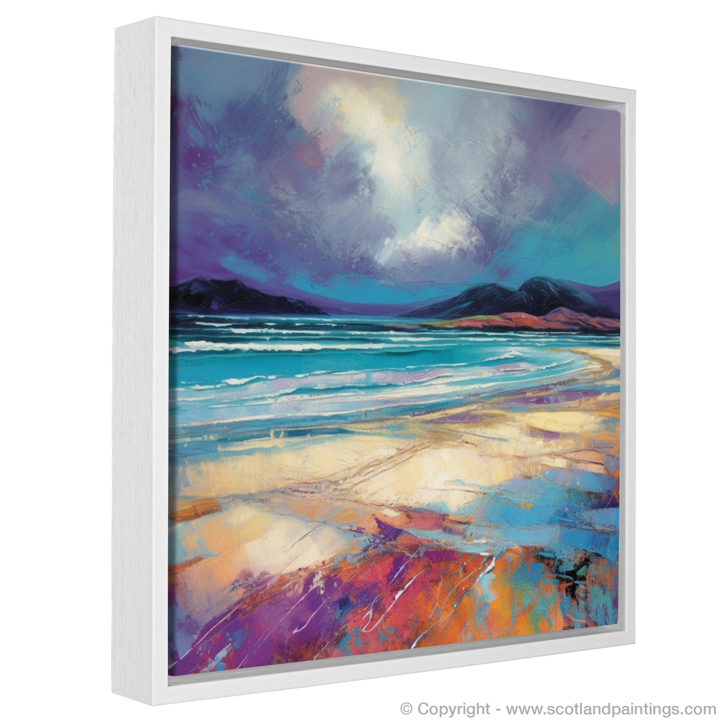 Immerse yourself in the ethereal tranquility of the Scottish coastline with this evocative print, capturing the untamed beauty of Luskentyre Sands. The dramatic brushstrokes of this Modern Impressionist-inspired piece convey the raw energy of an impending storm, as the tempestuous sky looms over the serene horizon with an intoxicating palette of purples and greys.