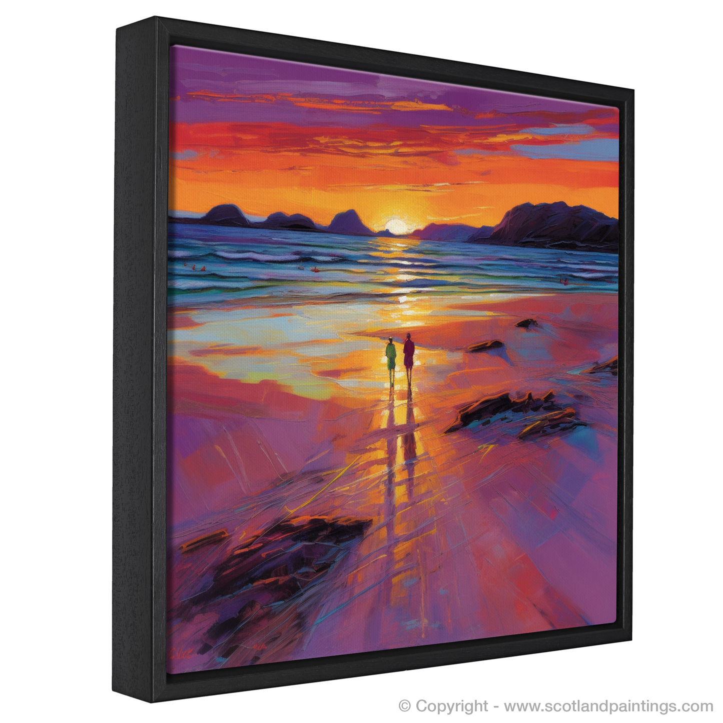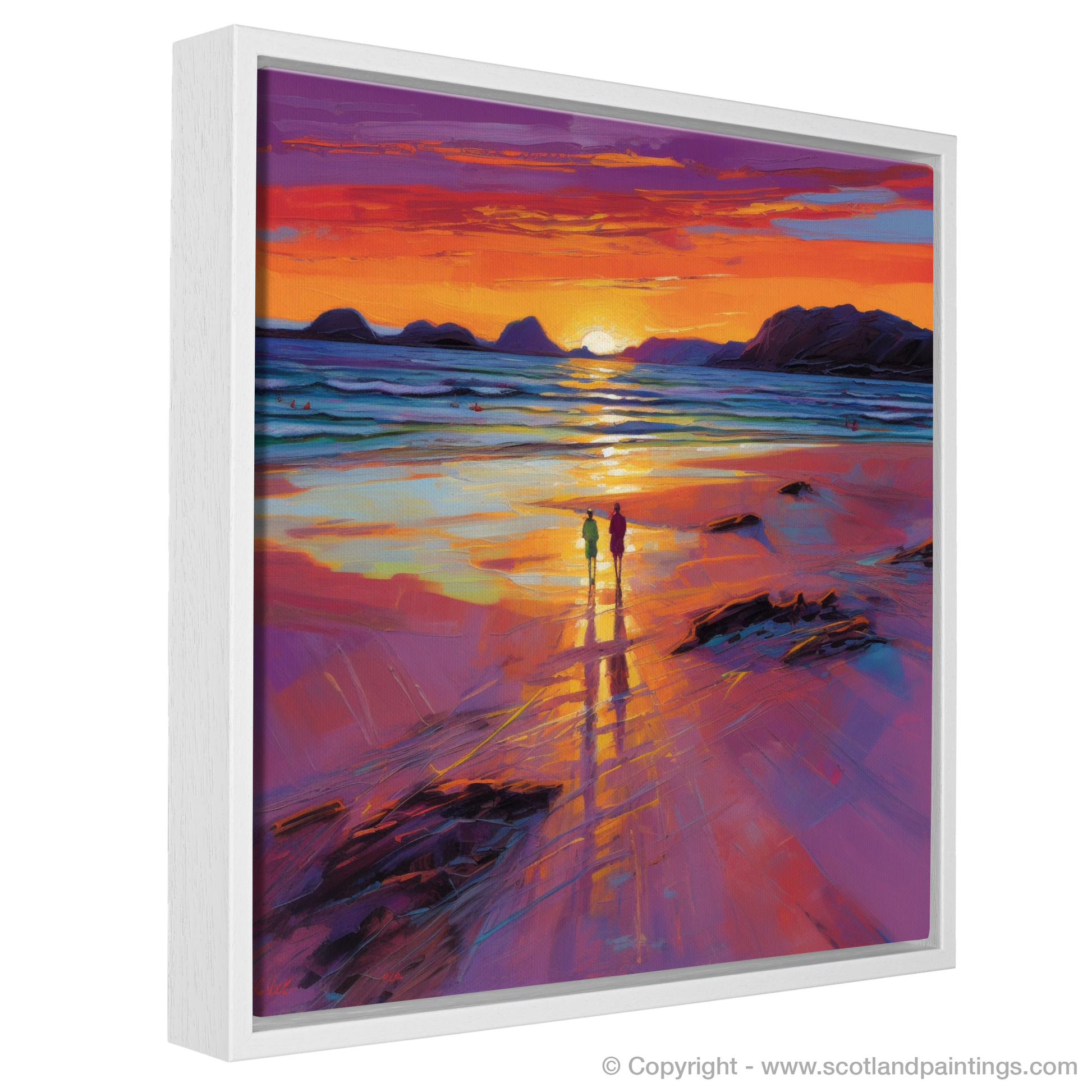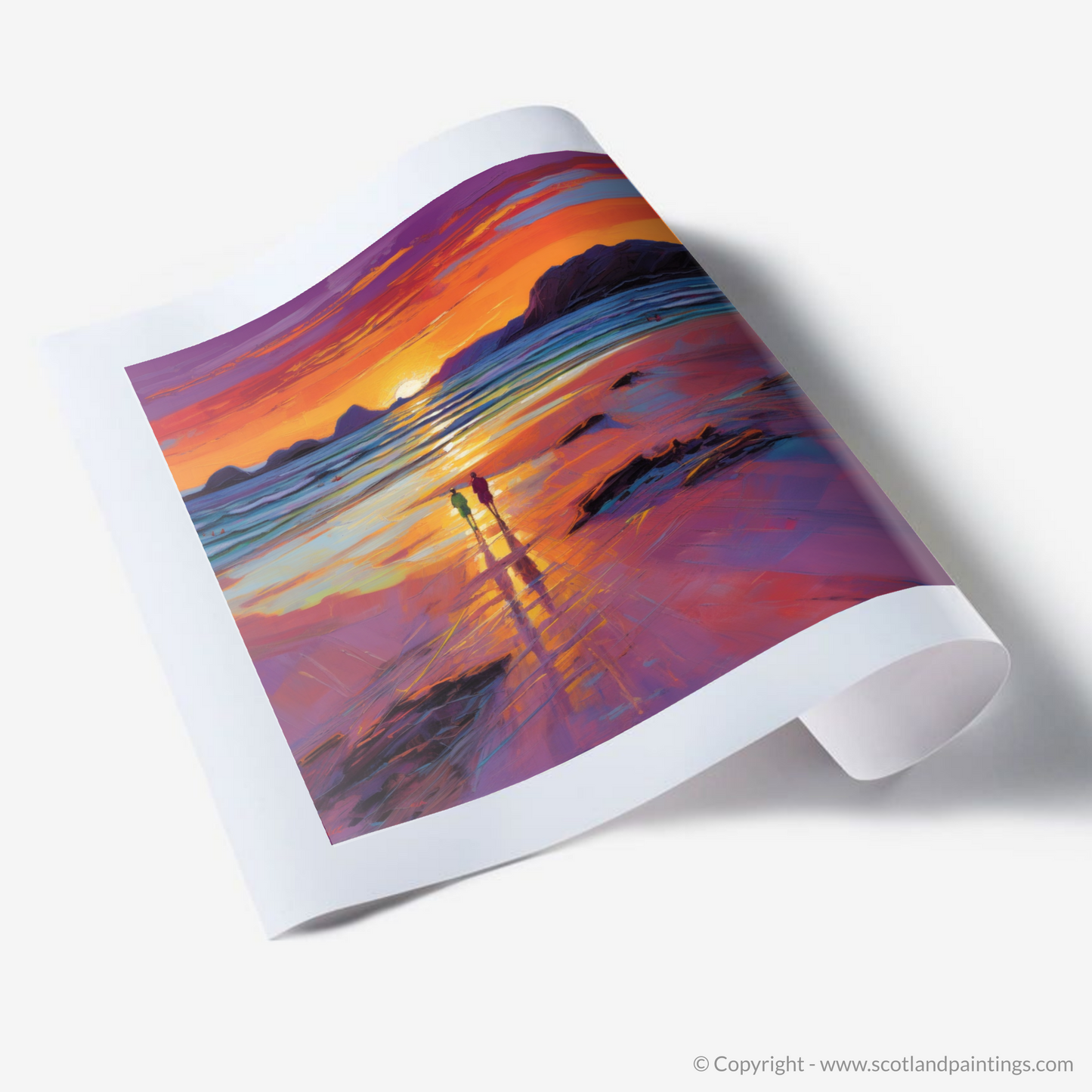 Bathed in the radiant glow of a setting sun, this evocative piece captures the magnificent allure of Mellon Udrigle Beach, a Scottish treasure nestled in the heart of the Highlands. With a palette dominated by warm hues of amber, crimson, and violet, the print conjures the magic of the hour when day tenderly gives way to night.