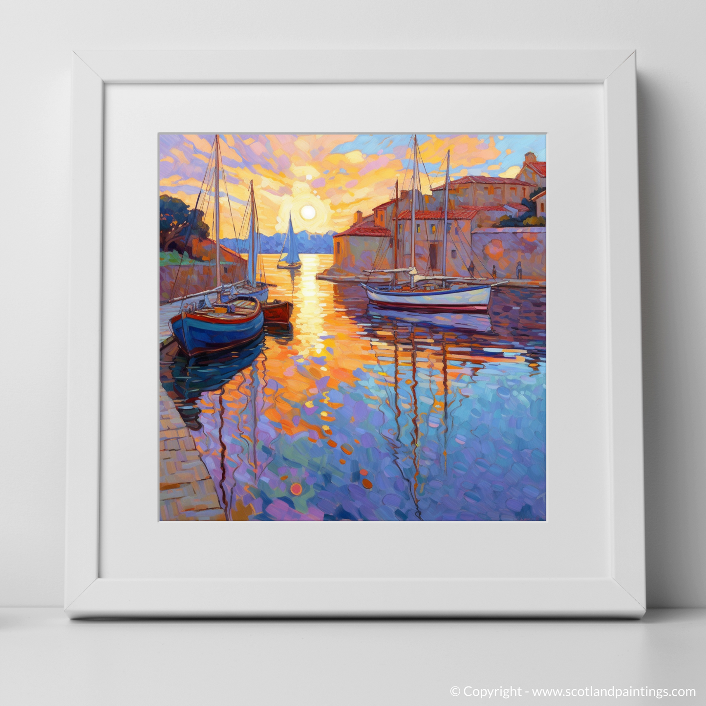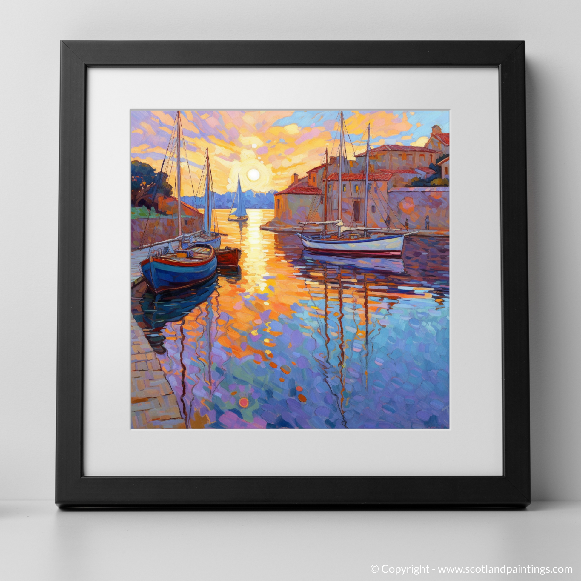 Rendered in what could be described as Modern Impressionism, the brushwork conveys movement and energy, while the expressive use of colour captures the fleeting, ephemeral moments of dusk. A kaleidoscope of reflected light skips across the print, as if the water itself were alive with the vibrancy of the scene, challenging the viewer to feel the very spirit of this coastal haven.