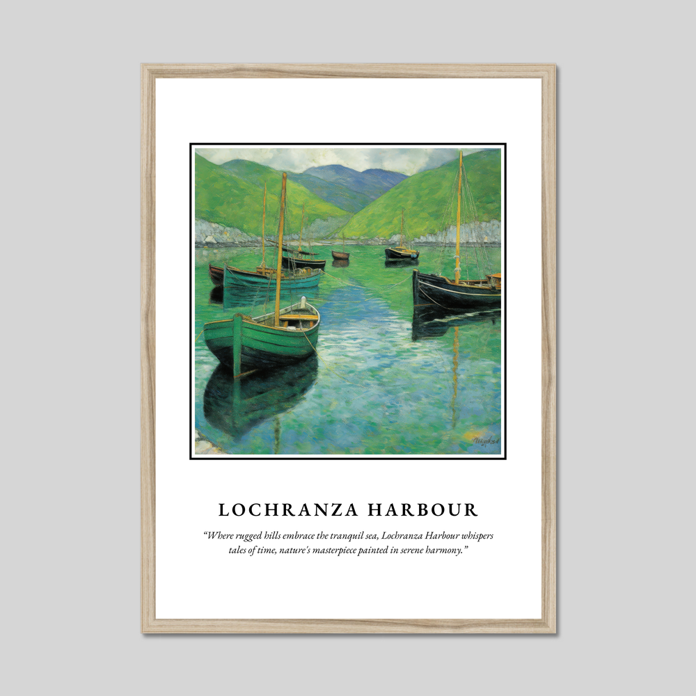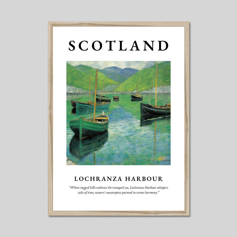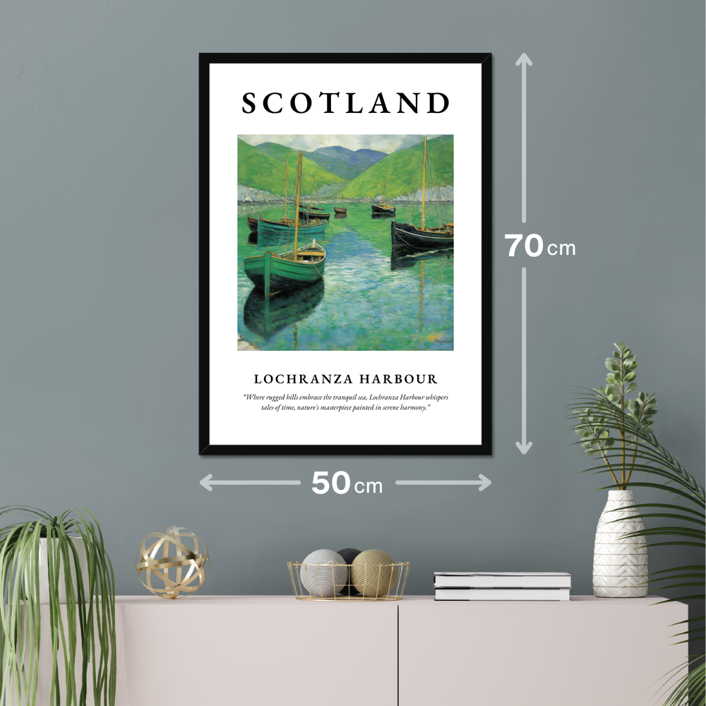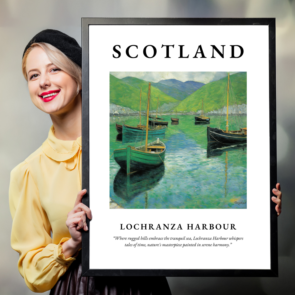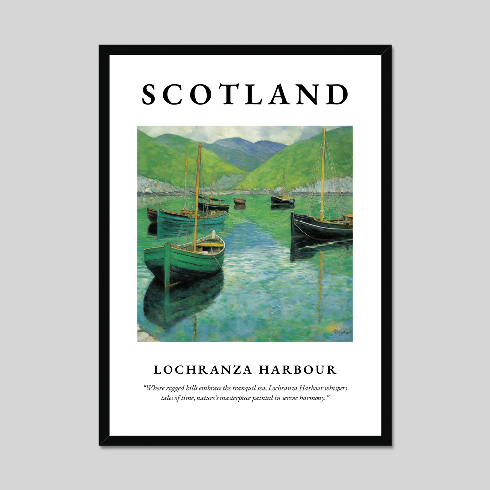 Celebrate the enchanting beauty of Scotland with our exquisite framed poster print, measuring an impressive 50cm x 70cm. This stunning piece features the majestic "SCOTLAND" emblazoned in bold letters above a captivating Art Nouveau style painting of Lochranza Harbour. Below the artwork, a poignant quote whispers, “Where rugged hills embrace the tranquil sea, Lochranza Harbour whispers tales of time, nature's masterpiece painted in serene harmony,” beautifully capturing the essence of this iconic location.