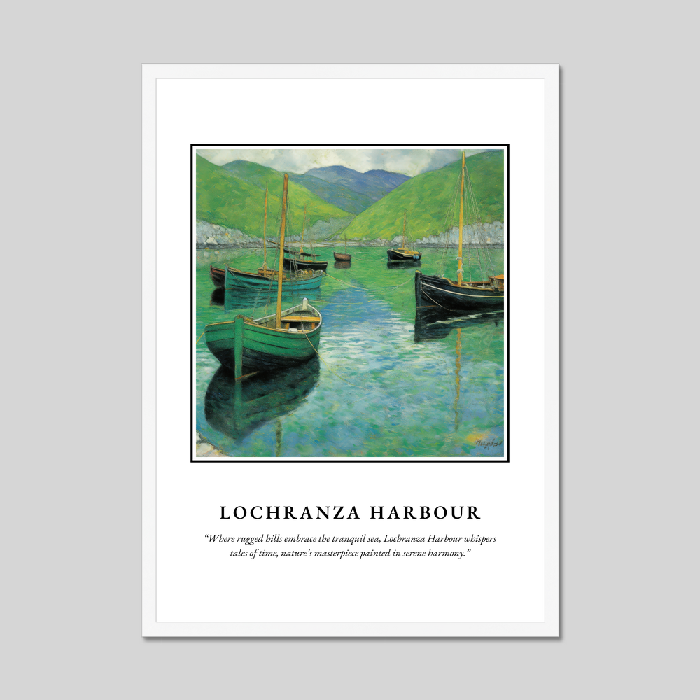 Lochranza Harbour, nestled on the Isle of Arran in Scotland, is a picturesque gem framed by dramatic landscapes. Known for its rugged hills and tranquil sea, the area is steeped in history and natural beauty. The village itself is a quiet retreat, offering sightings of native red deer and a charming distillery. This enchanting location whispers tales of time gone by, much like the art we have captured in this memorable poster.