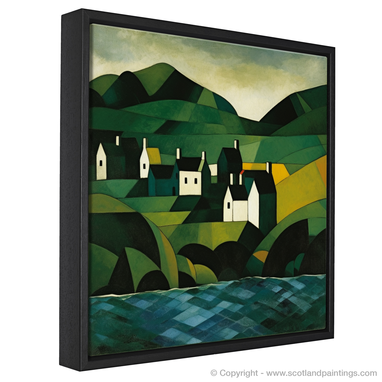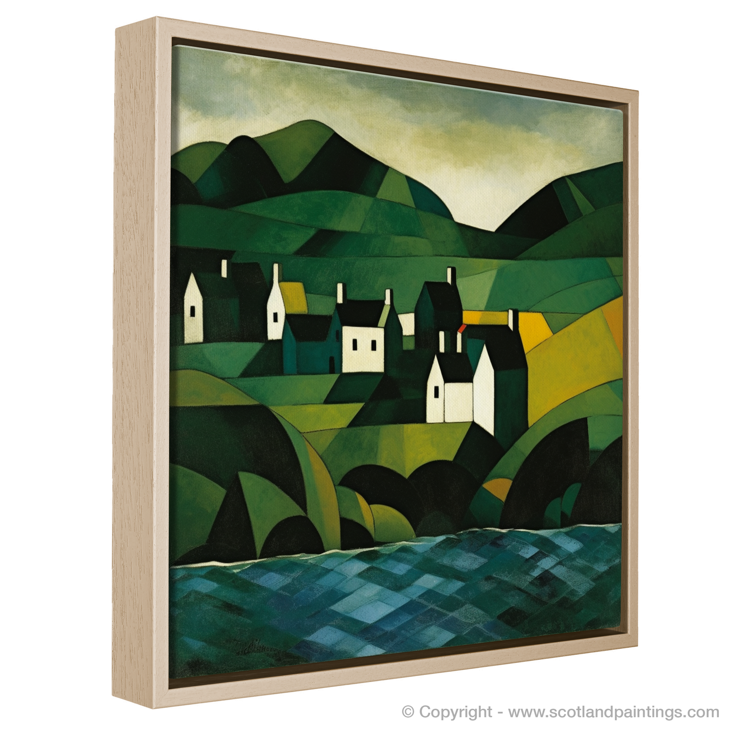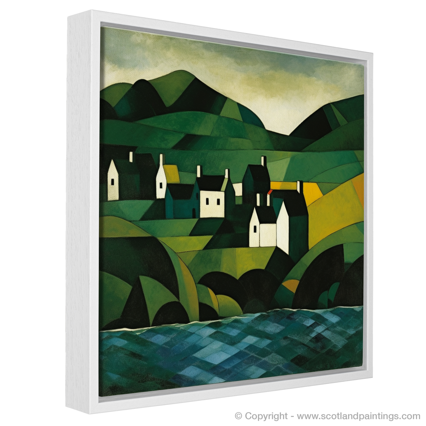 At the heart of this mesmerising piece, the quintessence of Islay's village life is distilled into minimalist structures, their quaint white façades standing stark against the variegated backdrop of verdant fields. Each home seems to whisper tales of the simple yet profound lives within, united by the timeless spirit of the island community.