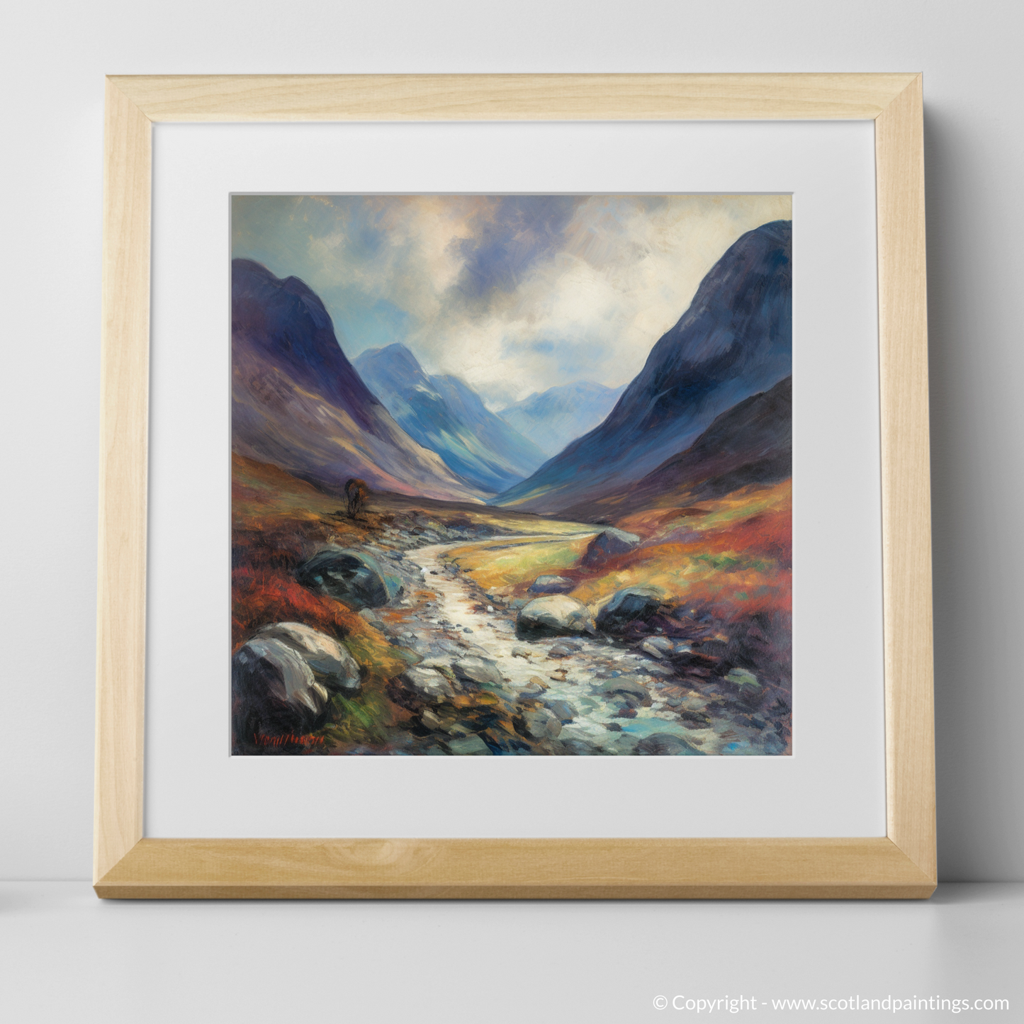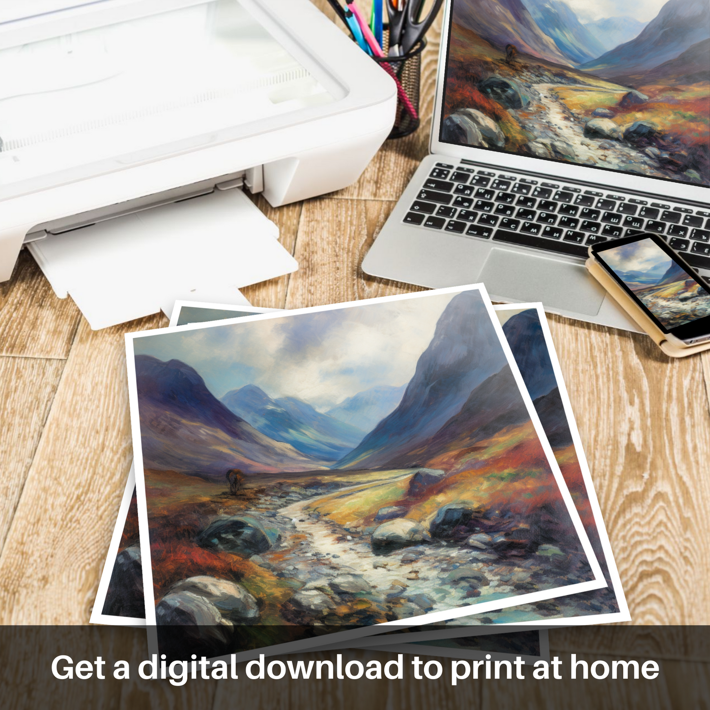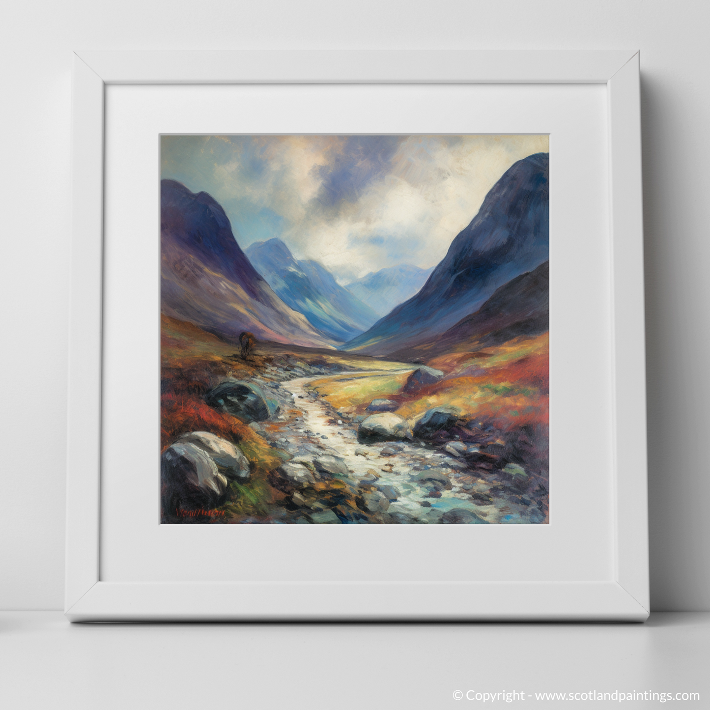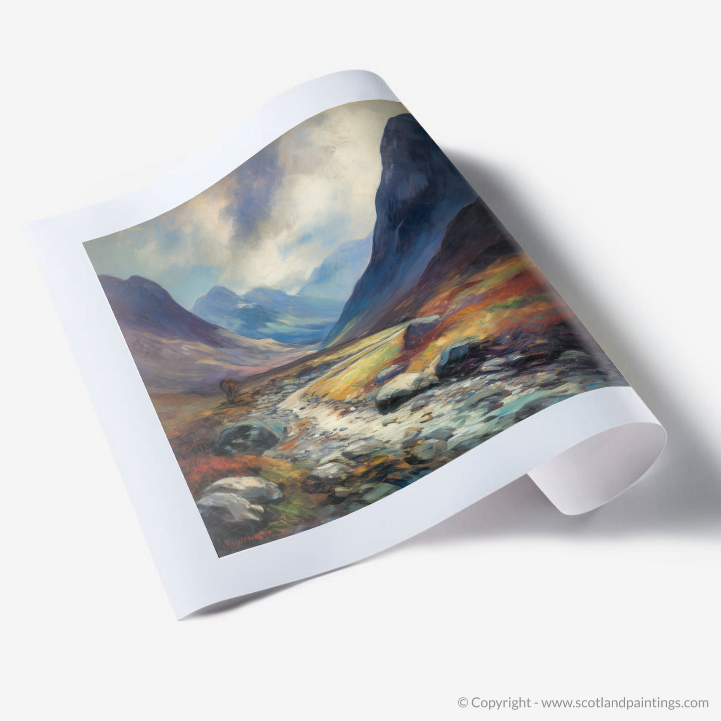 Captured through the fluid and expressive brushstrokes characteristic of the Impressionist style, this print invites you to experience the rugged beauty of Glen Coe in the Scottish Highlands. The evocative piece showcases a vivid play of light and shadow, with clouds rolling softly across the vast sky, instilling a sense of the ephemeral moments that grace these ancient landscapes.