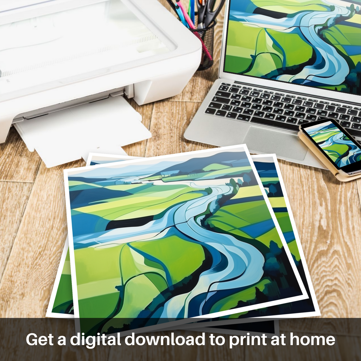 Immerse yourself in a vibrant symphony of colour with our exclusive print, steeped in the tranquil essence of the River Leven's flow through the beautiful landscapes of West Dunbartonshire. The meandering river's graceful curves and elegant turns are eloquently captured through bold strokes in a Color Field style, presenting a contemporary interpretation that's both alluring and serene.
