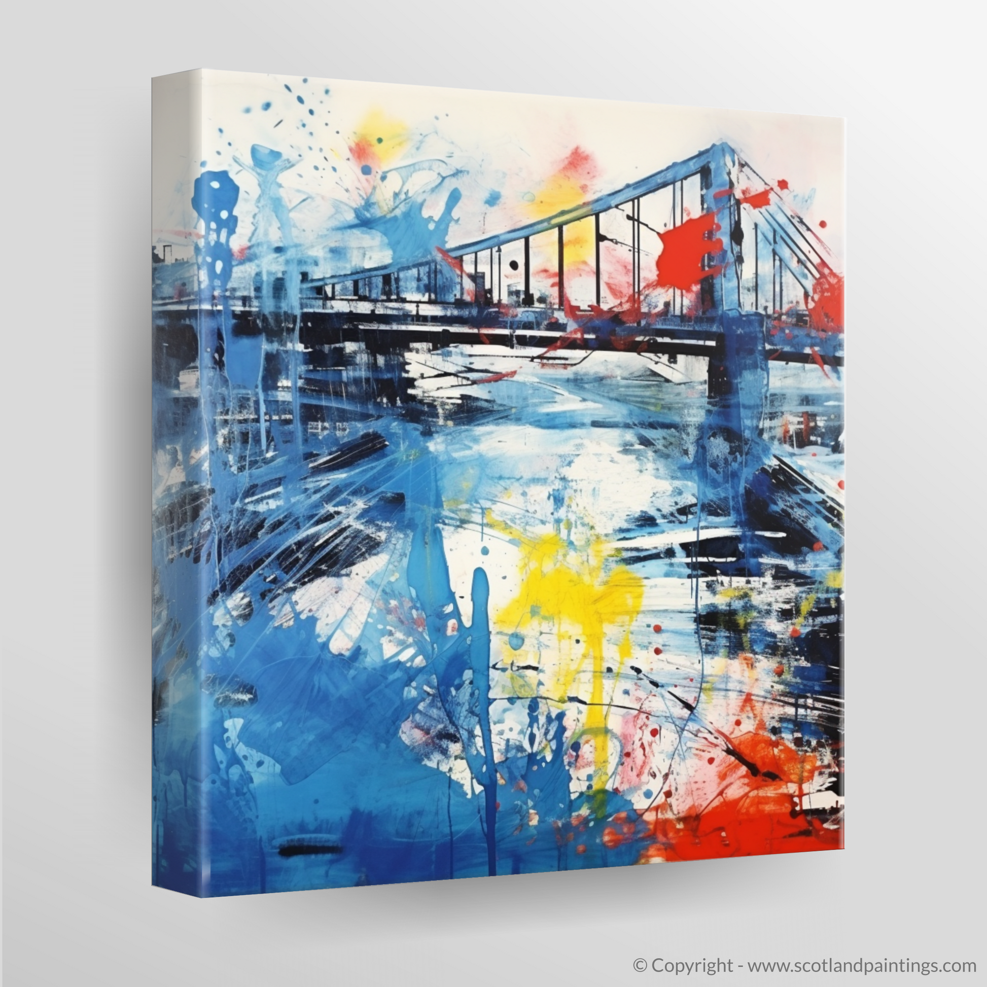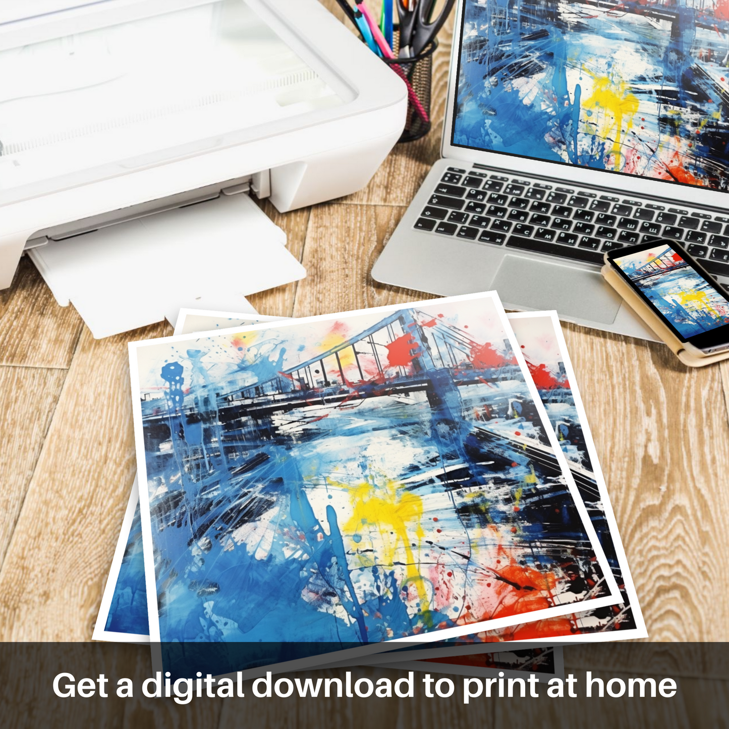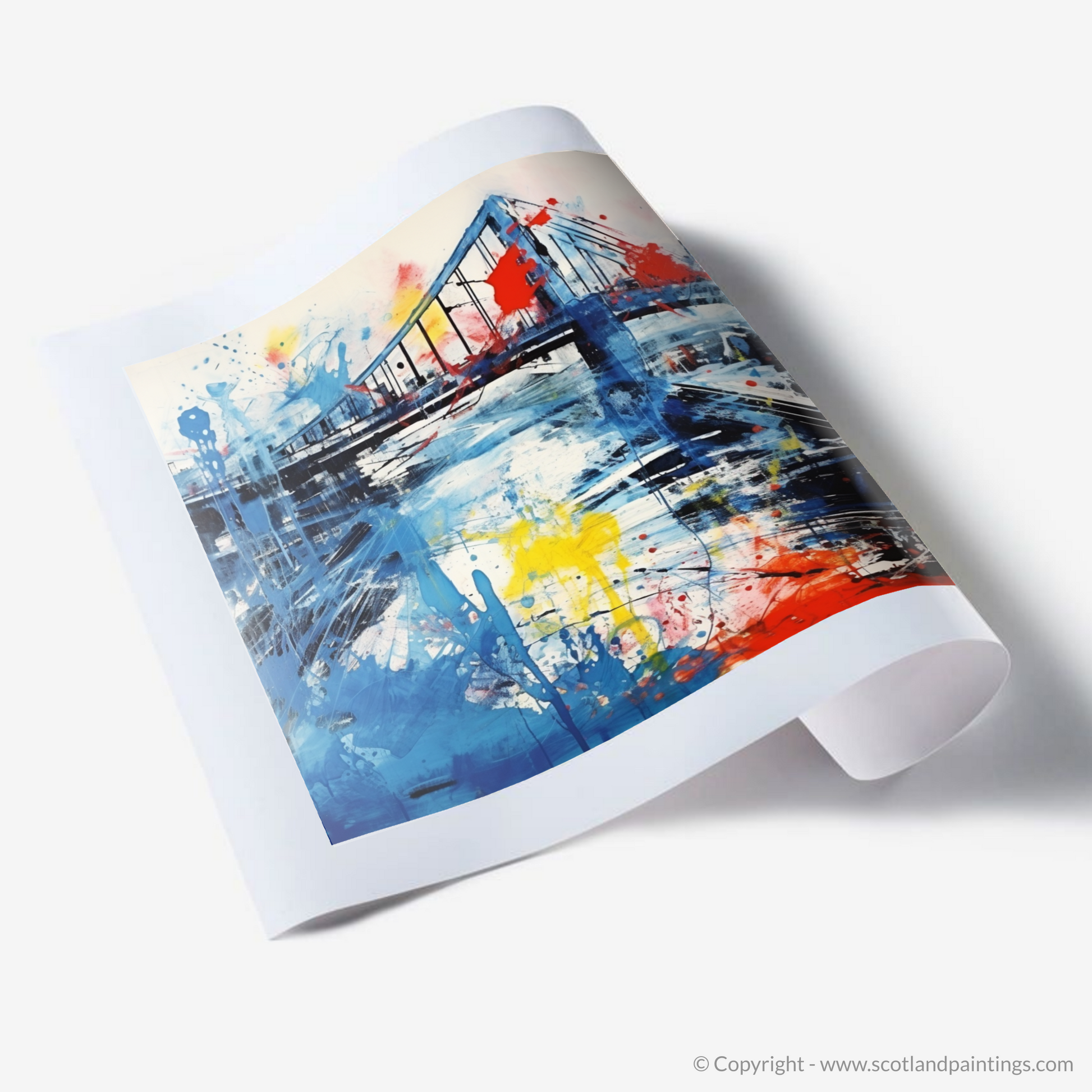 Silhouetted against this tempest of hues, the deliberate lines of a bridge anchor the composition. Though depicted in abstraction, its form is unmistakable—a tribute to the iconic structures that stride across the water's breadth, connecting communities and histories. The bridge beams stretch across the canvas, their presence outlined by the contrast of primary colours against the cool tonal backdrop, hinting at the perpetual link between man and nature.