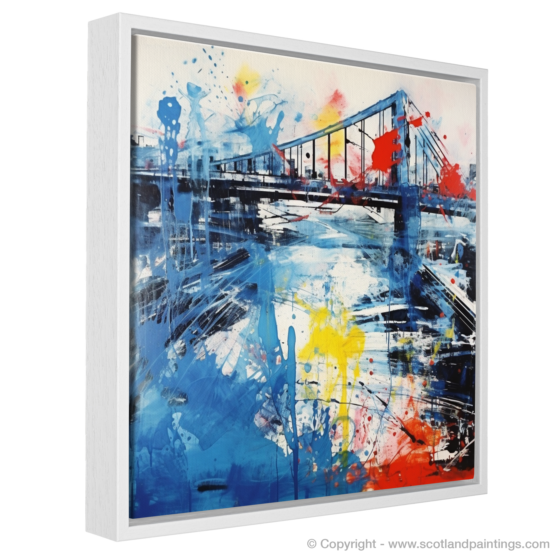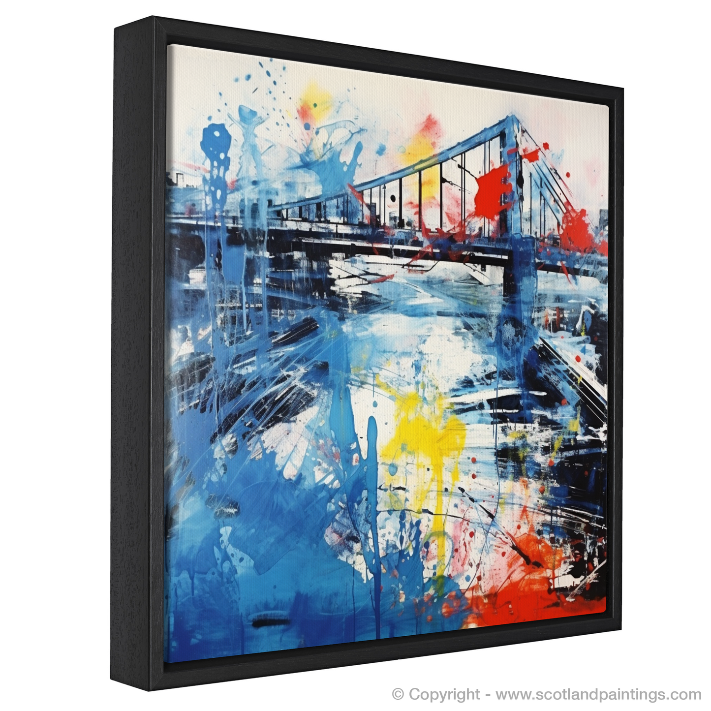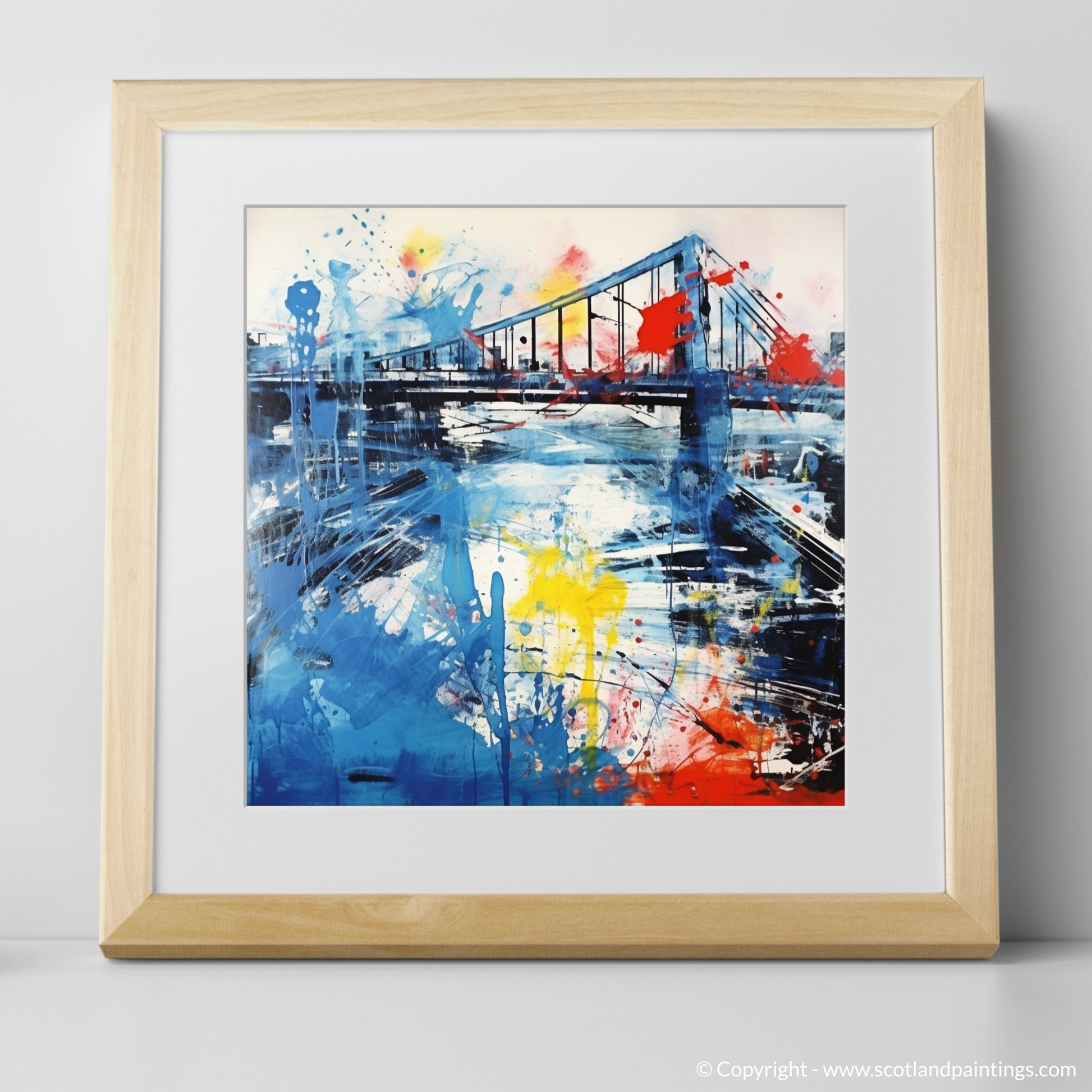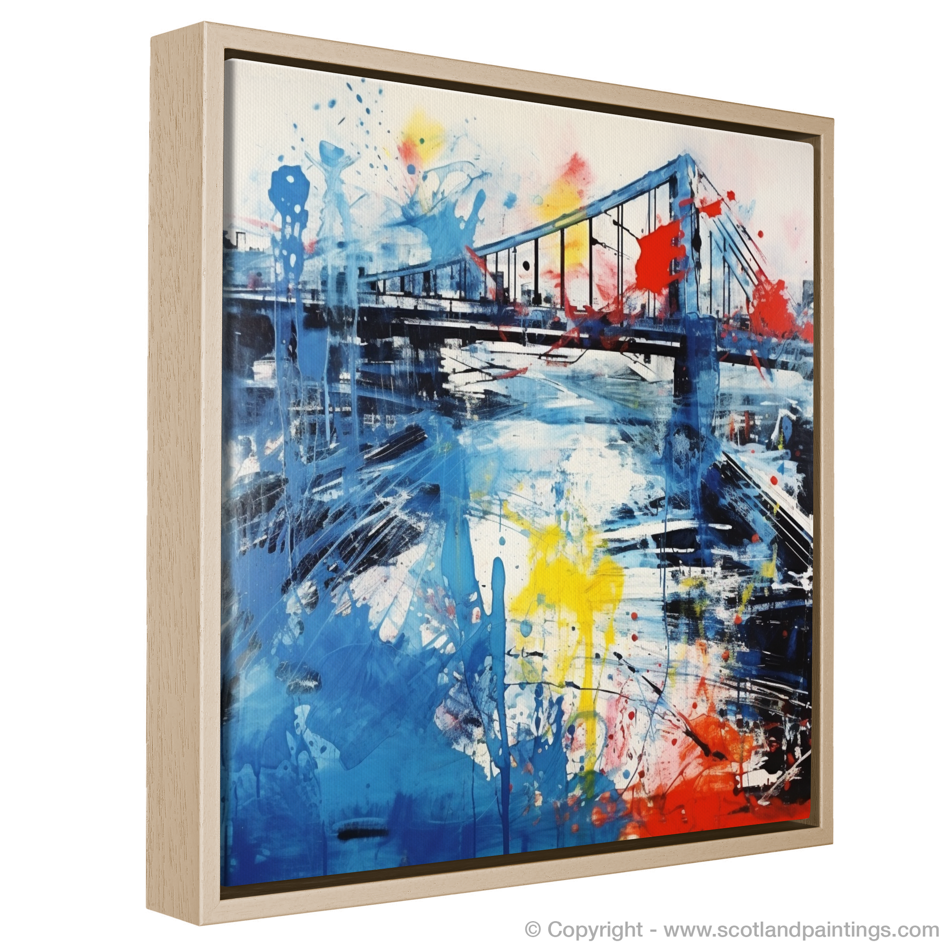 Silhouetted against this tempest of hues, the deliberate lines of a bridge anchor the composition. Though depicted in abstraction, its form is unmistakable—a tribute to the iconic structures that stride across the water's breadth, connecting communities and histories. The bridge beams stretch across the canvas, their presence outlined by the contrast of primary colours against the cool tonal backdrop, hinting at the perpetual link between man and nature.