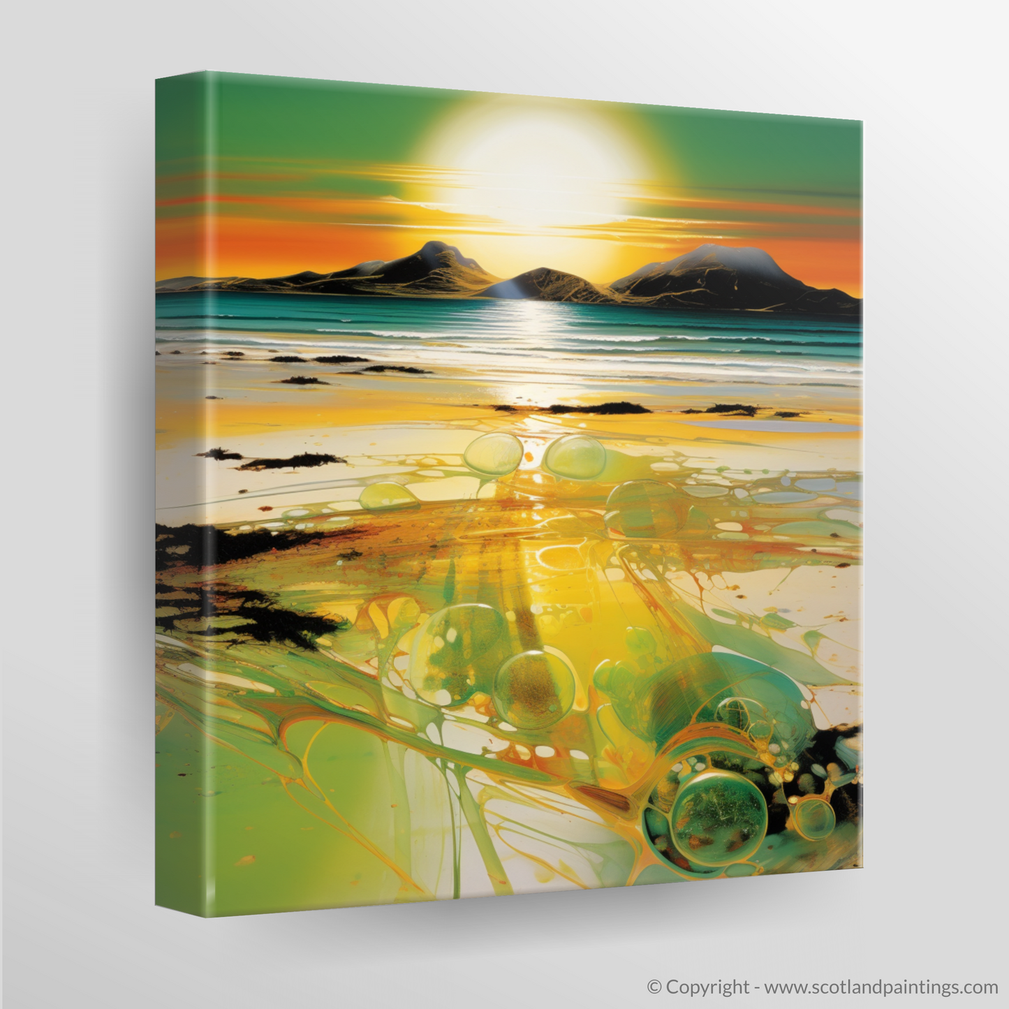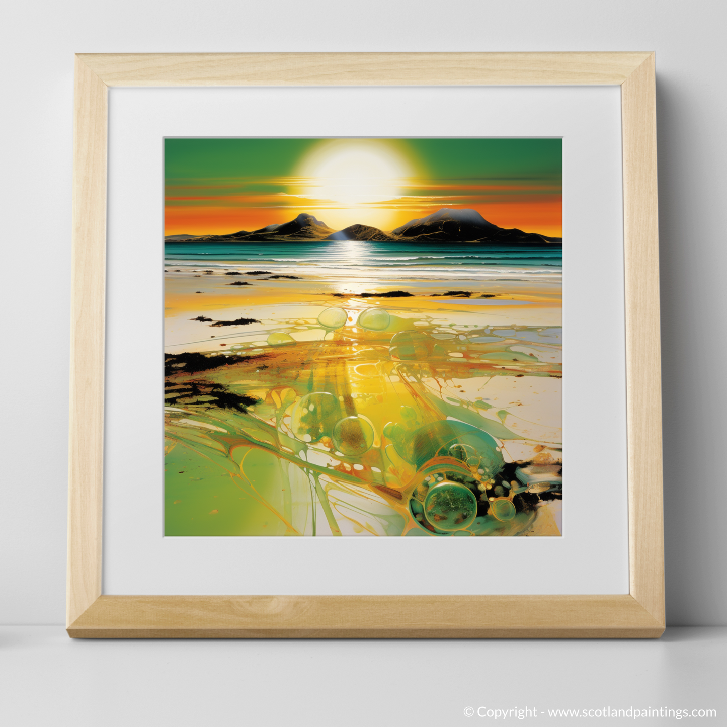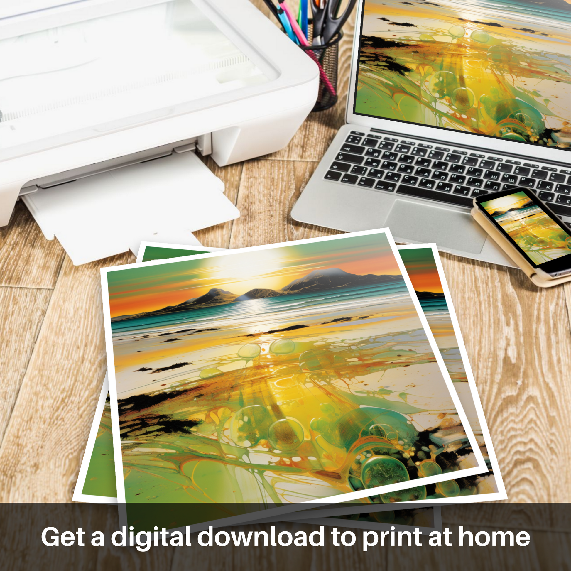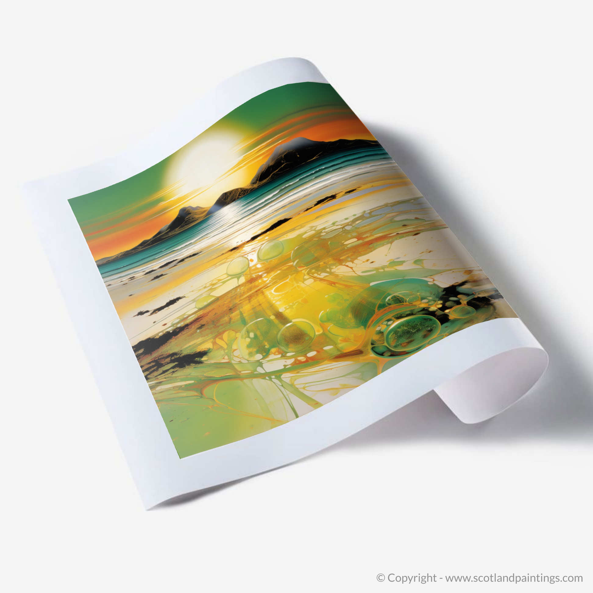 Escape into the ethereal beauty of the Scottish coastline with our captivating print, a masterpiece inspired by the entrancing Mellon Udrigle Beach at the whisper of dusk. This evocative artwork transports viewers to a realm where the ordinary bounds of nature are transcended, and imagination reigns.