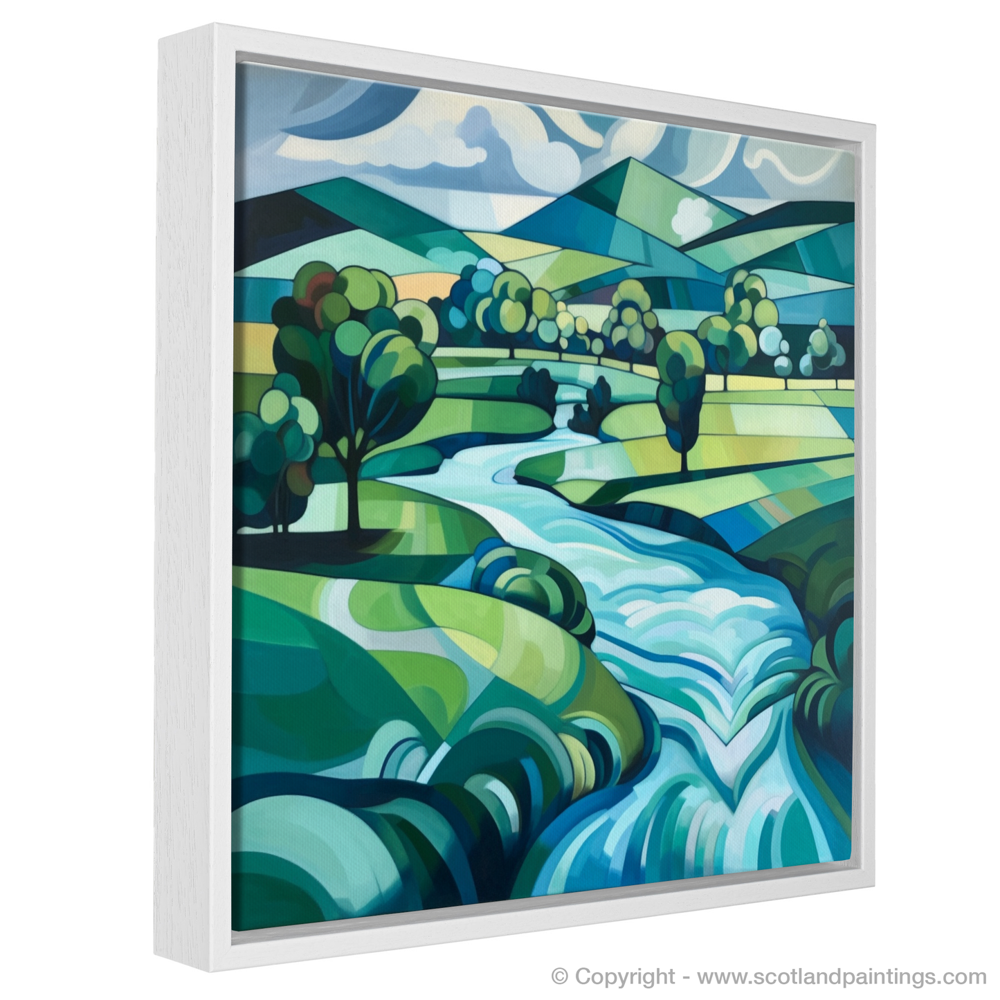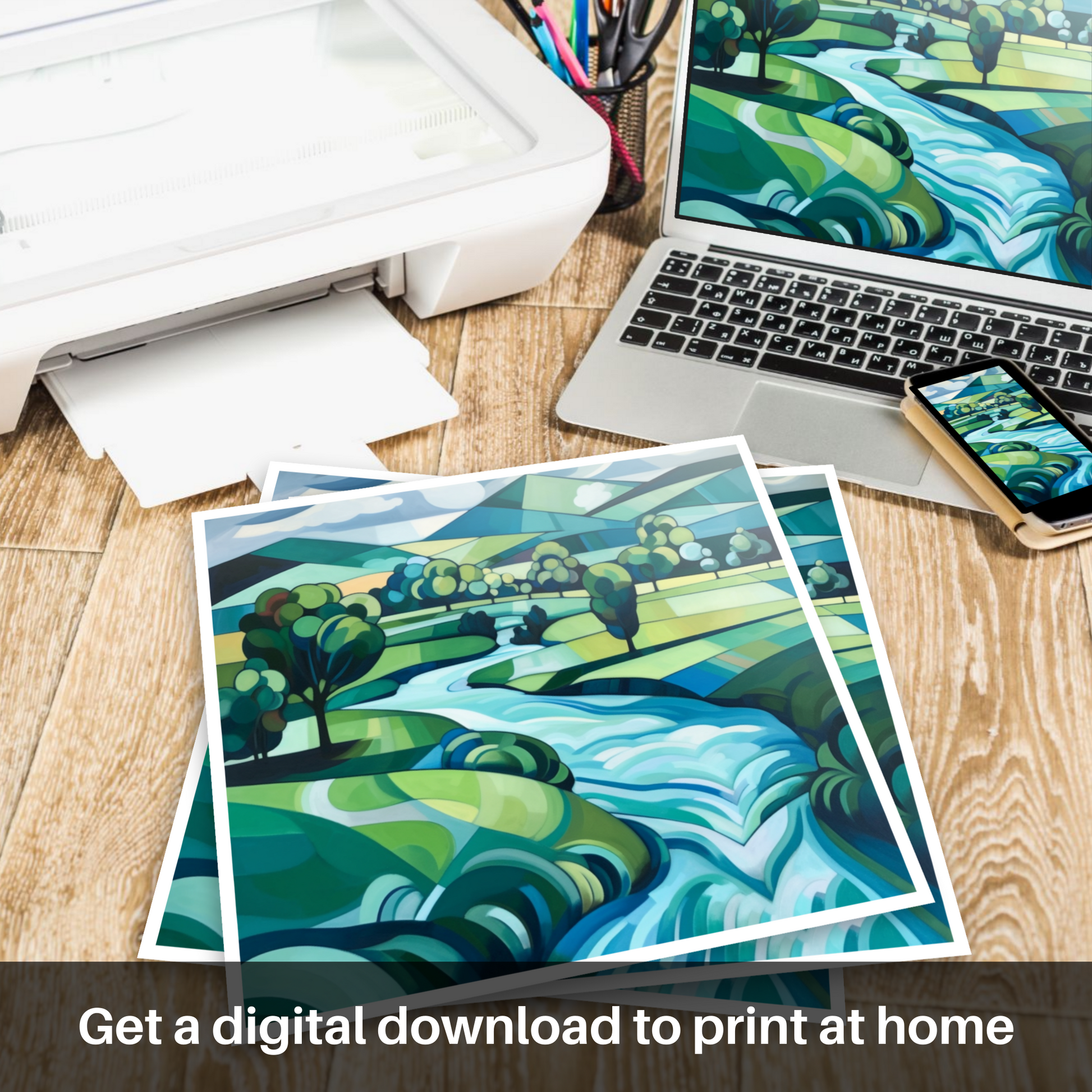 Embark on a visual journey through the enchanting landscape of the River Nith, immortalised in a captivating Cubist-inspired print. This exquisite piece transports viewers to Dumfries and Galloway through a prism of geometric splendour that fractures and reassembles the Scottish panorama into a melodic composition of shapes and colours.