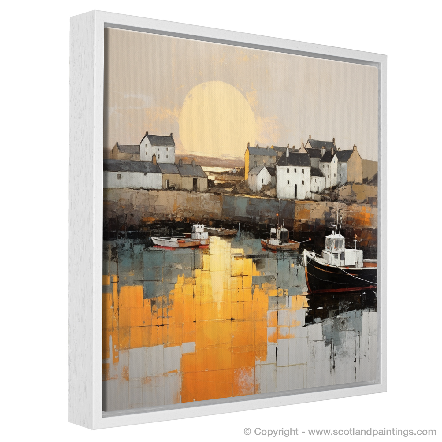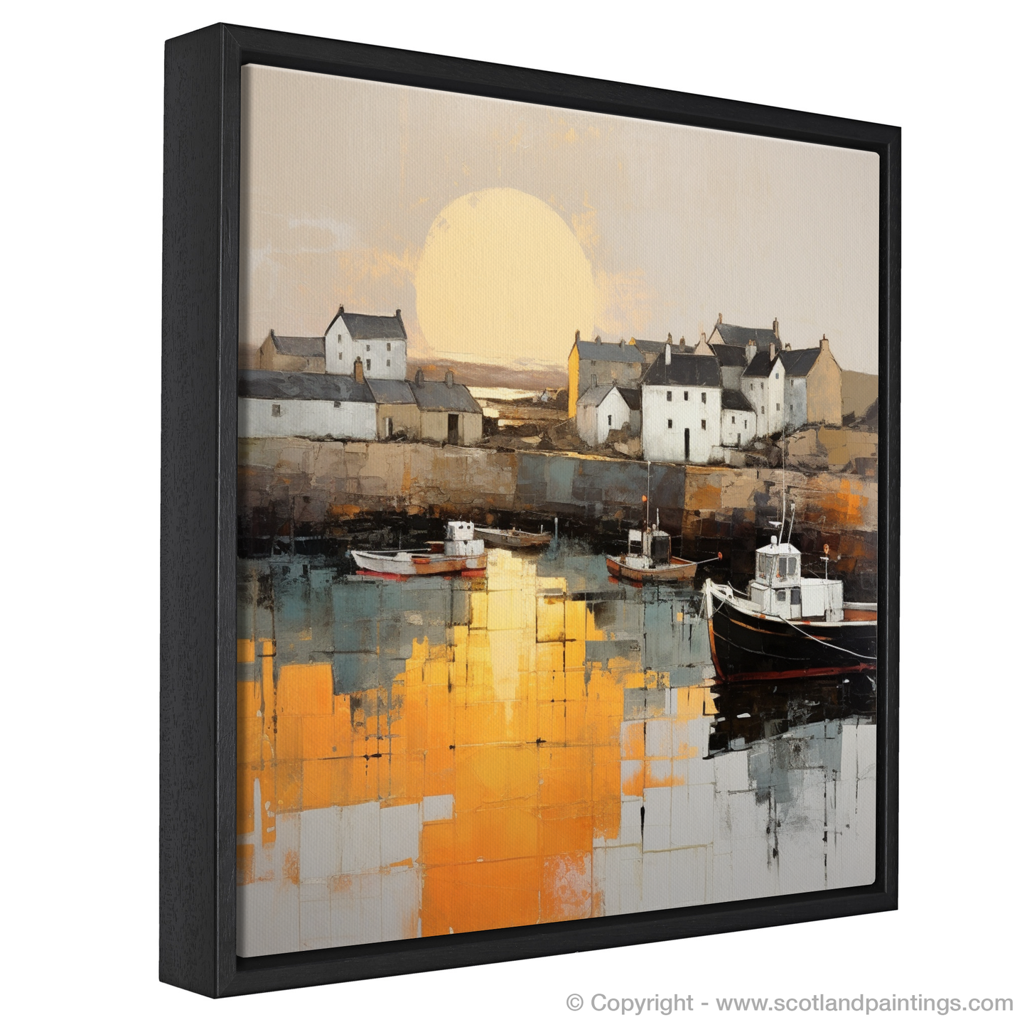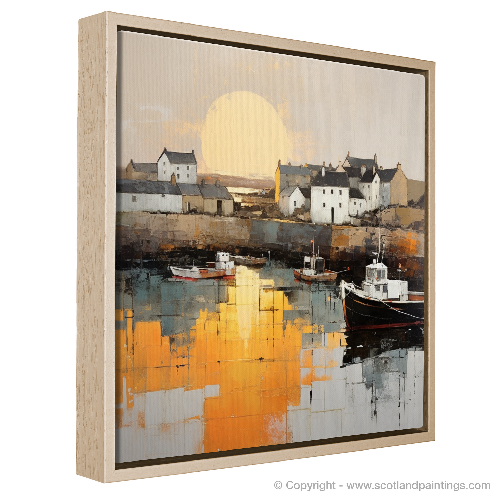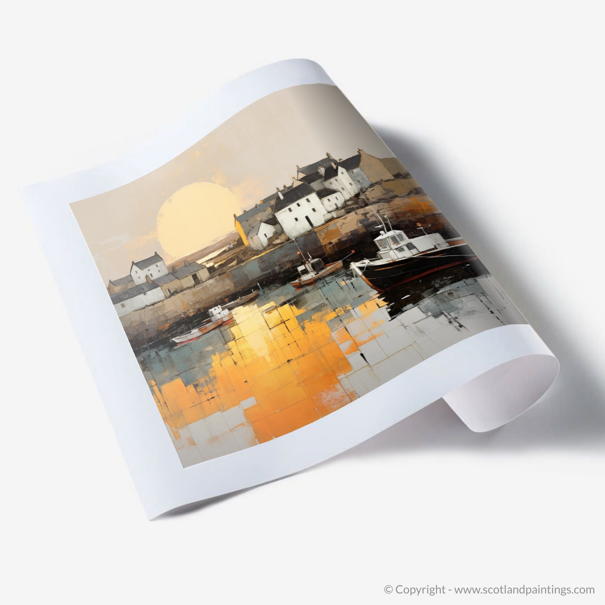 Capturing the serene beauty of Portmahomack Harbour, this evocative print invites the viewer to embrace the tranquil simplicity of a Scottish coastal gem at the day's end. Embraced by the minimalist ethos, the essence of the harbour is distilled into pure form and colour, where extraneous detail is omitted in favour of bold and emotive blocks of hues.
