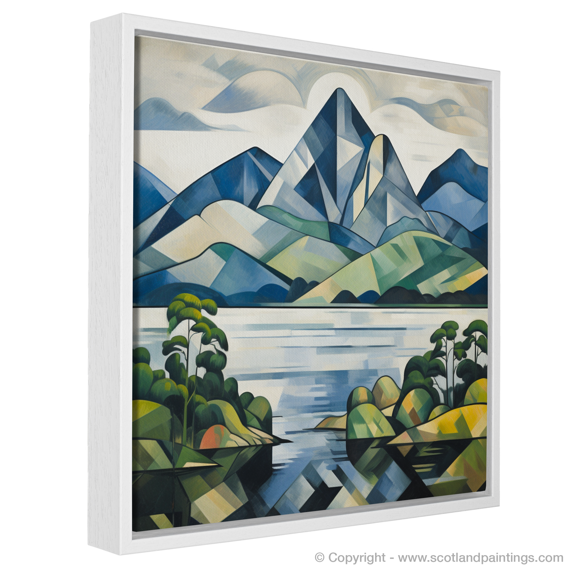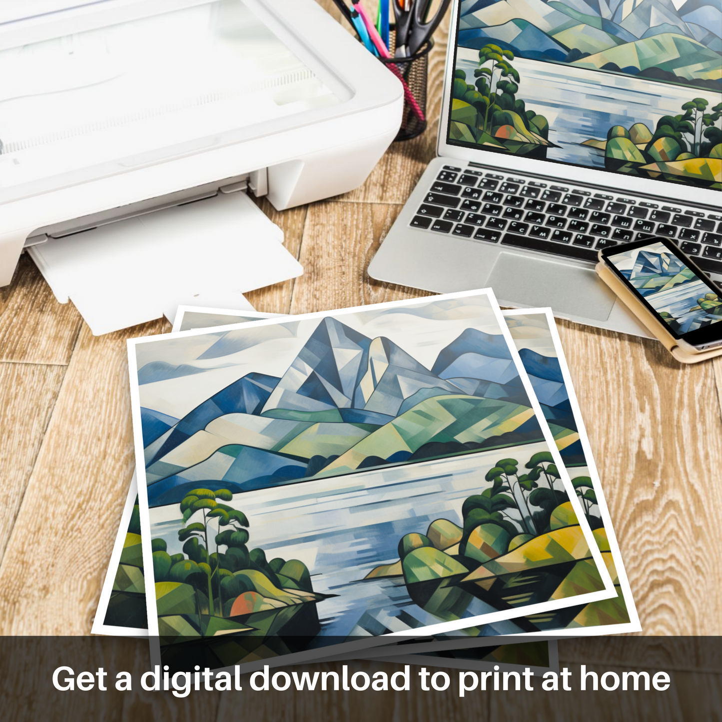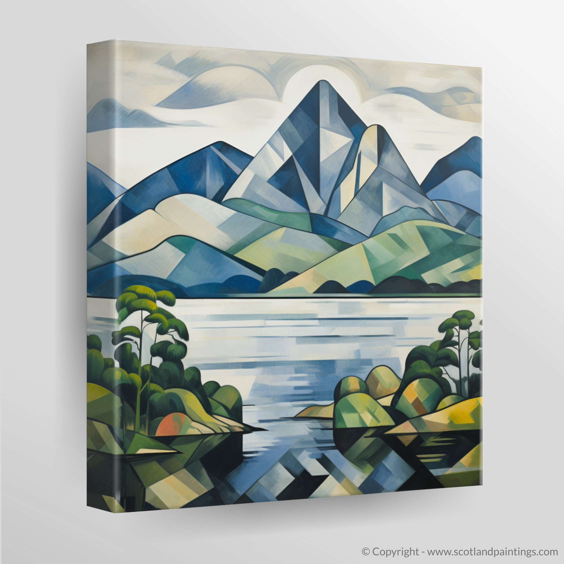 As the morning mist lifts over serene waters, this evocative print captures the majestic essence of Ben Lomond, a jewel in the Scottish Highlands. The artist has employed a cubist technique to fragment the landscape into a mosaic of geometric forms, reimagining the natural grandeur of Loch Lomond in a bold and modernist light. Viewers are invited to traverse the multifaceted planes of blue and green hues that form the mountain ranges, each peak and valley a kaleidoscope of light and shadow.
