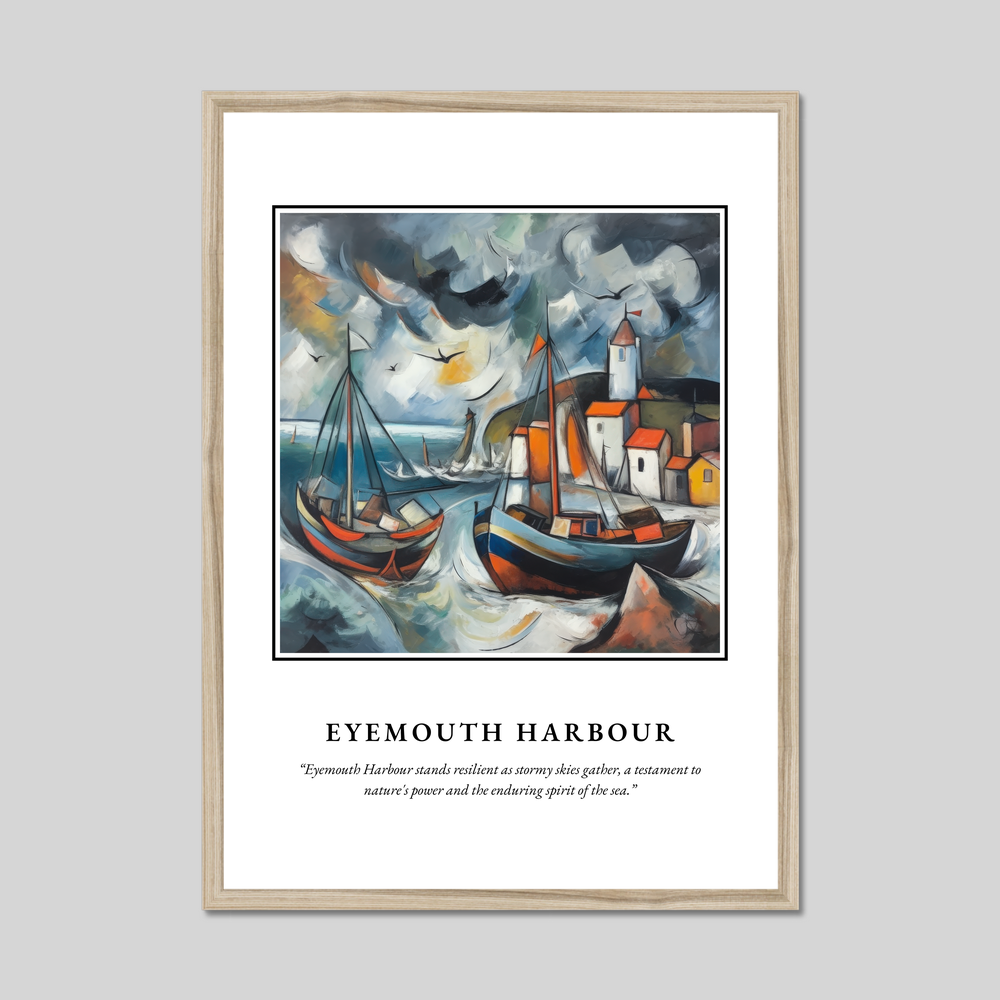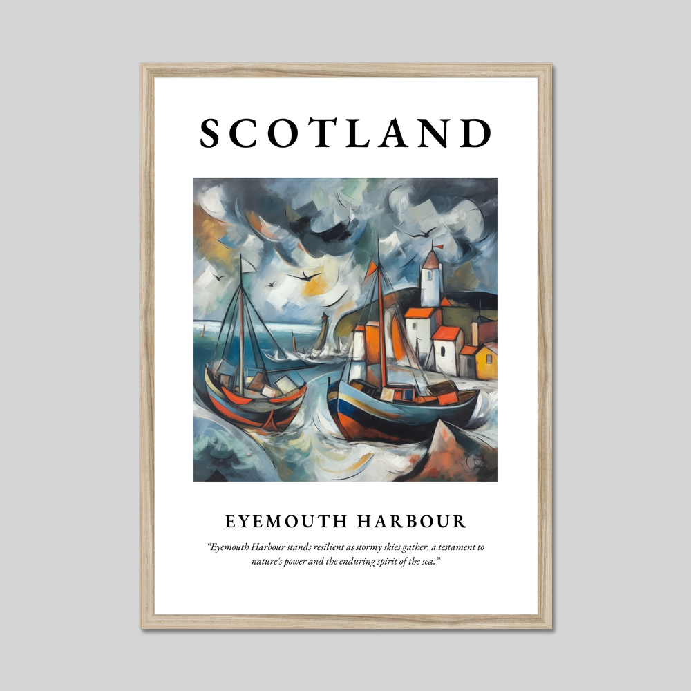 The word "SCOTLAND" boldly crowns this piece, drawing attention to the heart of the poster: a vibrant painting of Eyemouth Harbour. Rendered in an exquisite Abstract Expressionism style, the painting bursts with dynamic energy and emotion. Sweeping brushstrokes and bold colours depict the harbour’s boats resiliently riding the stormy seas, echoing the quote beneath: “Eyemouth Harbour stands resilient as stormy skies gather, a testament to nature's power and the enduring spirit of the sea.” This artwork is perfect for art lovers who appreciate the raw beauty and emotional depth synonymous with Abstract Expressionism.