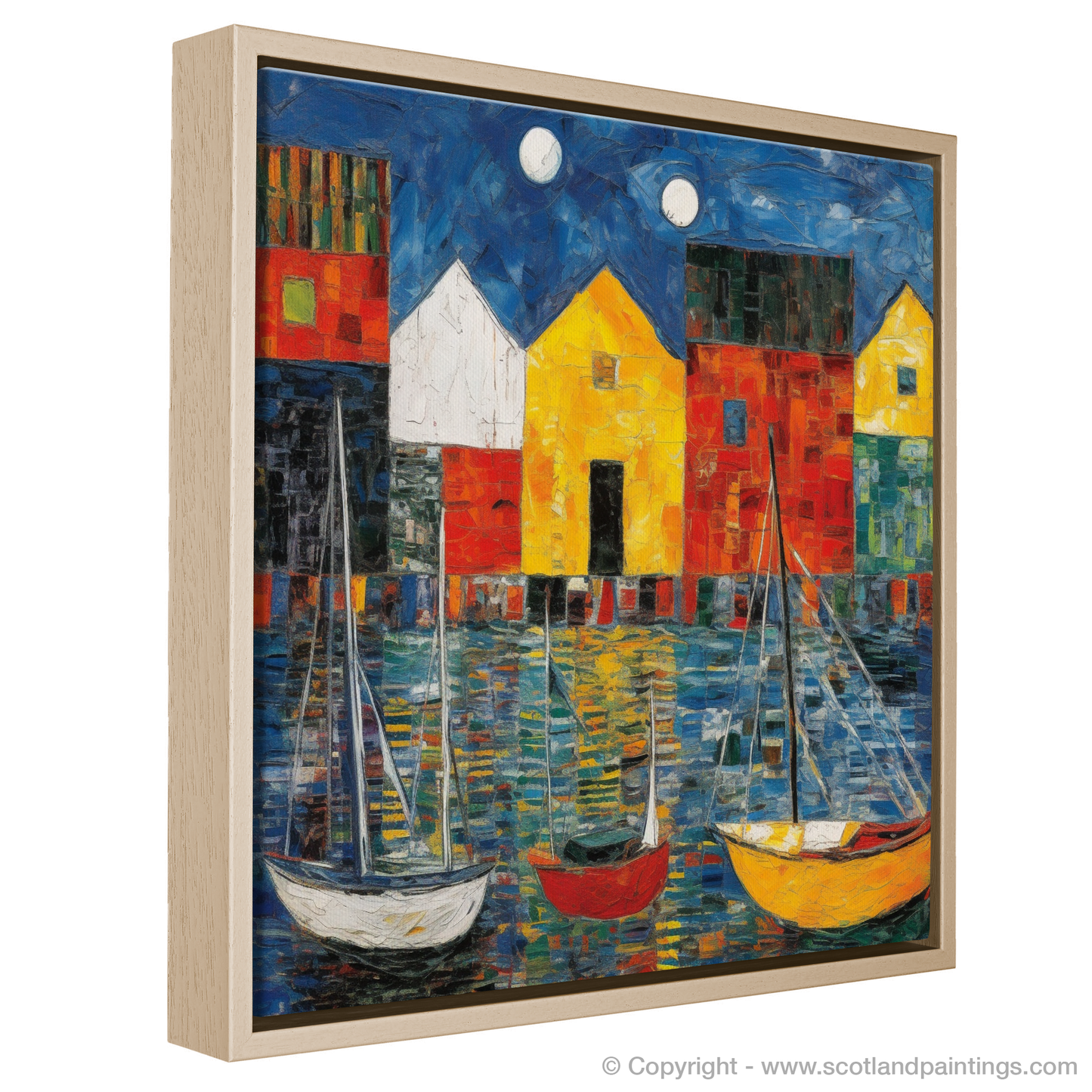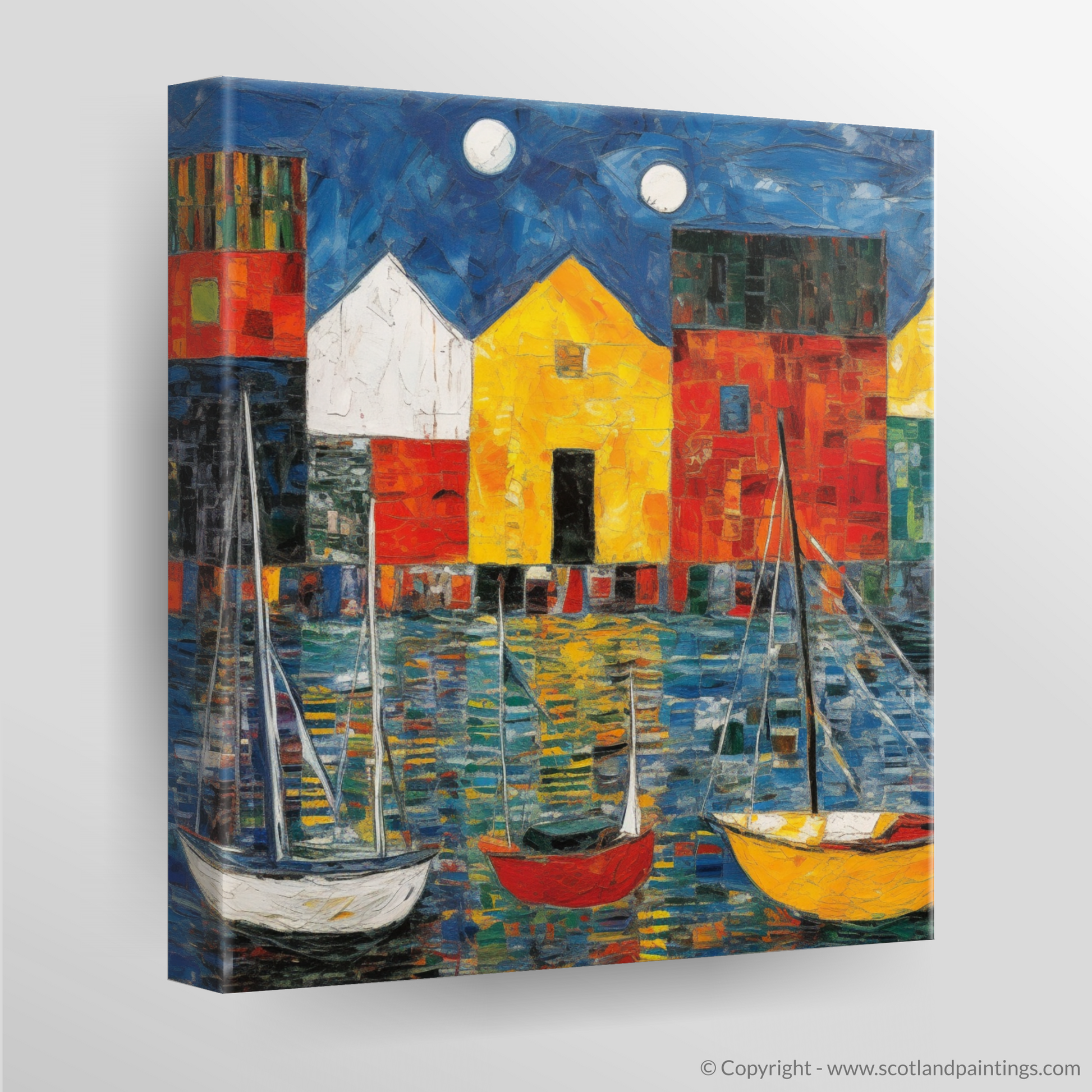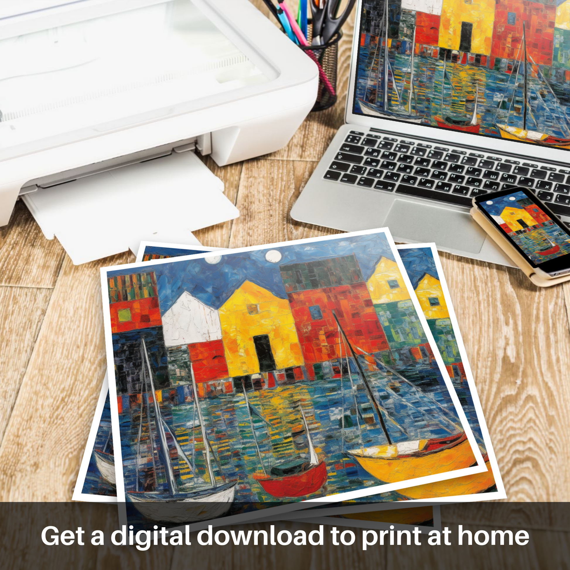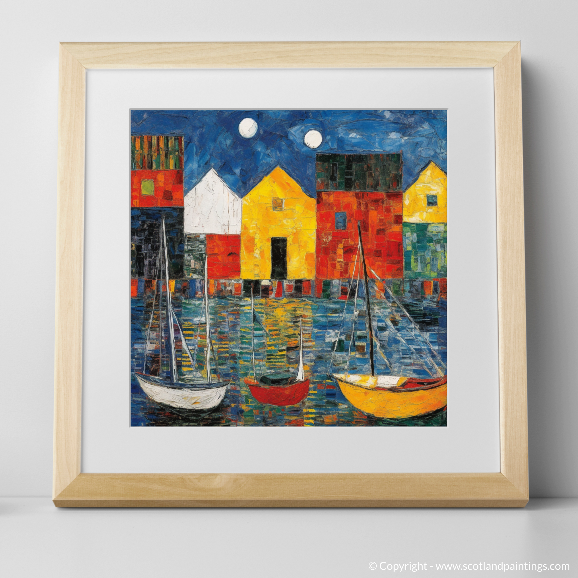 Immerse yourself in a vivid tableau of Catterline Bay, captured through the lens of Pop Art. Bold splashes of primary colours dominate the piece, while geometric shapes piece together a quaint coastal scene reminiscent of a Scottish Cove. This print presents an array of whimsical cottages lining the waterfront, their reflections dancing across the ripples of the sea in a kaleidoscope of colours.