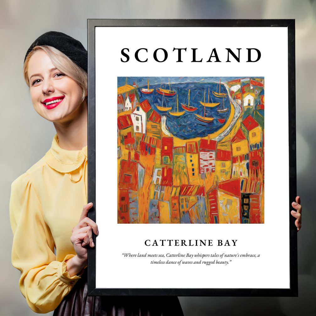 Above the painting, "SCOTLAND" stands tall in big, bold lettering, a proud proclamation of the land we love. Beneath it, the eloquent quote, “Where land meets sea, Catterline Bay whispers tales of nature's embrace, a timeless dance of waves and rugged beauty,” serves as a poetic invitation to immerse oneself in the serenity and splendour of the Scottish coast.