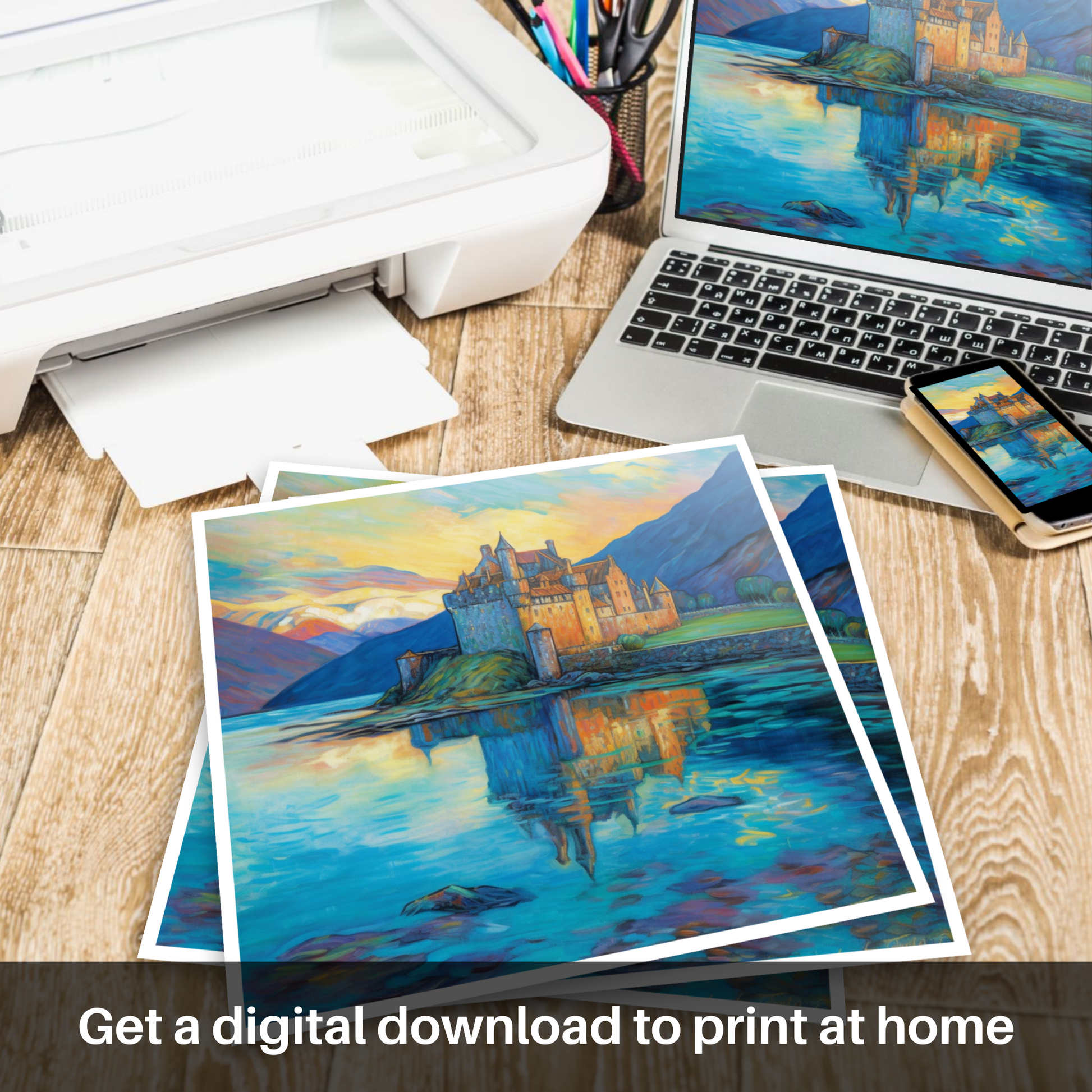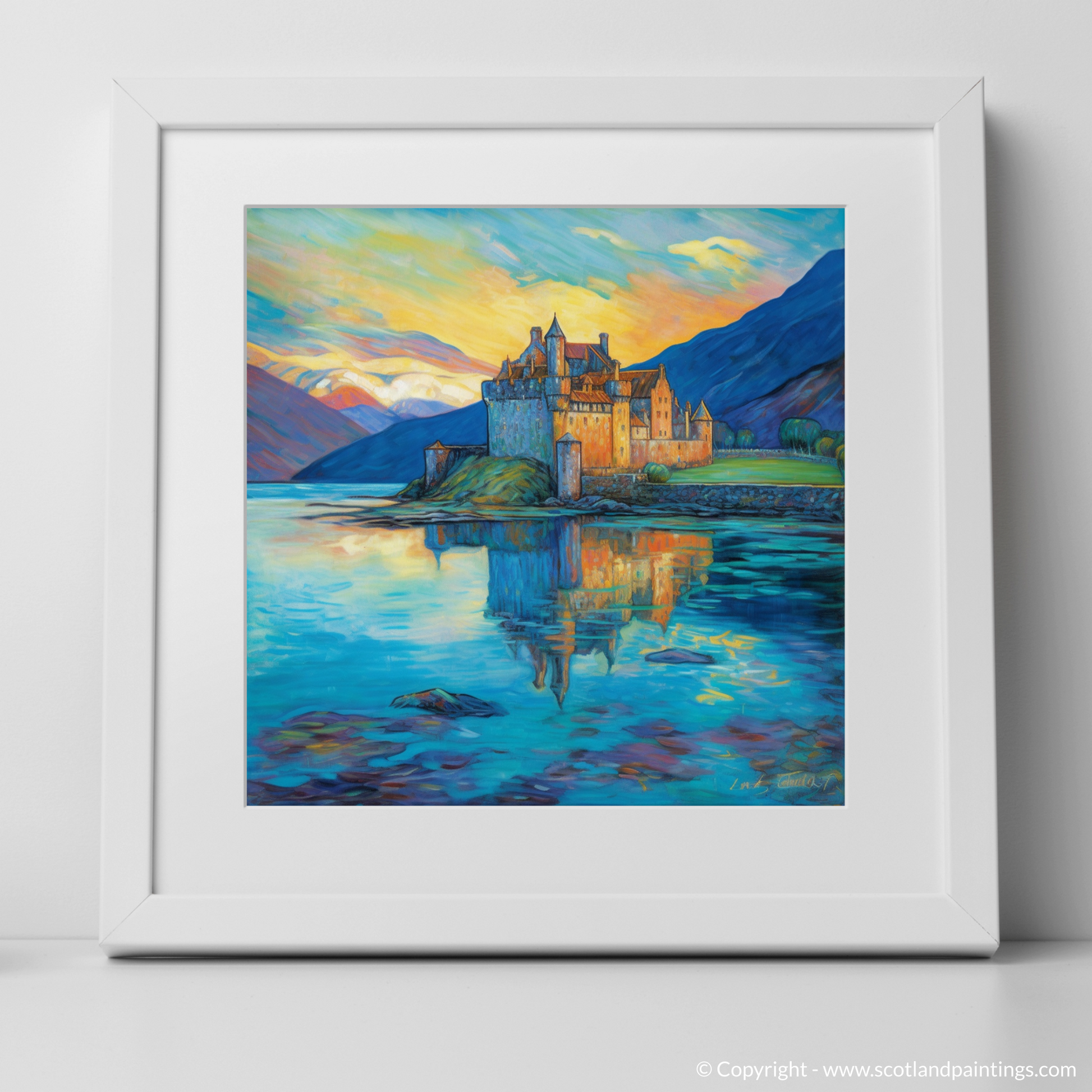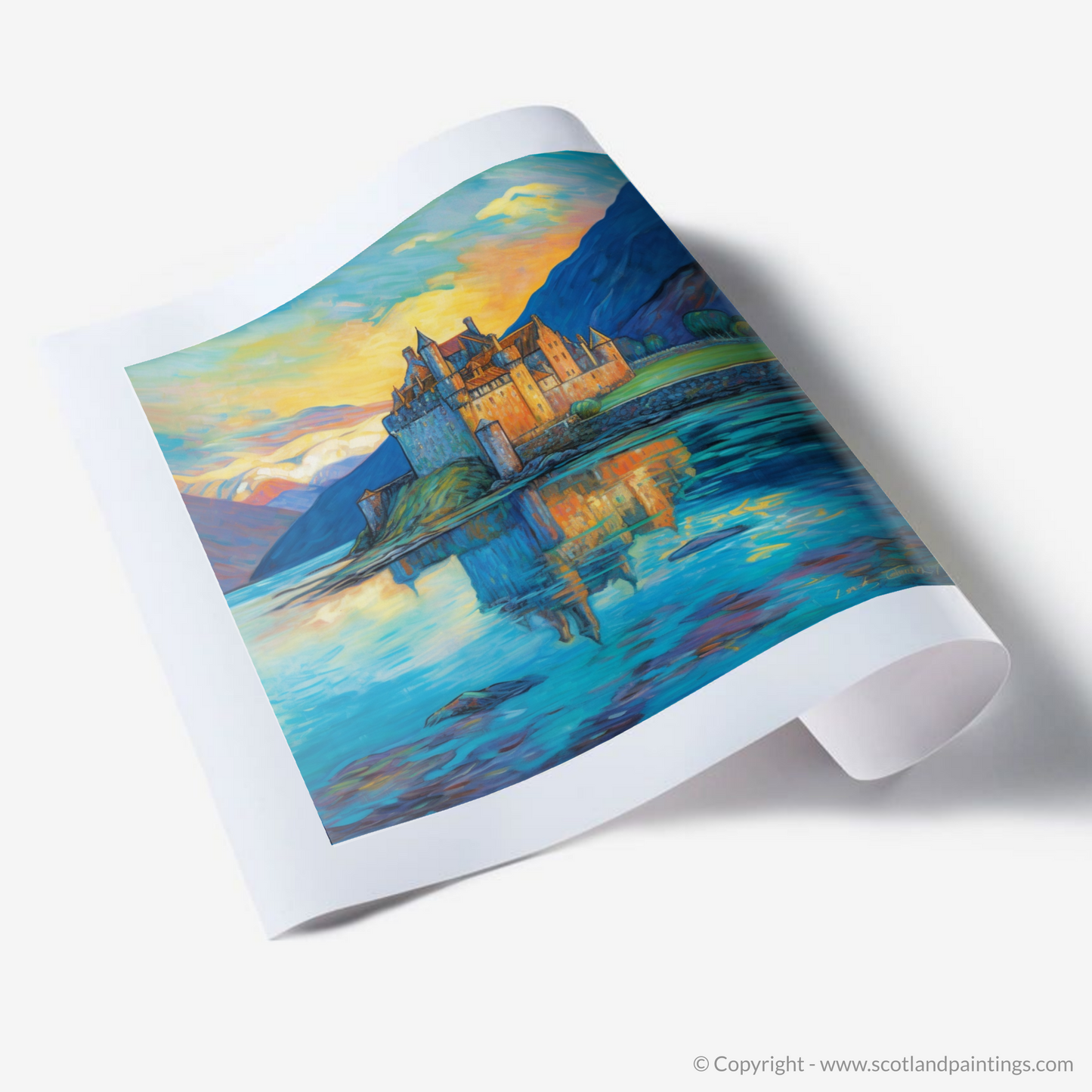 The castle is illustrated with intricate detailing and a rich palette of oranges and blues that reflect the vibrant hues of a sunset sky. As the day's last light sets the heavens aflame, the warm tones bathe the castle's historic walls in a radiant glow, while the cool blues of the tranquil Loch Duich cradle its reflection in a serene embrace.