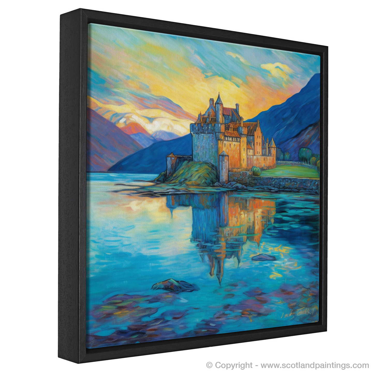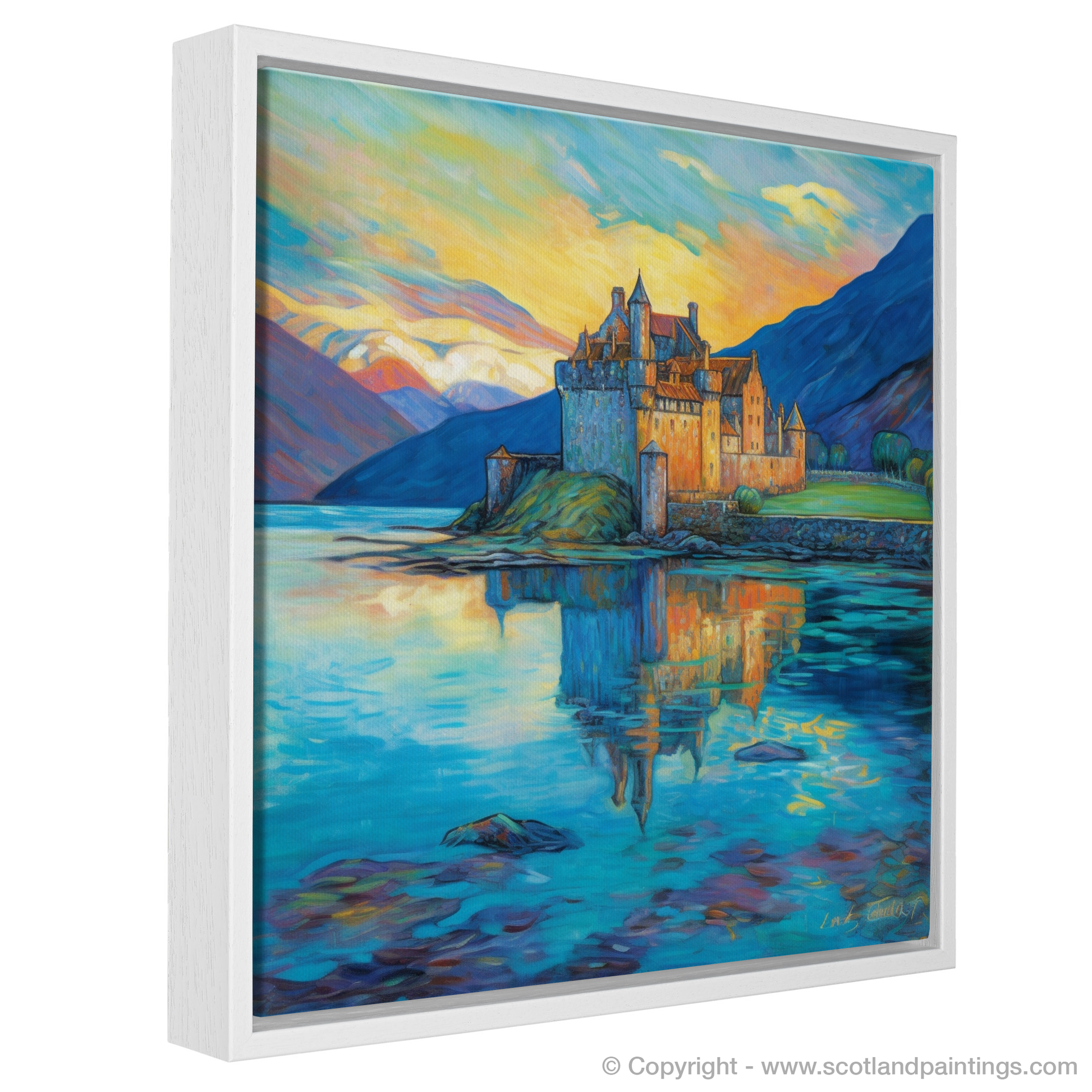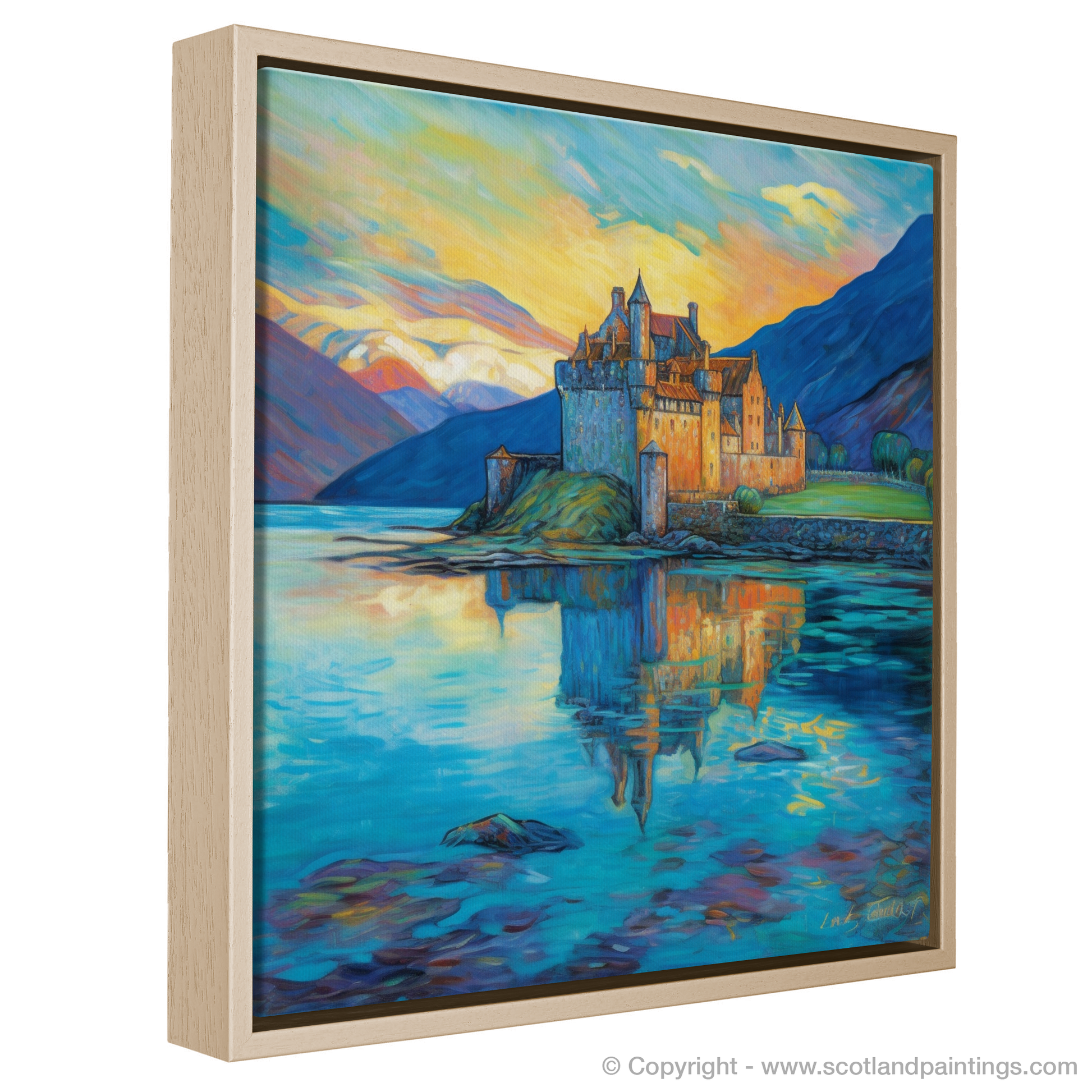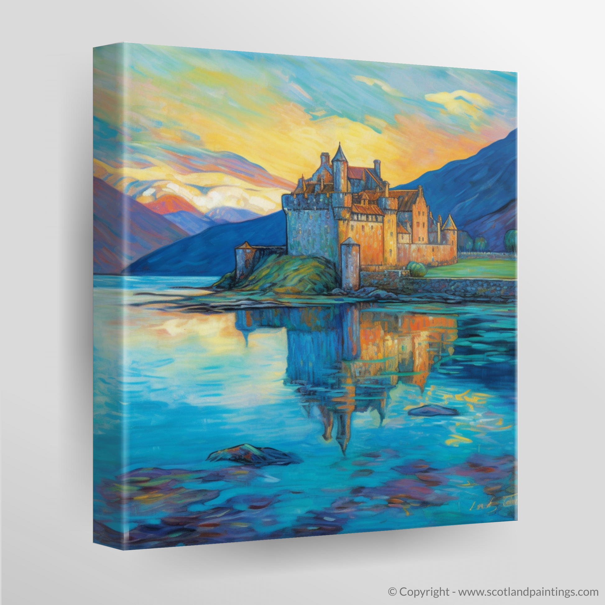 The castle is illustrated with intricate detailing and a rich palette of oranges and blues that reflect the vibrant hues of a sunset sky. As the day's last light sets the heavens aflame, the warm tones bathe the castle's historic walls in a radiant glow, while the cool blues of the tranquil Loch Duich cradle its reflection in a serene embrace.